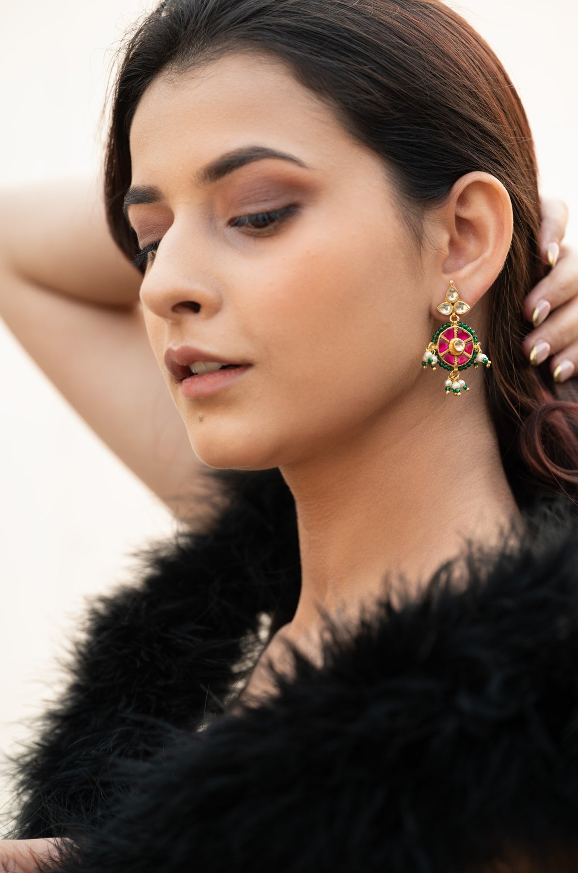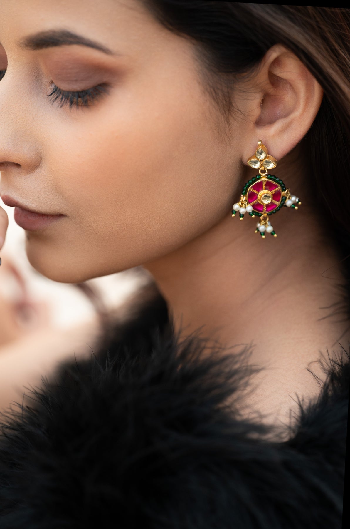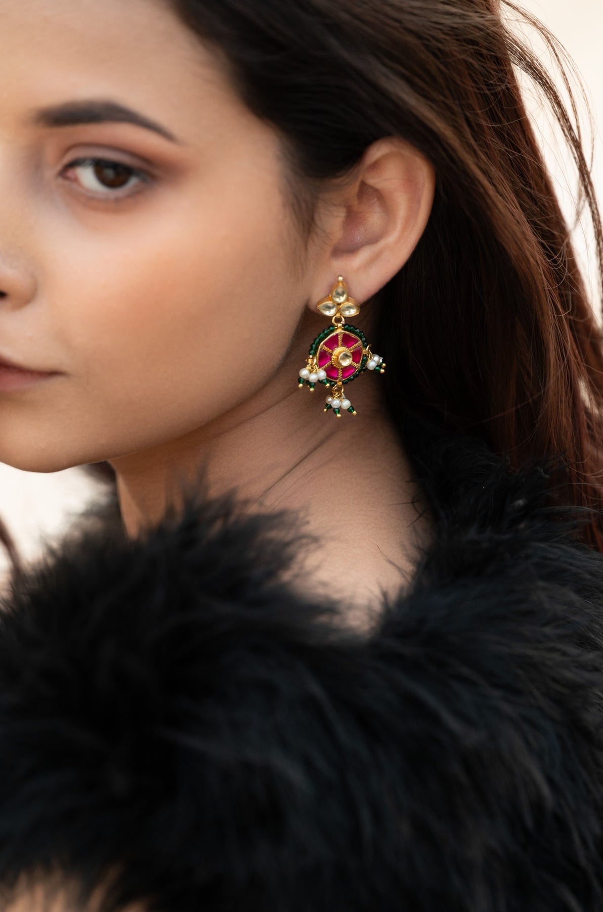 Indulge in pure luxury with these lavish Aven earrings. The intricate kundan top exudes an irresistible allure, adorned with kundan and pearl hangings. Accented by a captivating rich red hue onyx, the delicate pearl and green onyx hangings add an air of refinement to any ensemble. Elevate your fashion game and embody sophistication with these exclusive earrings.
