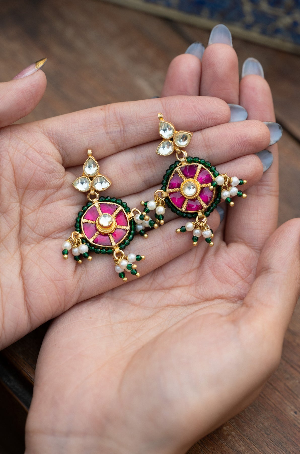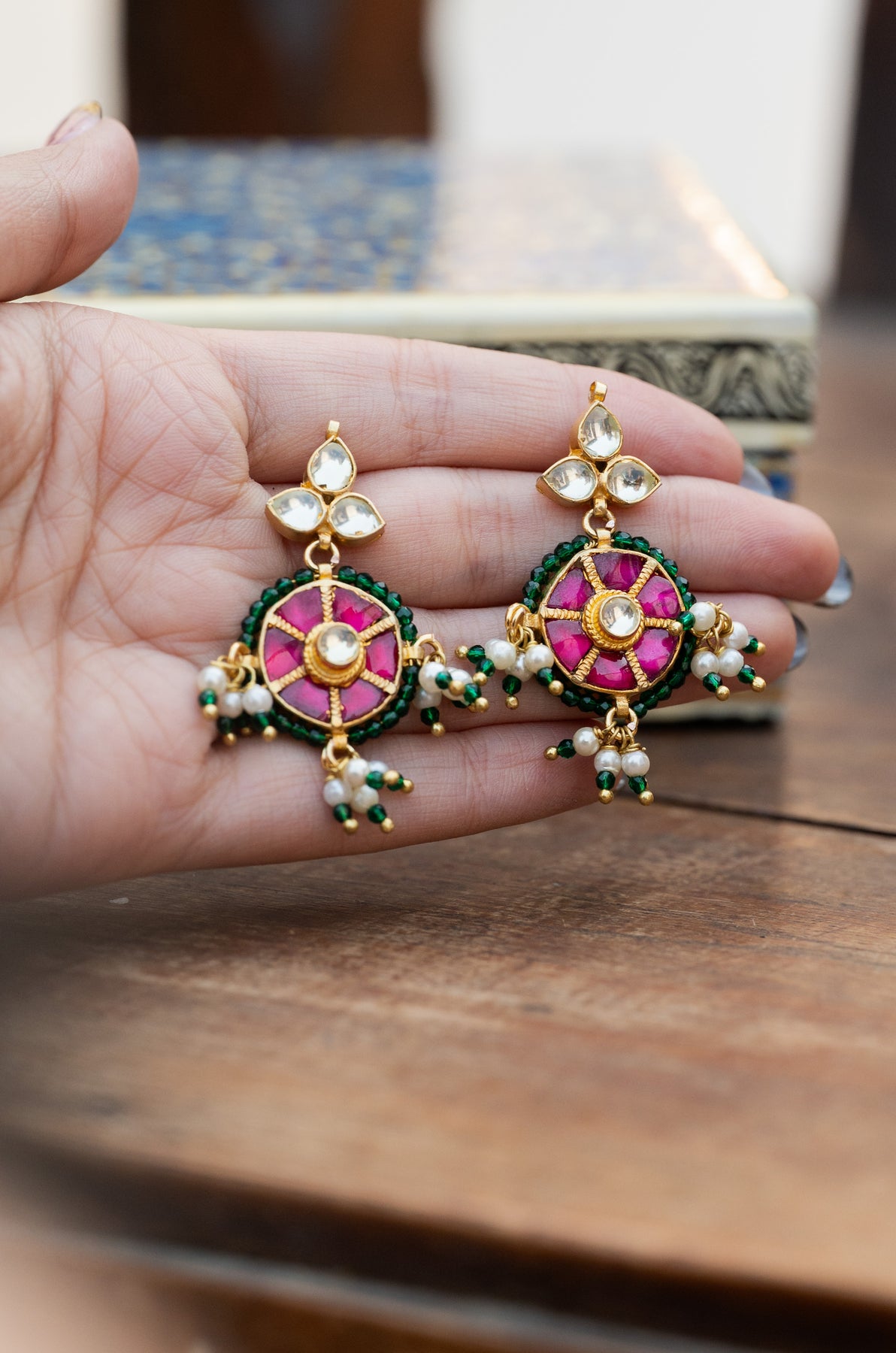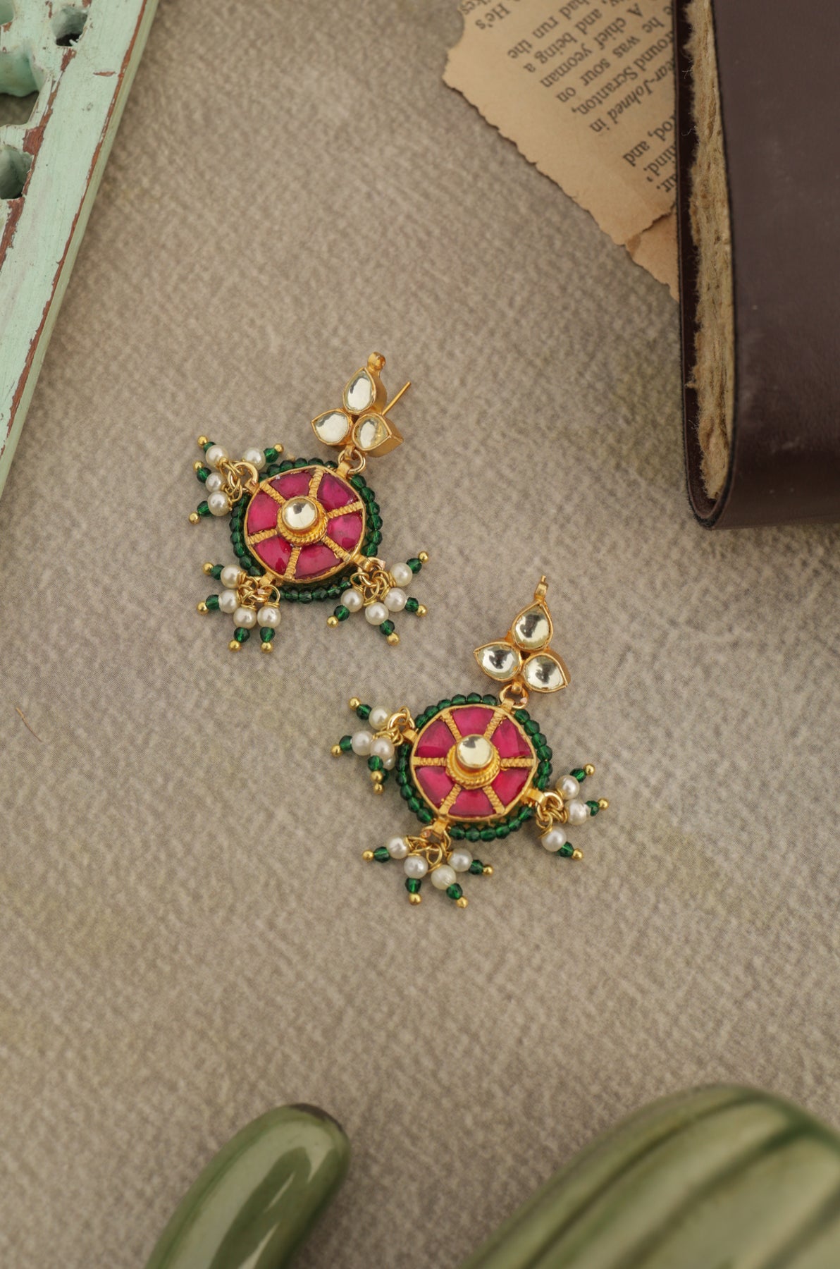 Indulge in pure luxury with these lavish Aven earrings. The intricate kundan top exudes an irresistible allure, adorned with kundan and pearl hangings. Accented by a captivating rich red hue onyx, the delicate pearl and green onyx hangings add an air of refinement to any ensemble. Elevate your fashion game and embody sophistication with these exclusive earrings.