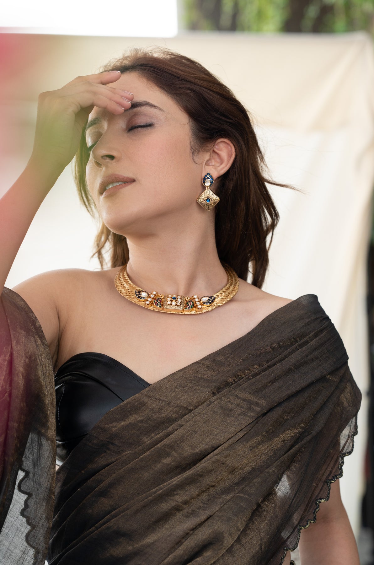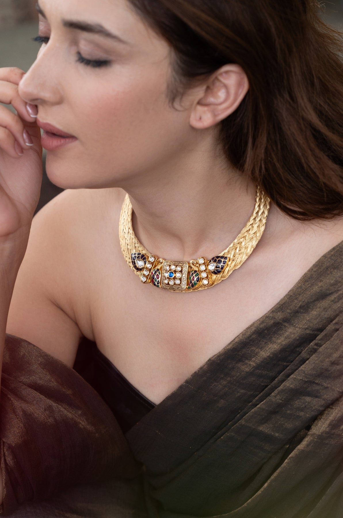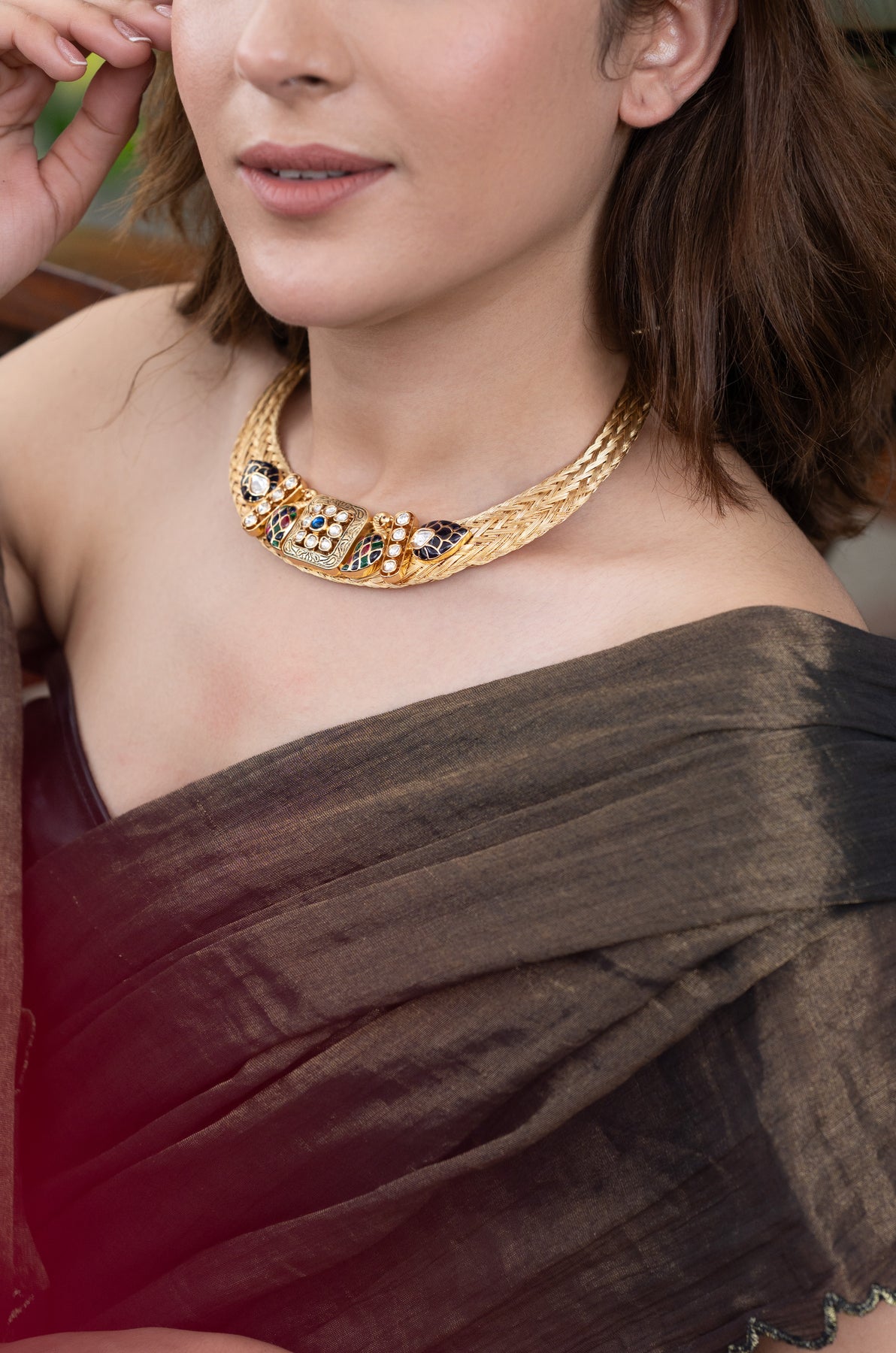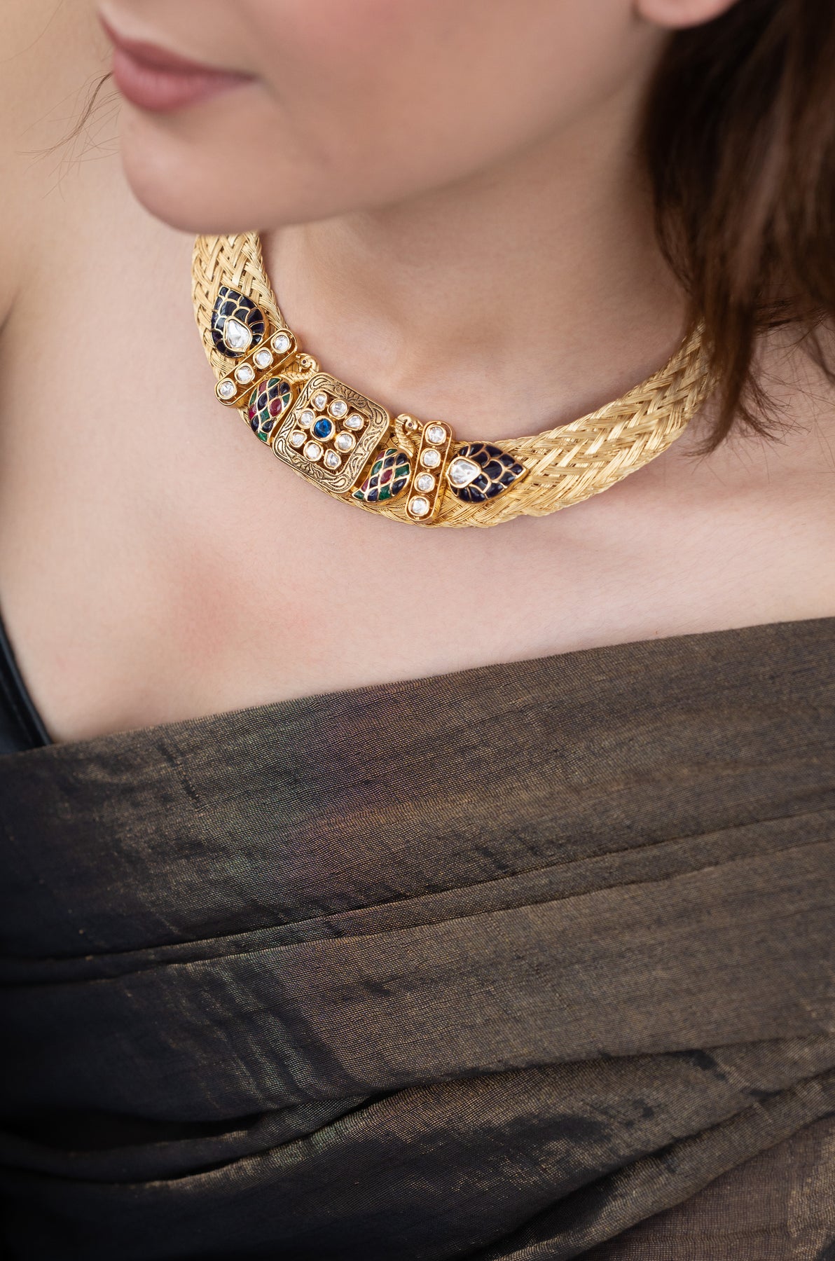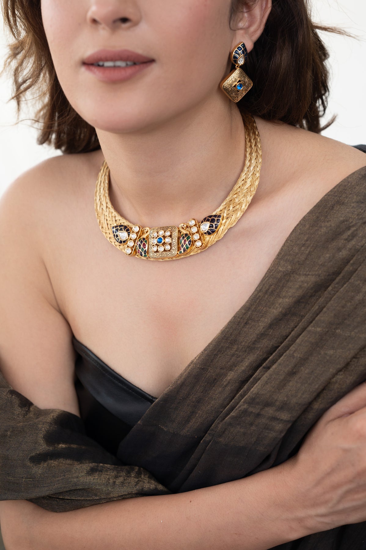 Elevate your sophistication with the Greta blue polki necklace set. Adorned with intricate bird polki patterns and shimmering green and blue stones, this set exudes timeless style and elegance. Drawing inspiration from the iconic hasli design, it is a true masterpiece with its intricate details. Complete the ensemble with the accompanying earrings.