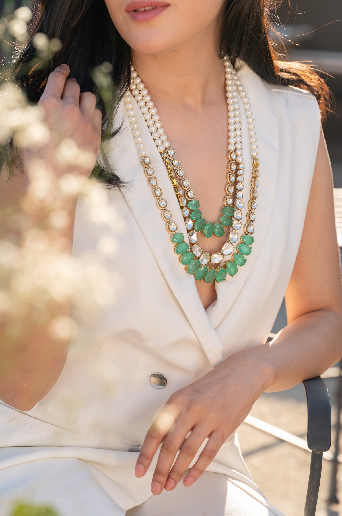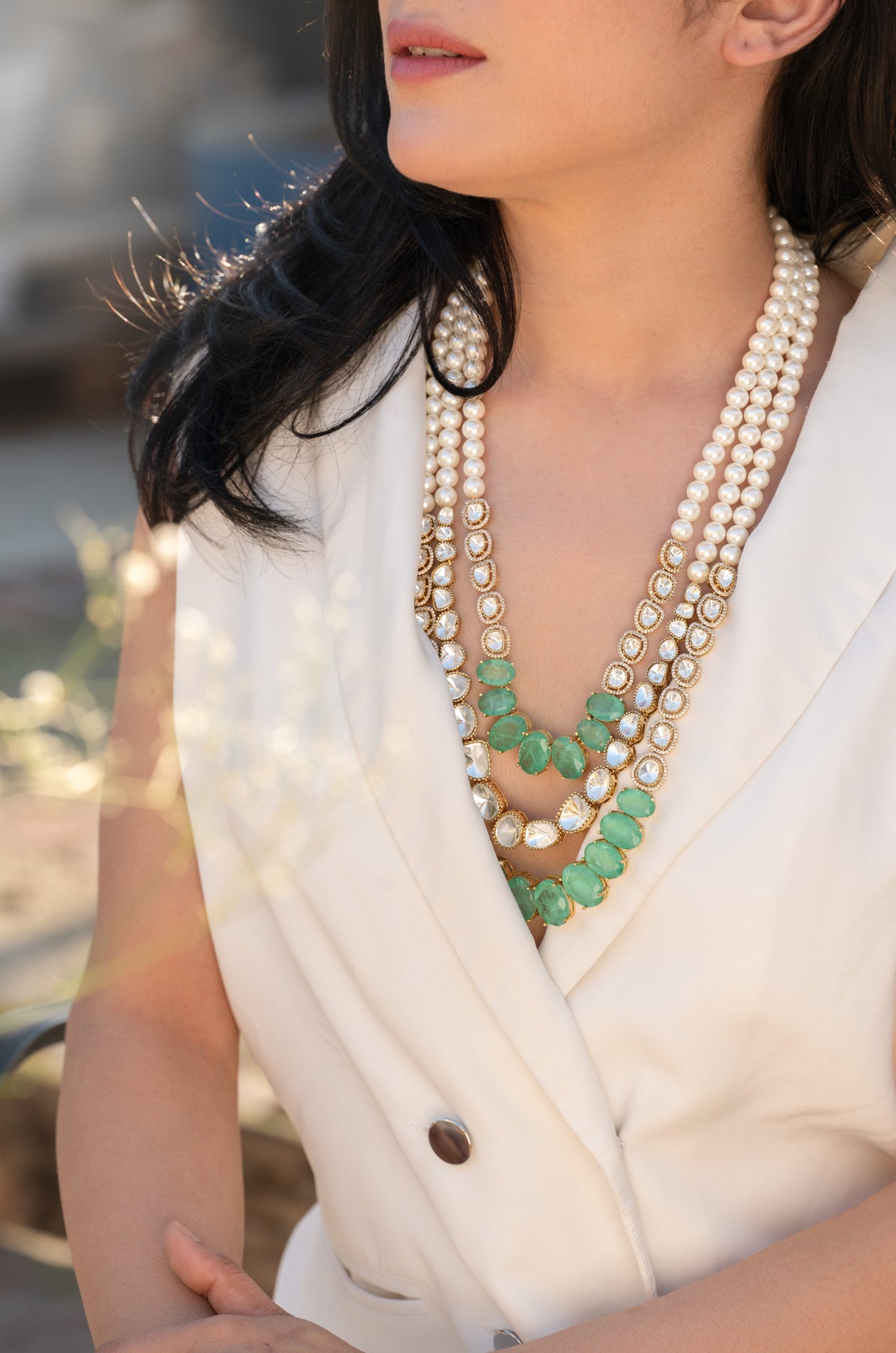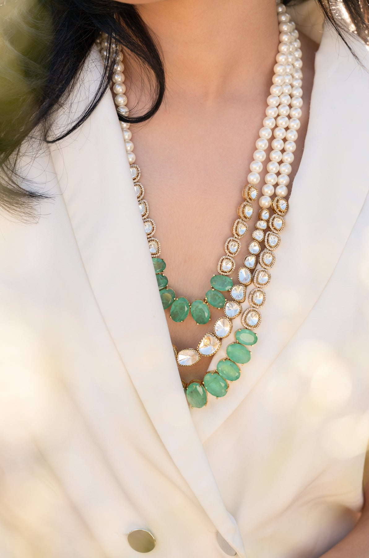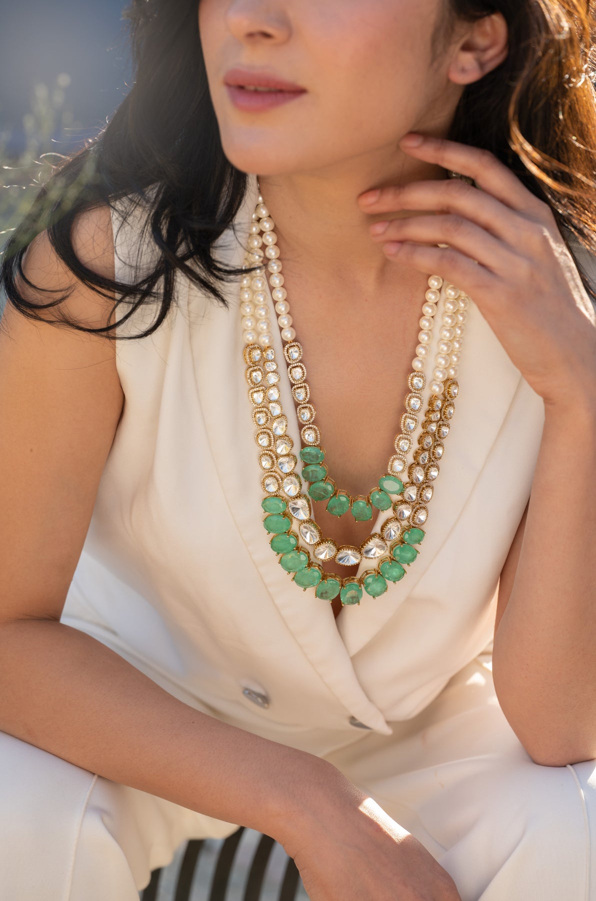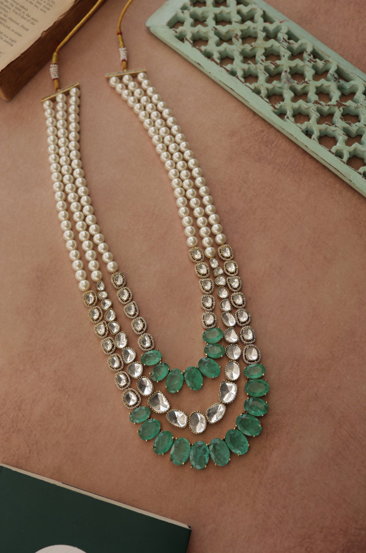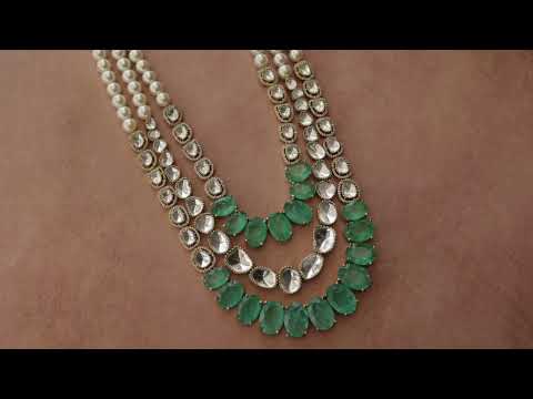 Experience the regal and timeless beauty with Rubabh mint polki necklace. Drawing inspiration from layered royal necklaces, this exquisite piece combines vintage elements of polki and pearls to add elegance and sophistication. The mint green fluorite stones offer a sense of peace and harmony while giving a modern twist to the traditional Maharani look. Elevate your style with this statement necklace.