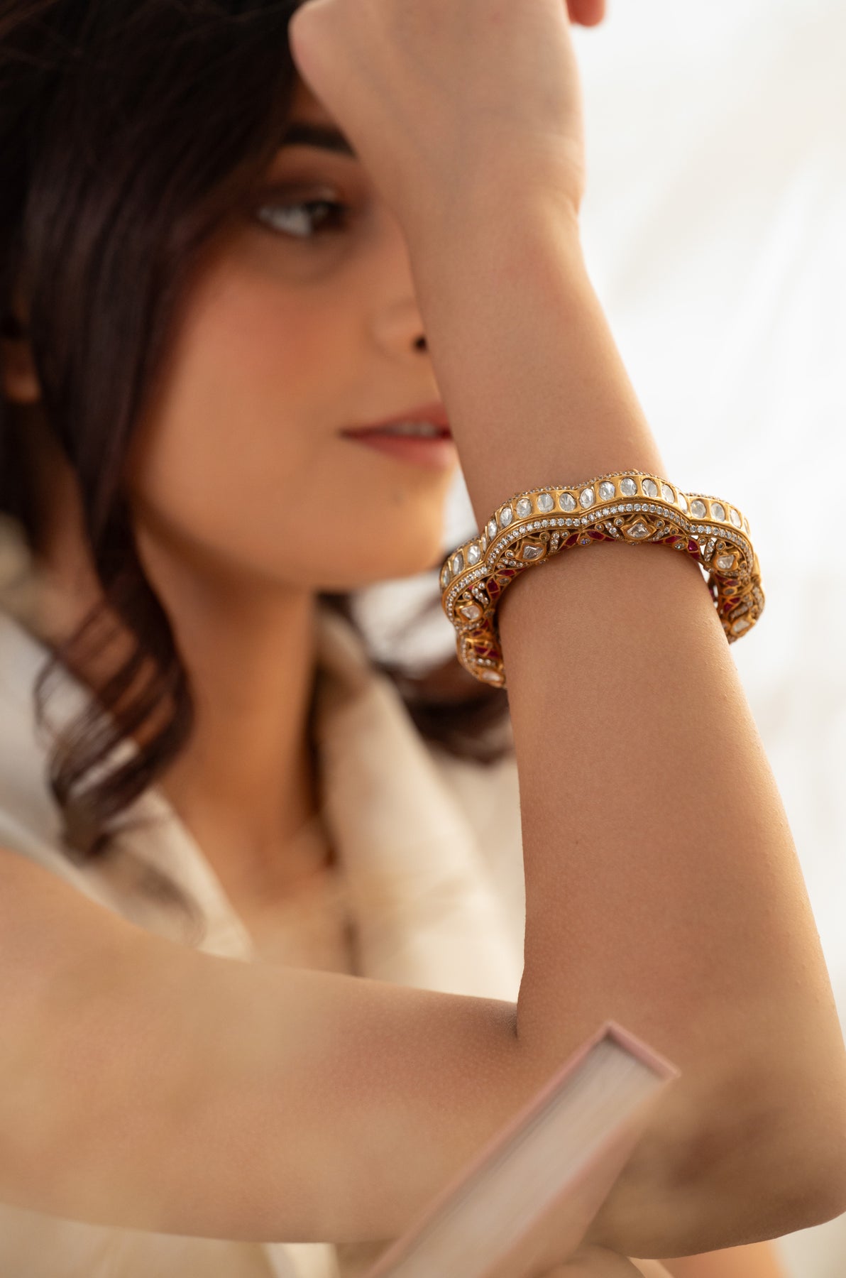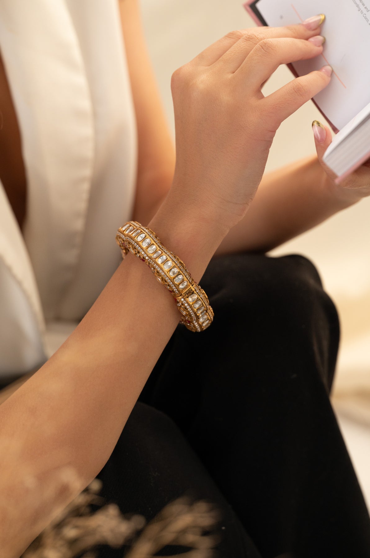 Make a statement with the Anahira Pink Polki Bangle, your new favorite way to shine! This eye-catching gold-toned bangle showcases impressive uncut polkis paired with soothing pink fluorite stones, all strategically set to maximize that gorgeous glimmer. With its perfect balance of retro charm and contemporary style, this playful piece is your secret weapon for transforming any outfit into something truly special.