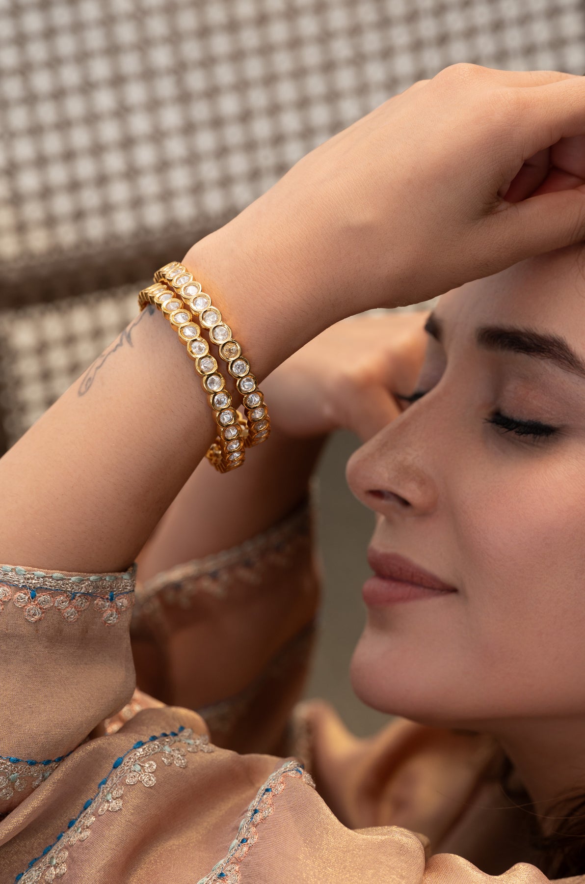 Add a touch of sparkle to your festive vibe with the charming Giya bangles. Crafted with detailed polki work, these bangles bring a classic yet playful charm to any outfit. Whether it’s a party or a casual day out, they add just the right twinkle to brighten your look. Let these bangles be the fun, elegant highlight that completes your style effortlessly.