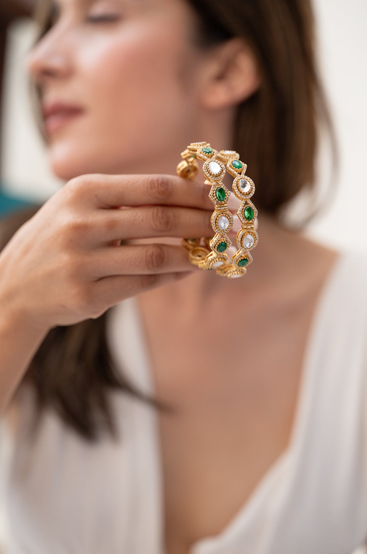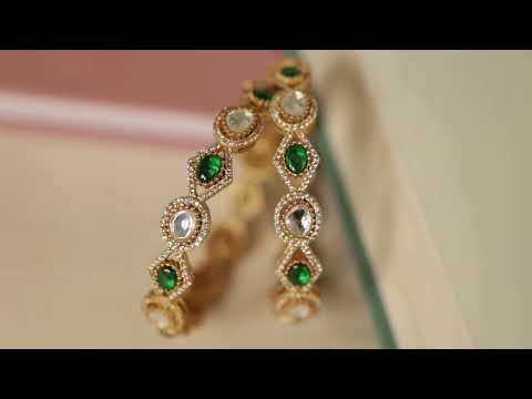 Spruce up your outfit with these Nerah bangles that effortlessly combine tradition and modernity. Featuring vibrant green jade and polkis, along with dazzling cubic zirconia, these bangles radiate grace and refinement. A must-have for any event, these bracelets will add a dash of sparkle to your style.