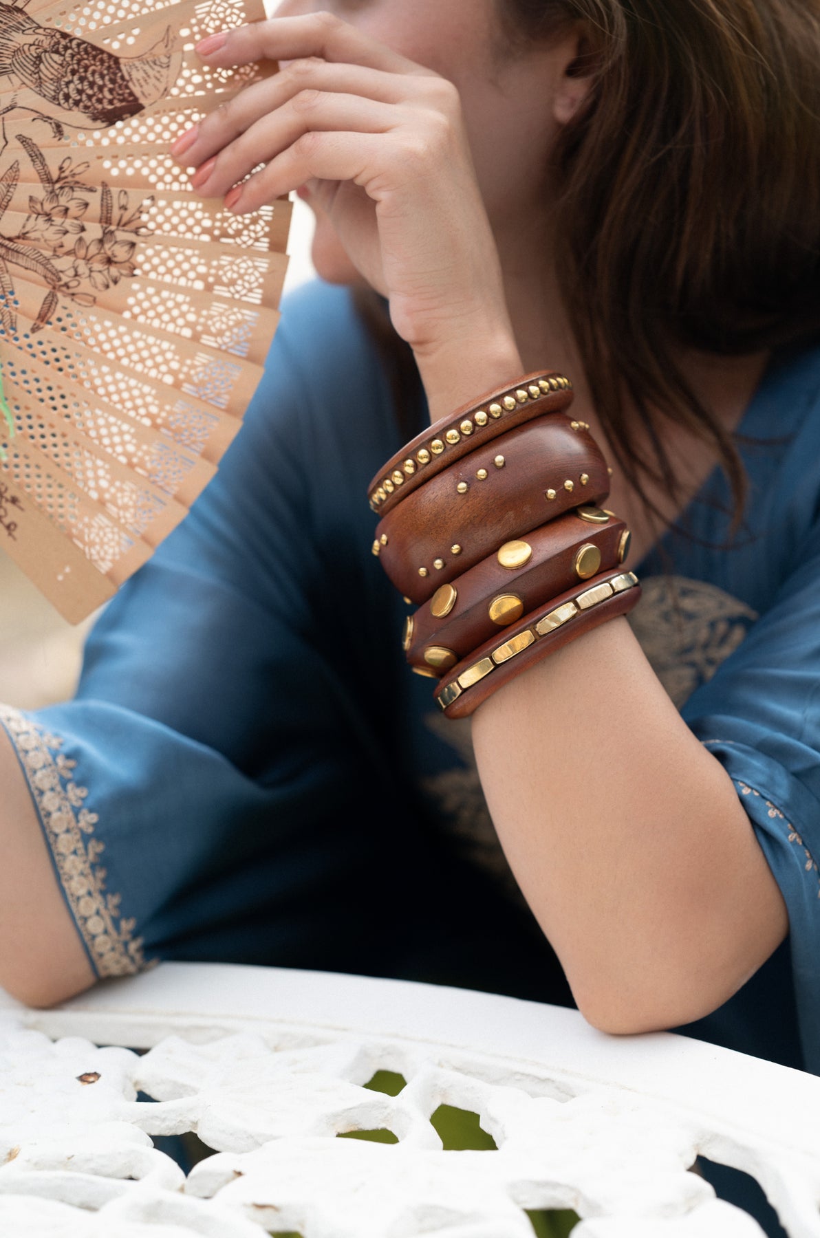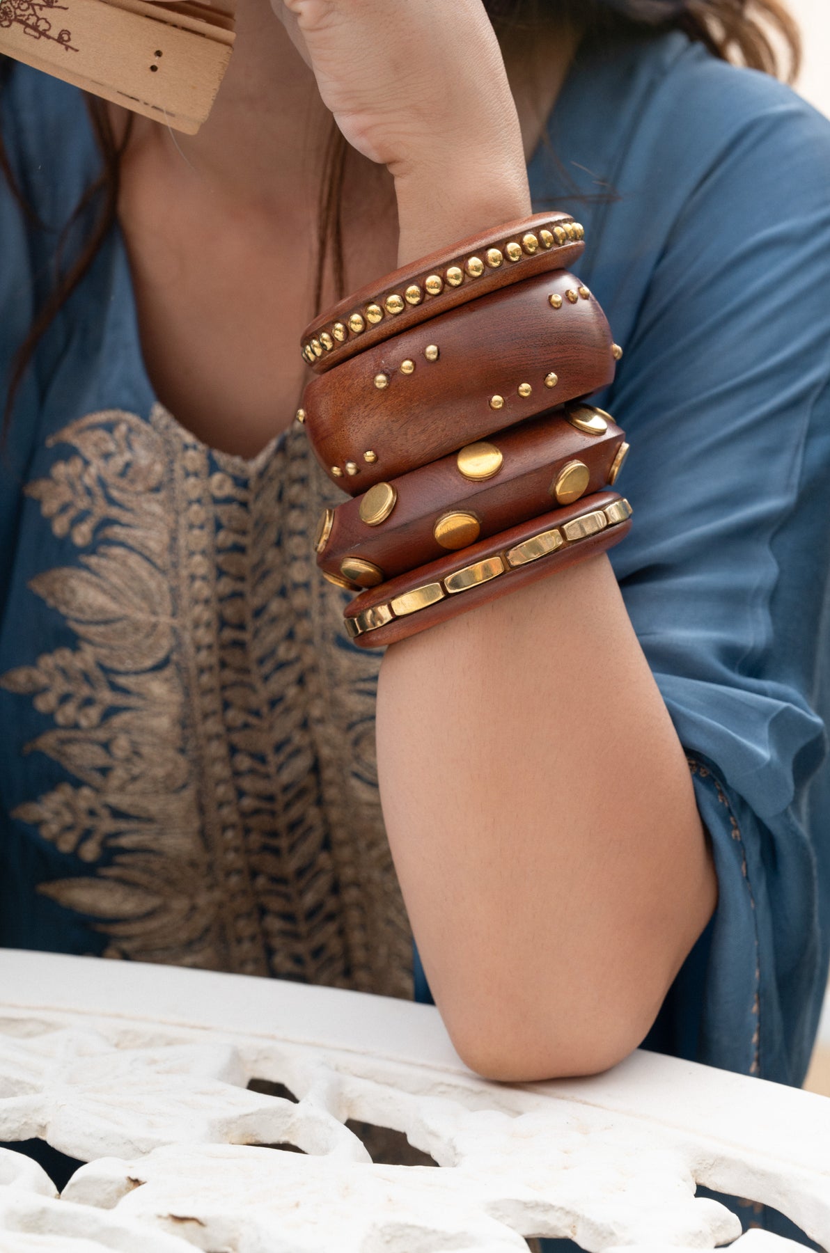 Add a dash of charm to your look with the Sabhya Wooden Bangles set! Featuring four stylish bangles adorned with delicate gold patterns, these unique accessories blend contemporary flair with timeless elegance. Perfect for stacking or wearing solo, they bring a playful twist to any outfit while celebrating natural wood textures with a chic, modern edge.