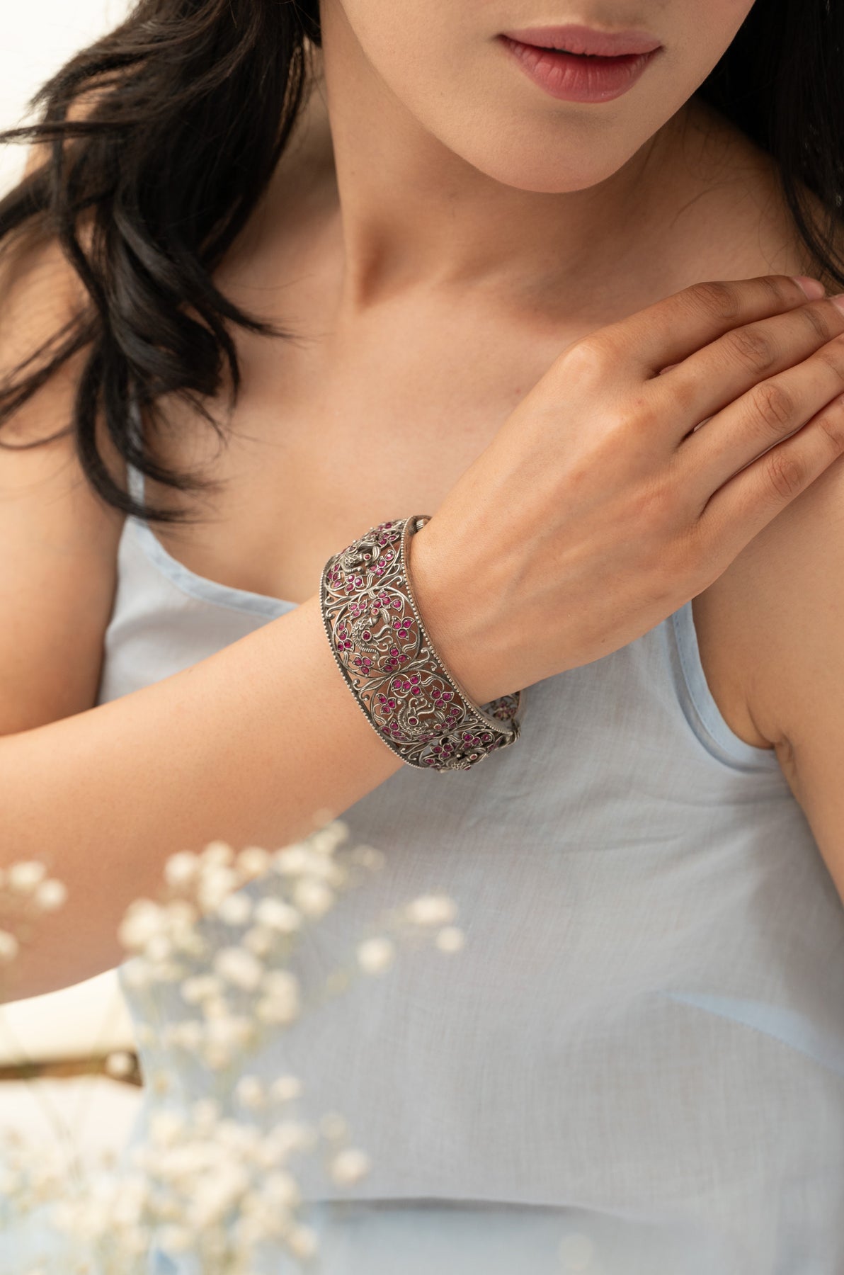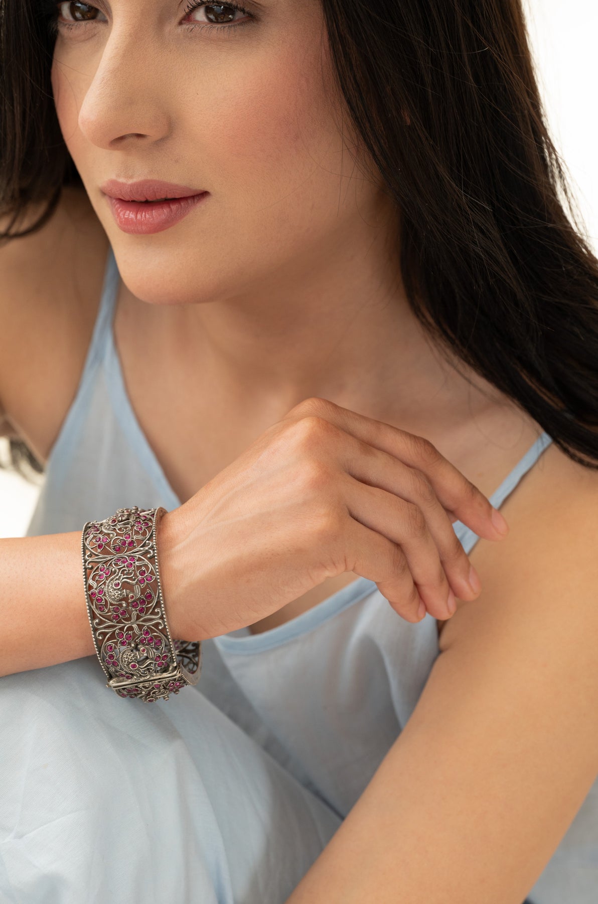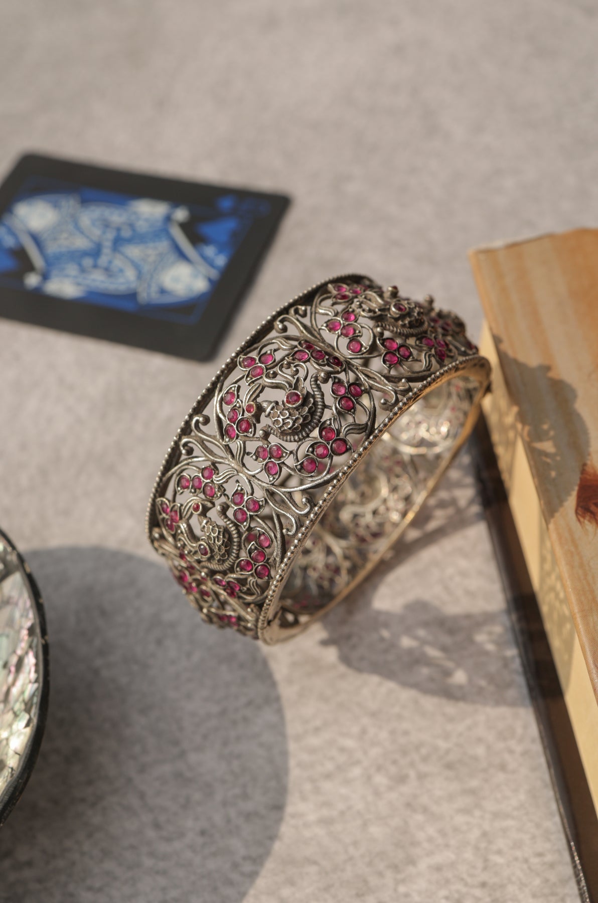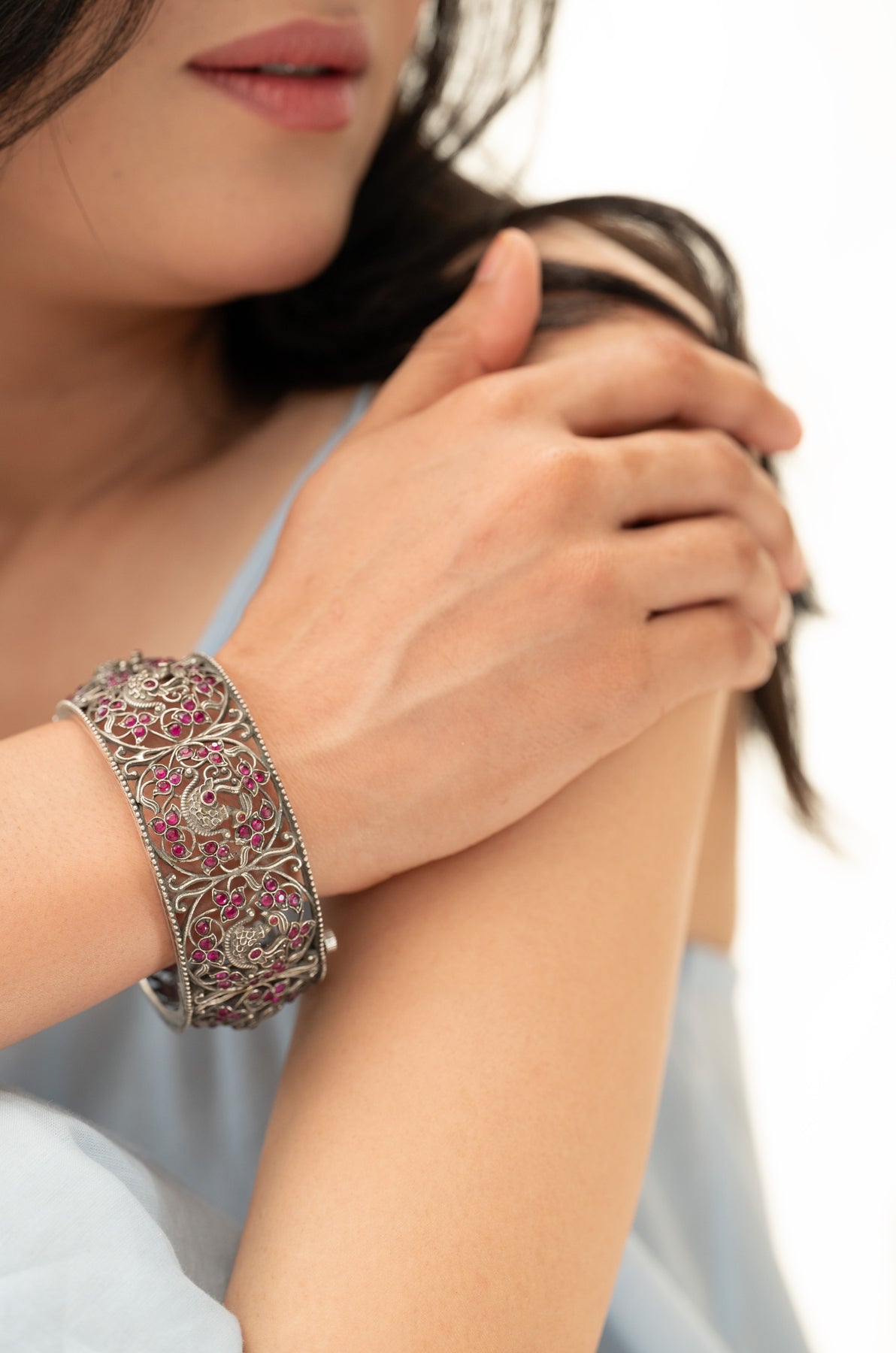 Elevate your style game with the Sabri oxidized silver bangle. Inspired by antique silver, this statement bangle is adorned with intricate peacock motifs and the goddess Lakshmi, and embellished with delicate pink stones. Add a touch of boho chic to any outfit with this show-stopping accessory.