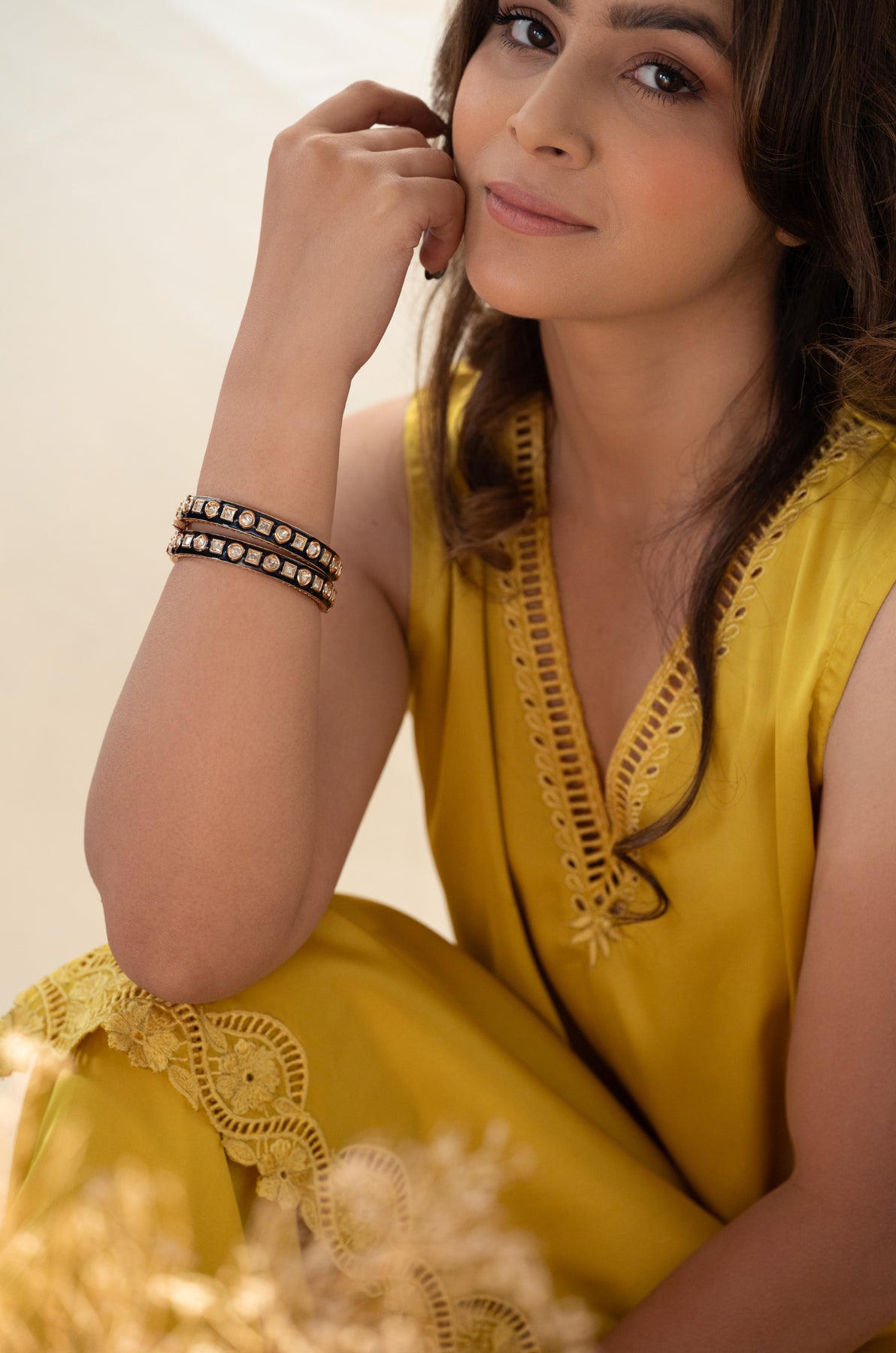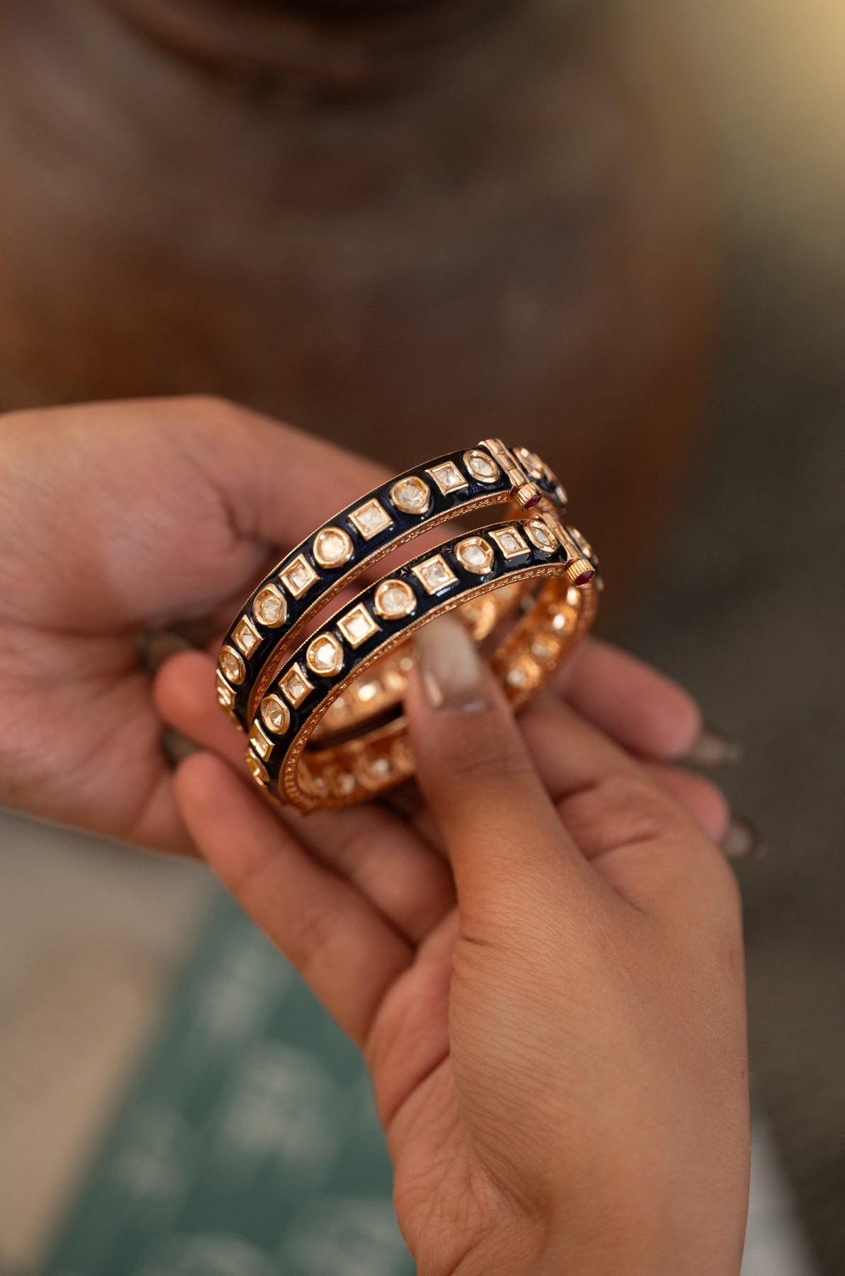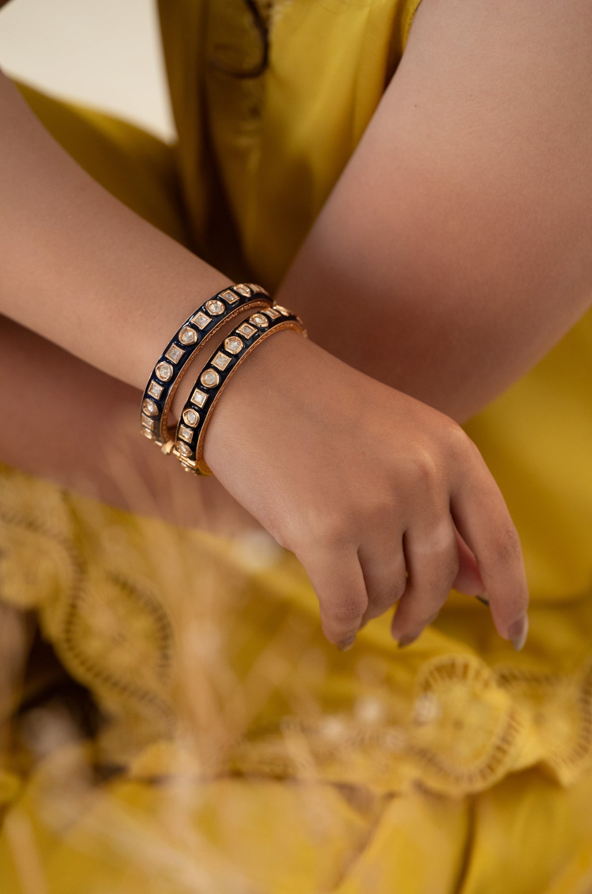 Dive into timeless elegance with this enchanting pair of Sangeeta bangles. Rich cobalt blue meenakari work meets sparkling polki stones in a dance of opulence, all framed by gleaming gold accents. Each bangle tells a story through its hand-painted artistry, celebrating the magic of traditional craftsmanship. Perfect for making a statement at weddings, festivals, or whenever you want to channel your inner royalty. Slip these beauties on and let your wrists do the talking with grace and glamour.