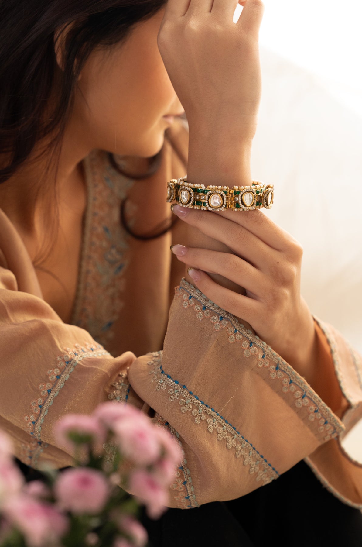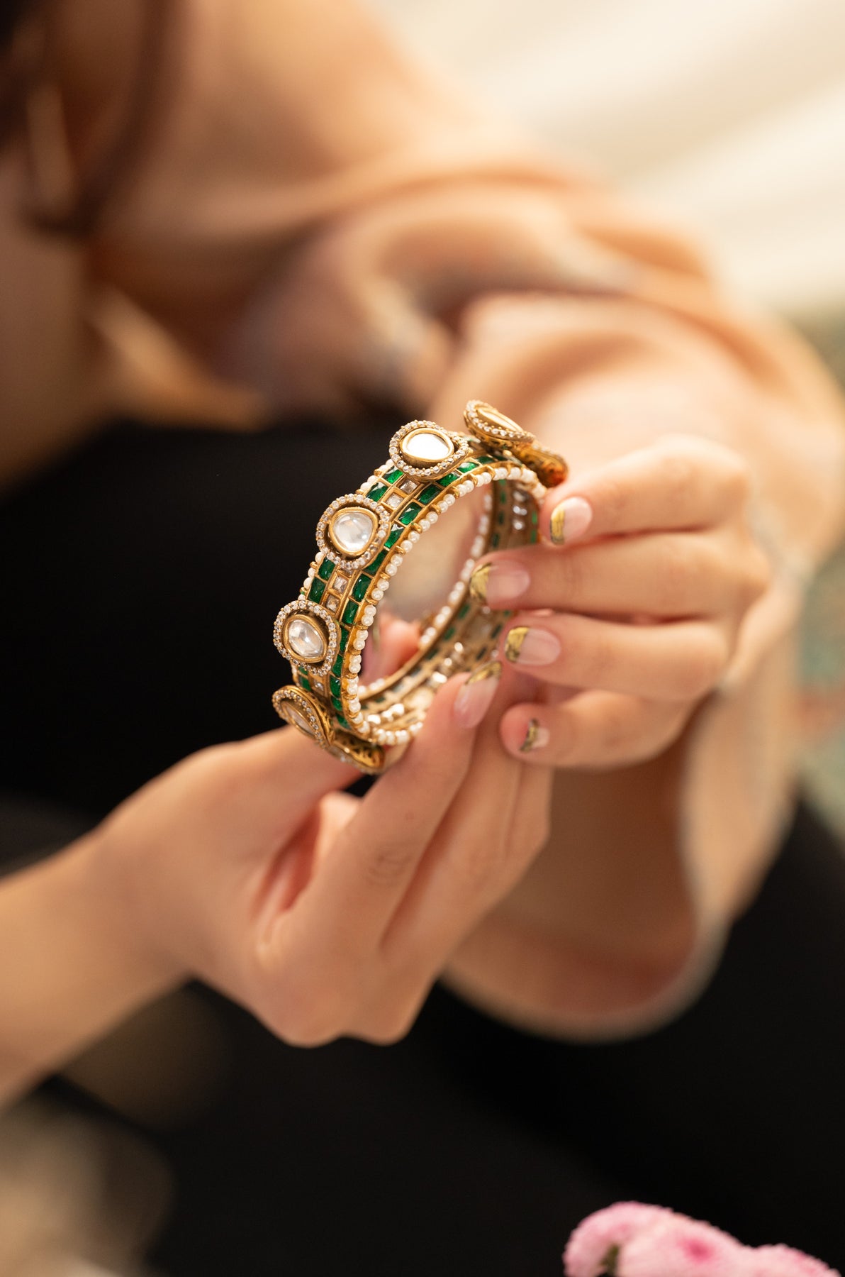 Step into the world of Rajasthani royalty with the Shalyn Green Polki Bangle. This stunning piece captures the essence of traditional craftsmanship, featuring brilliant polkis that dance against a lush green canvas. Perfect for those who crave a dash of regal flair, this bangle whispers stories of palace grandeur and timeless beauty.