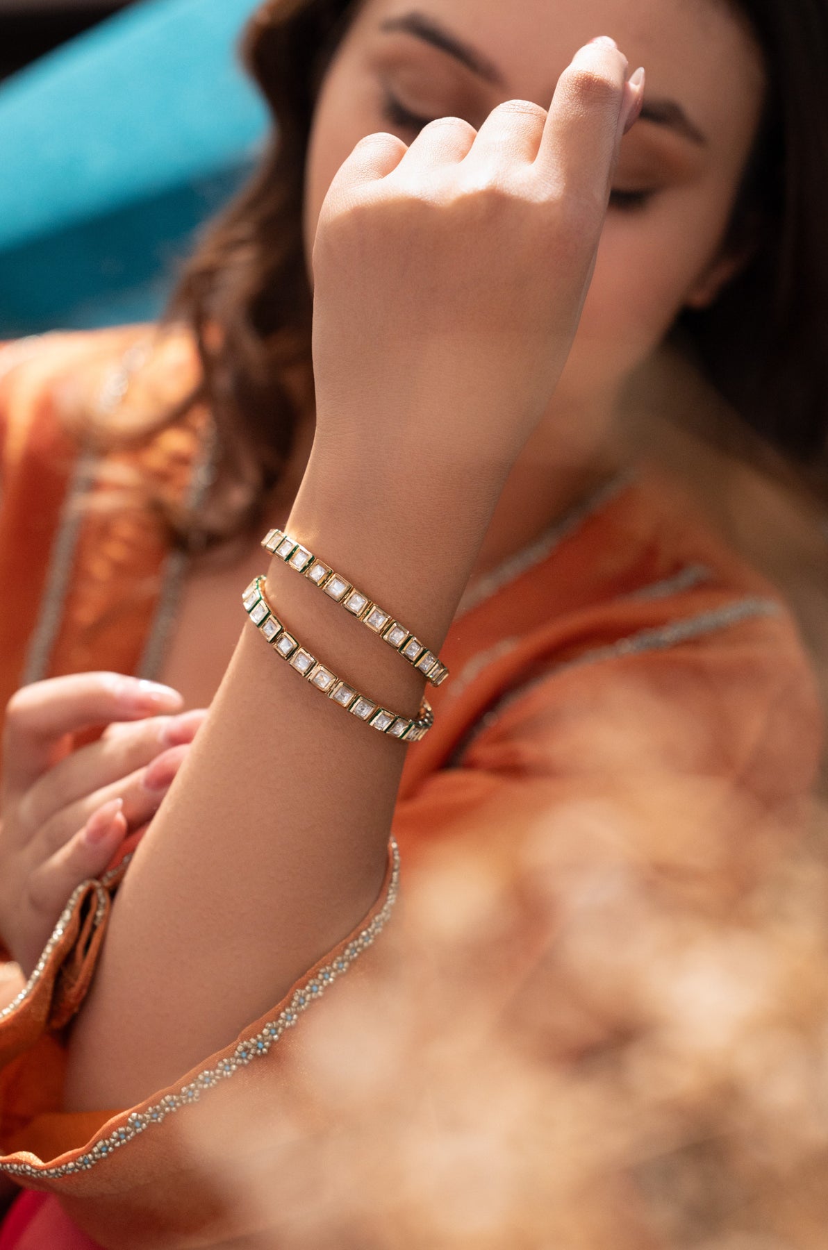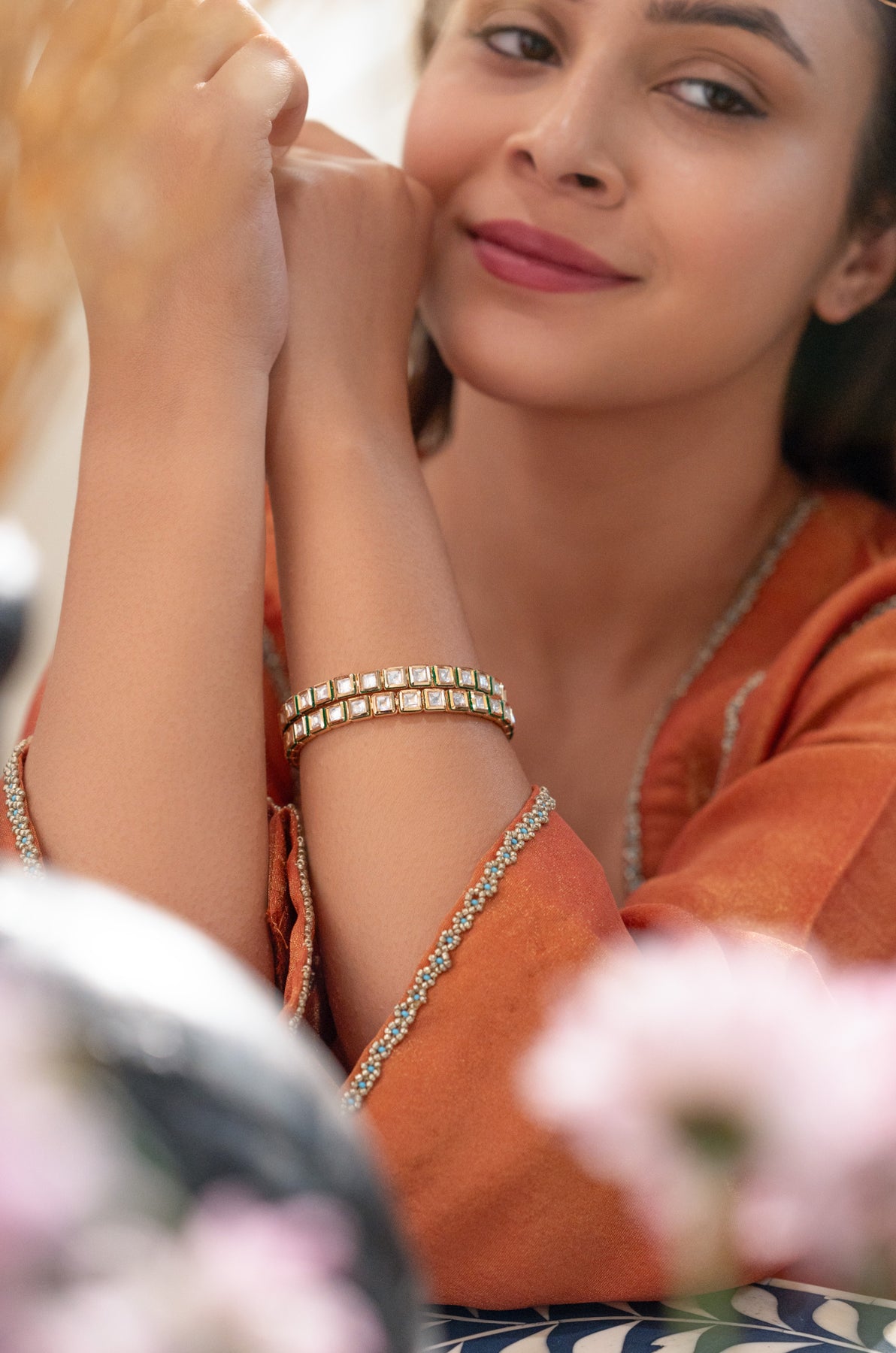 Add a sparkling twist to your traditional look with these Divya Kundan Bangles. Perfectly crafted in a set of 2, their intricate kundan work brings a timeless charm that dances with every gesture. Whether it’s a festive day or a fun evening out, these bangles add a playful shine that keeps all eyes on you!
