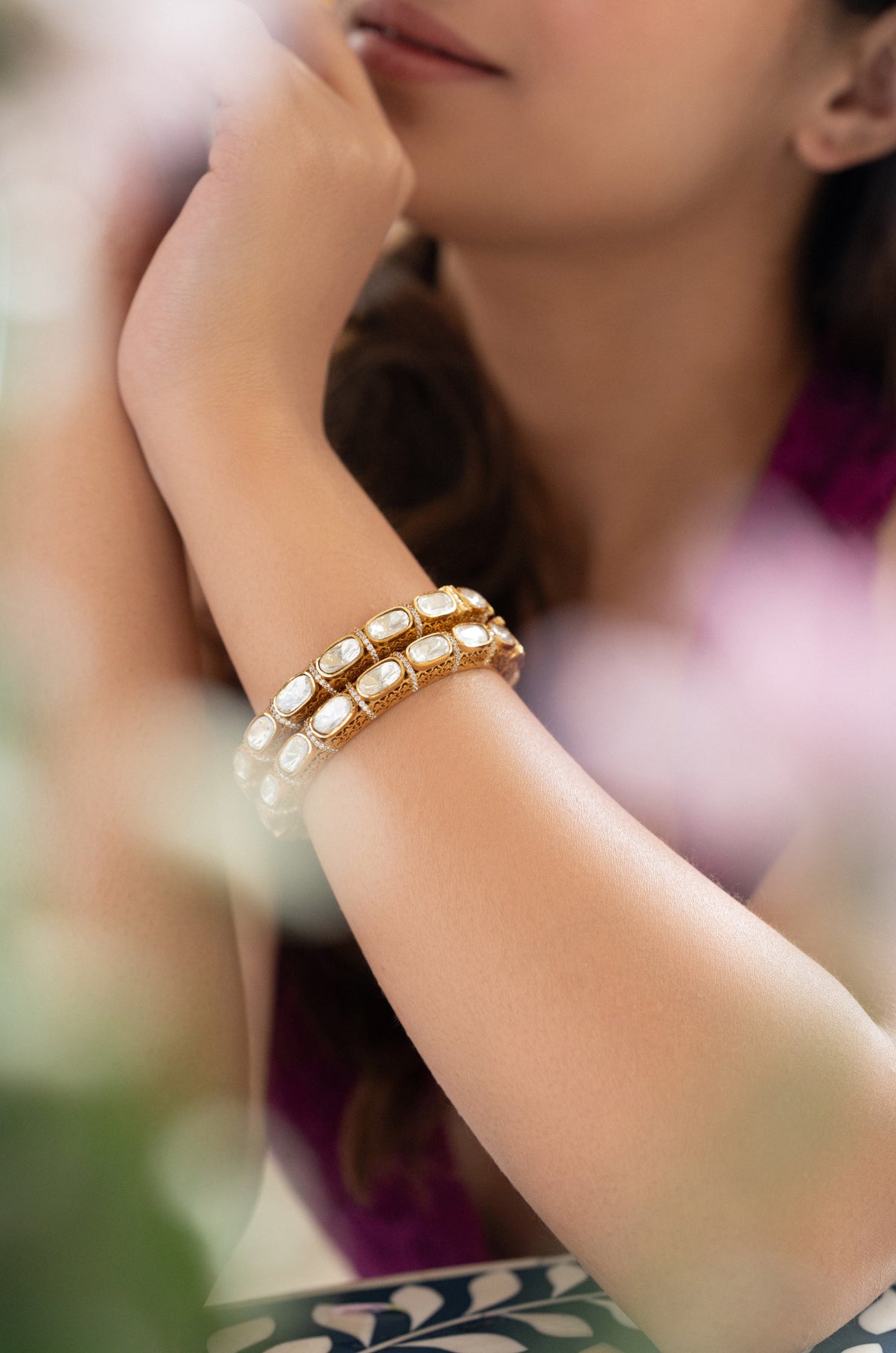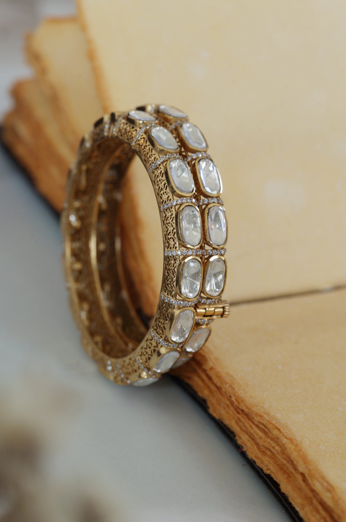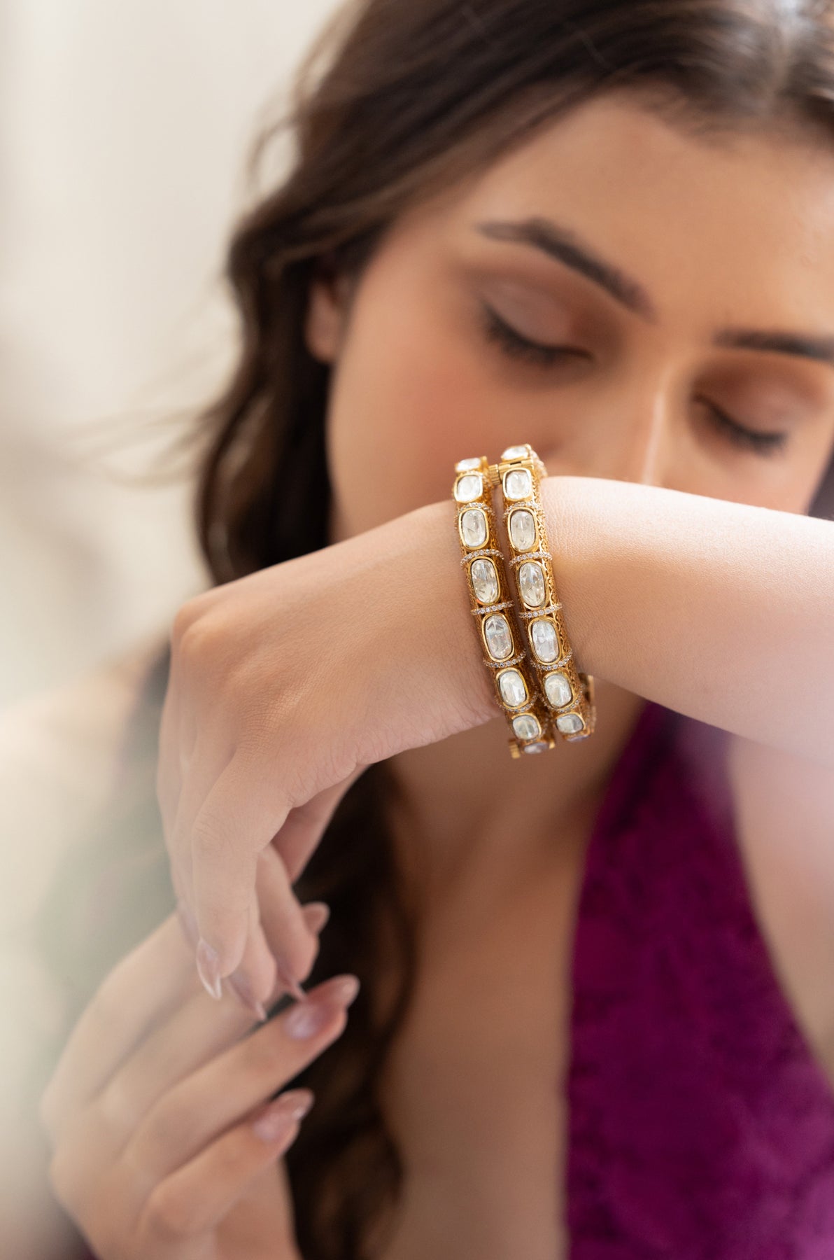Bring a royal sparkle to your ensemble with these two Elara bangles. Designed in a classic traditional style, they shine with timeless beauty, ideal for festive occasions or adding a dash of everyday elegance. Their charming design offers a fun and graceful boost to any jewelry box.