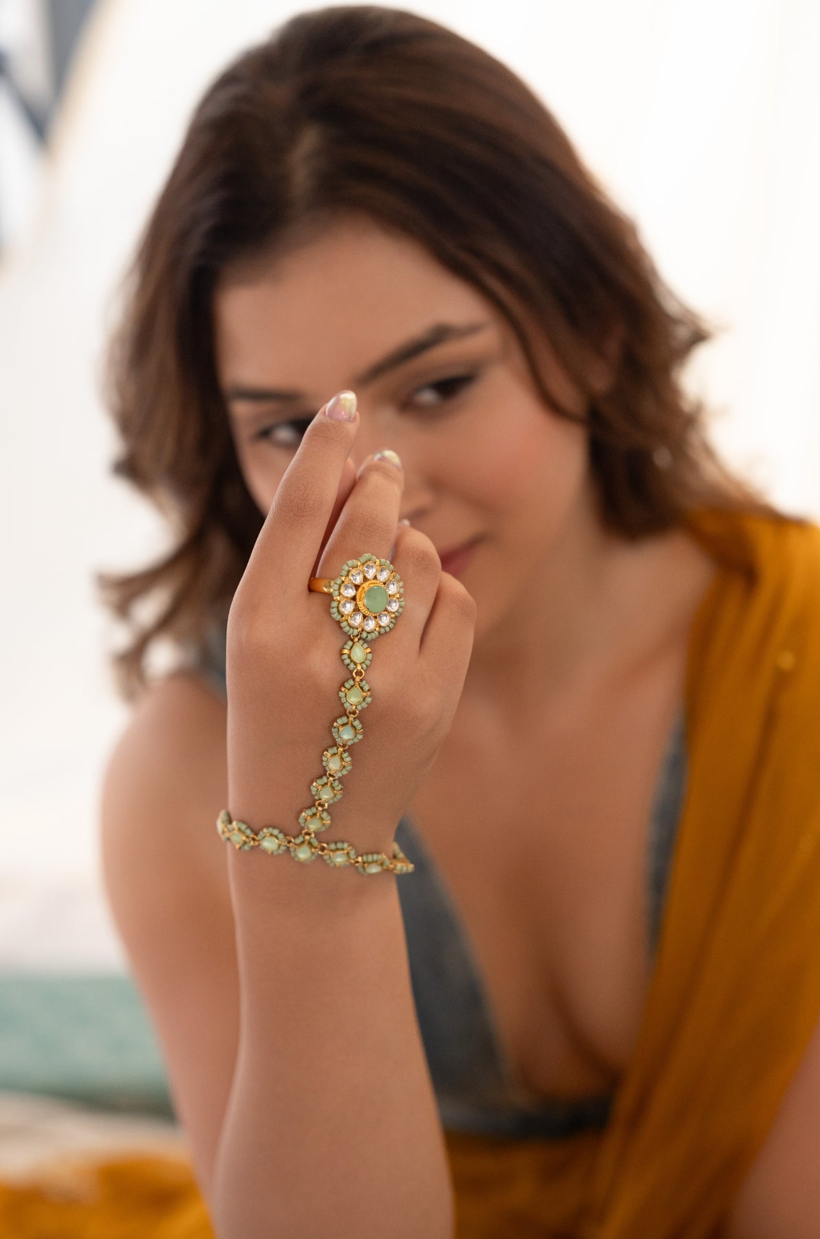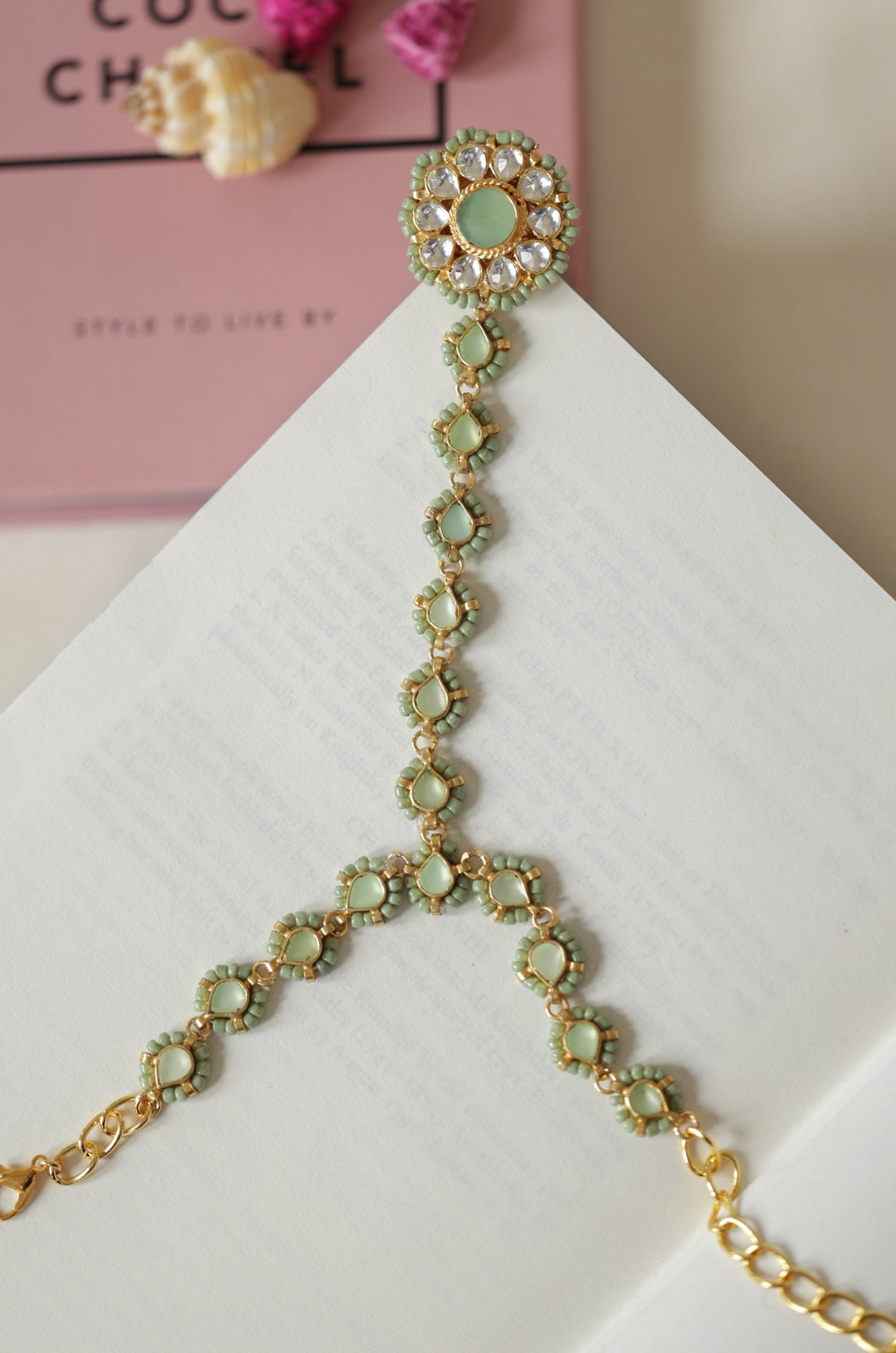 A vision of elegance draped across your hand, the Inaya hathphool is where tradition flirts with whimsy. Drenched in soothing turquoise tones and embellished with glistening kundan stones, this piece flows like poetry from finger to wrist. Delicate beadwork frames every element, while the statement floral centerpiece brings the drama. A perfect adornment for mehendi moments, intimate celebrations, or just when you feel like embracing your inner royalty.