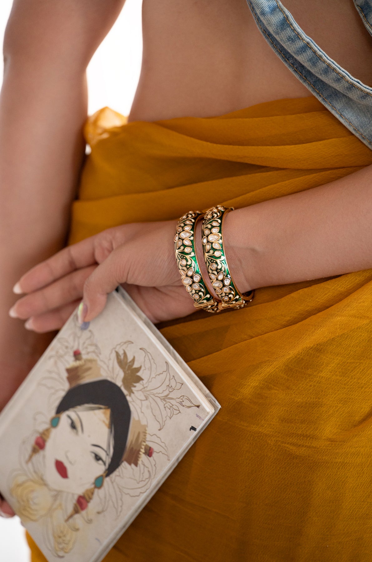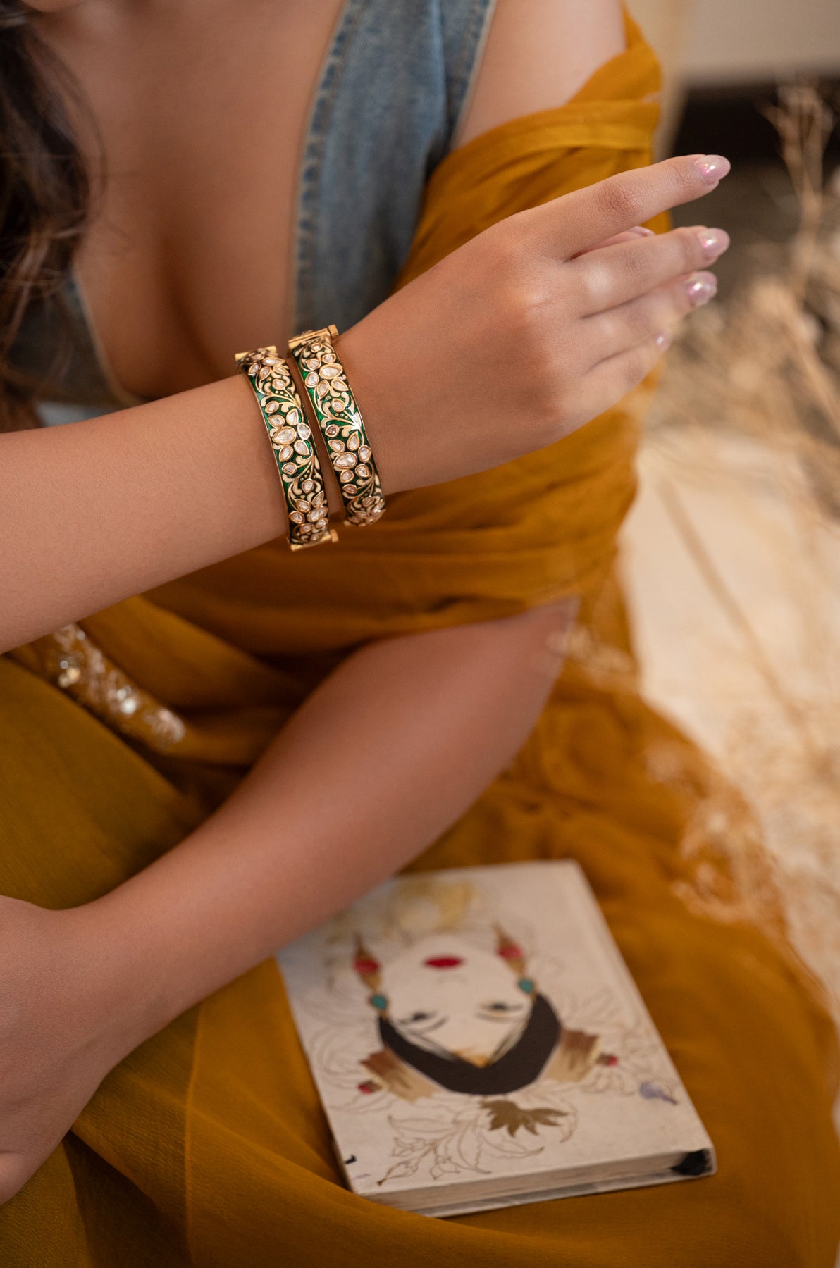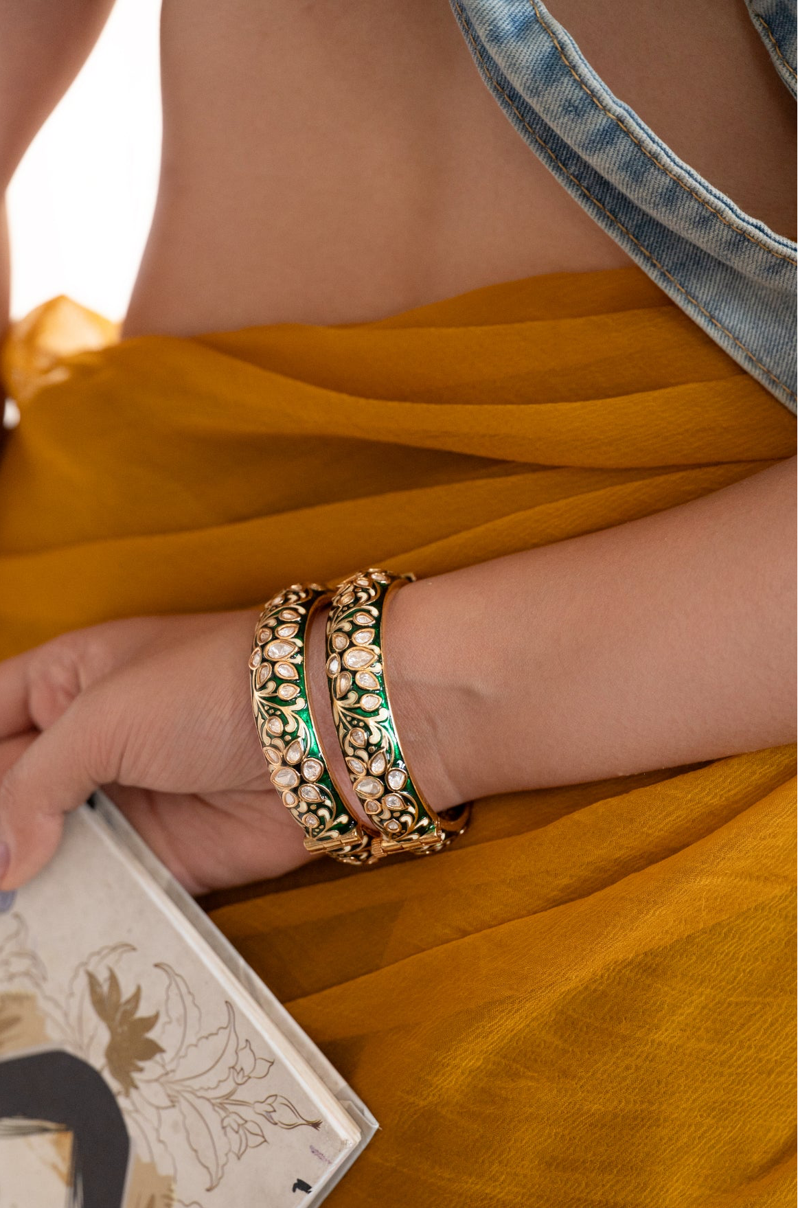 These Sabeeta bangles are a delightful pair encrusted with vibrant green enameled meenakari and sparkling polki stones. Their playful design combines traditional craftsmanship with a fresh burst of color, making them perfect for adding an elegant yet fun touch to any outfit.