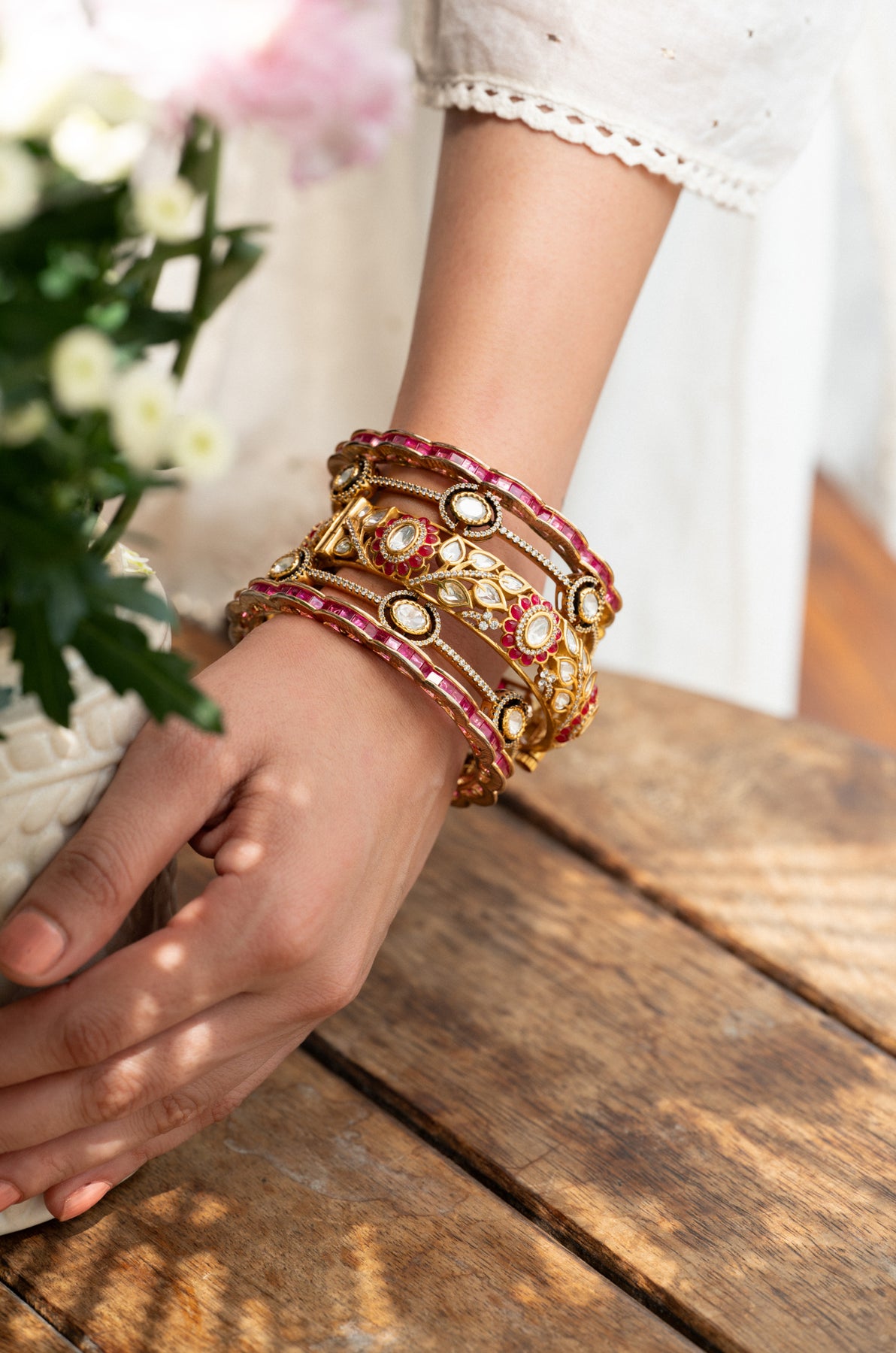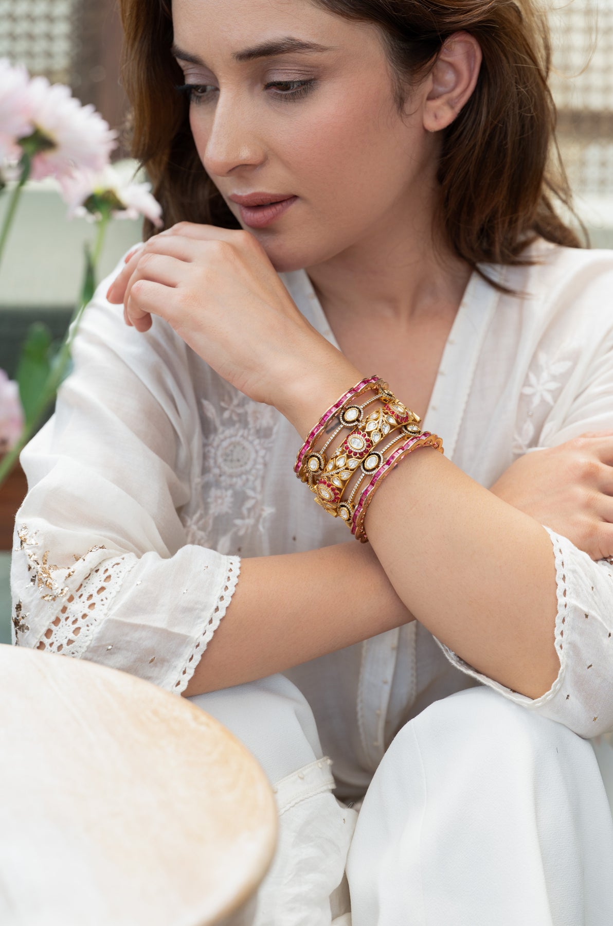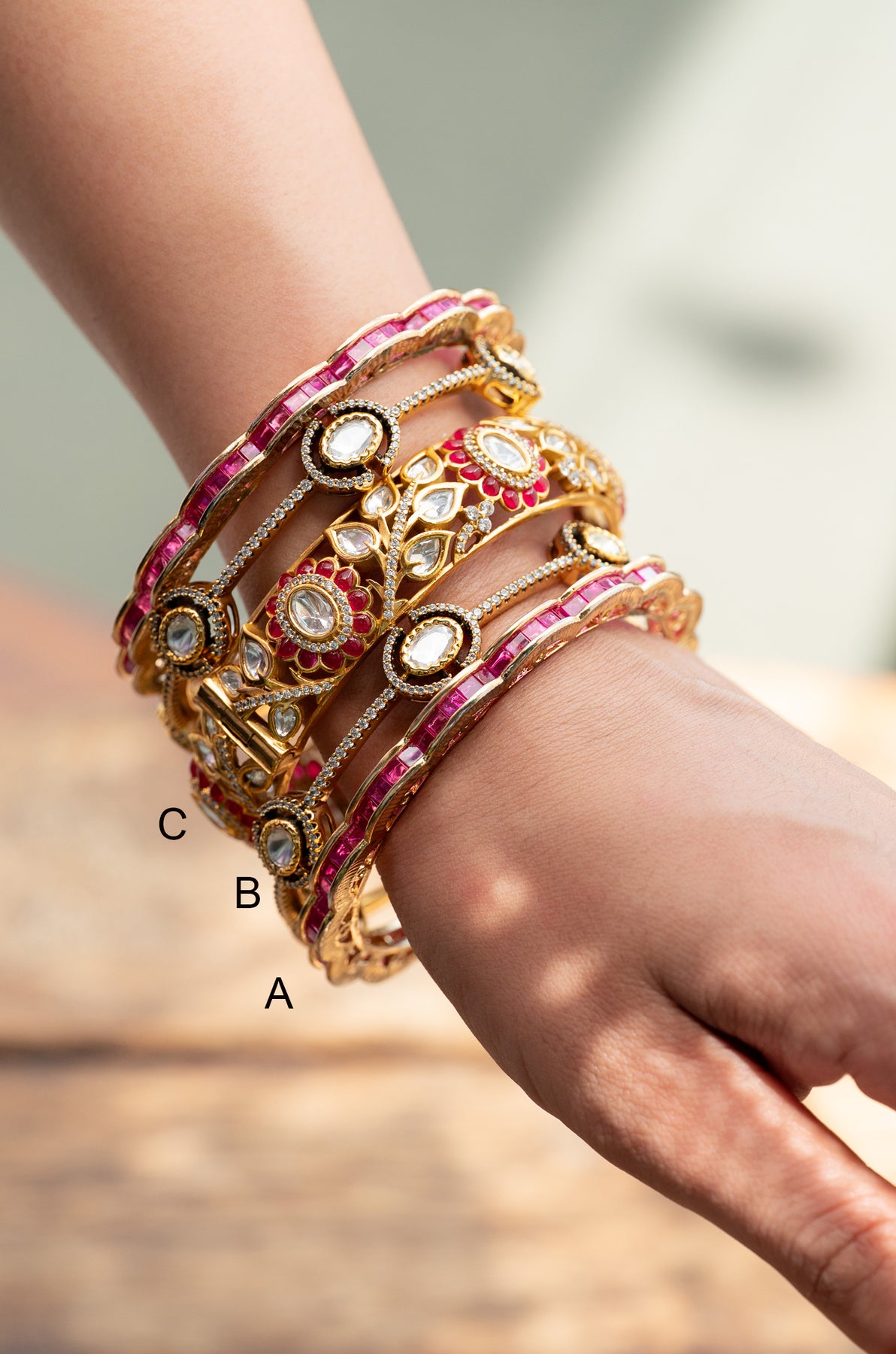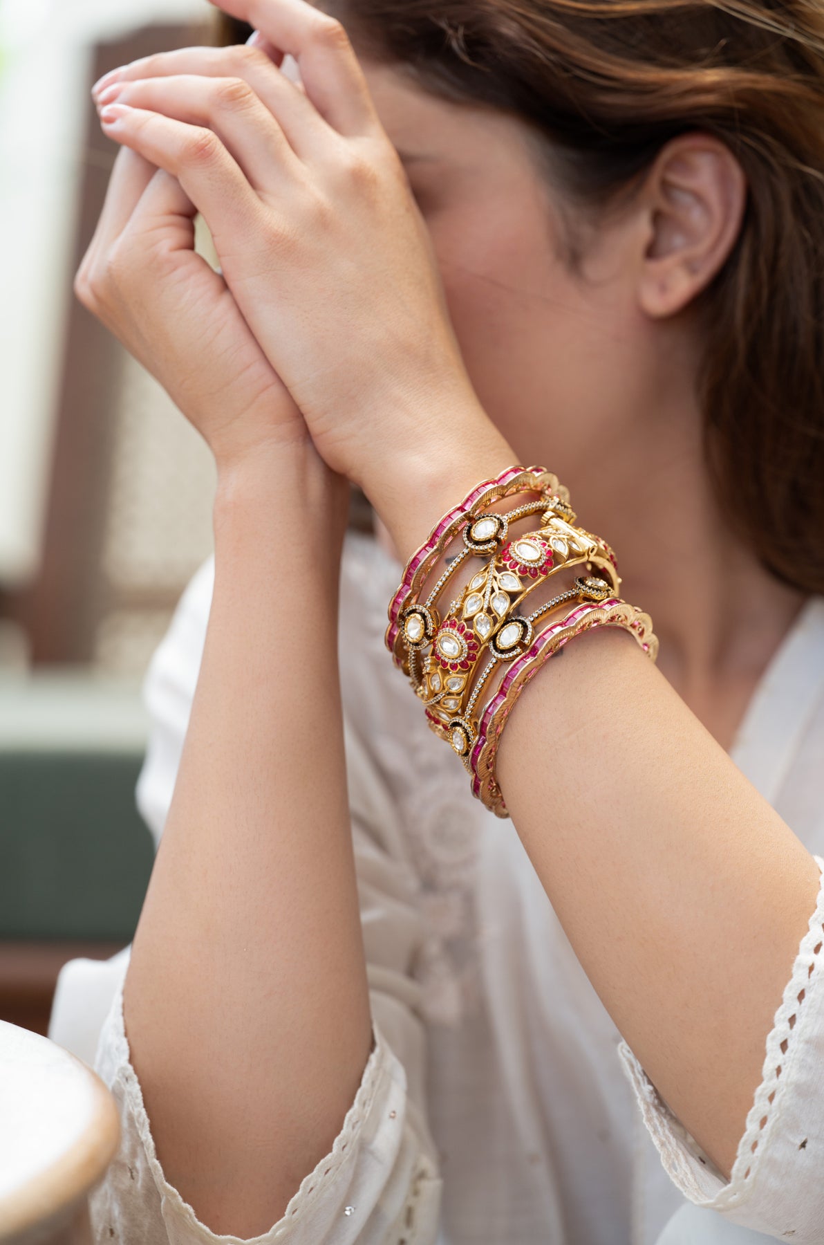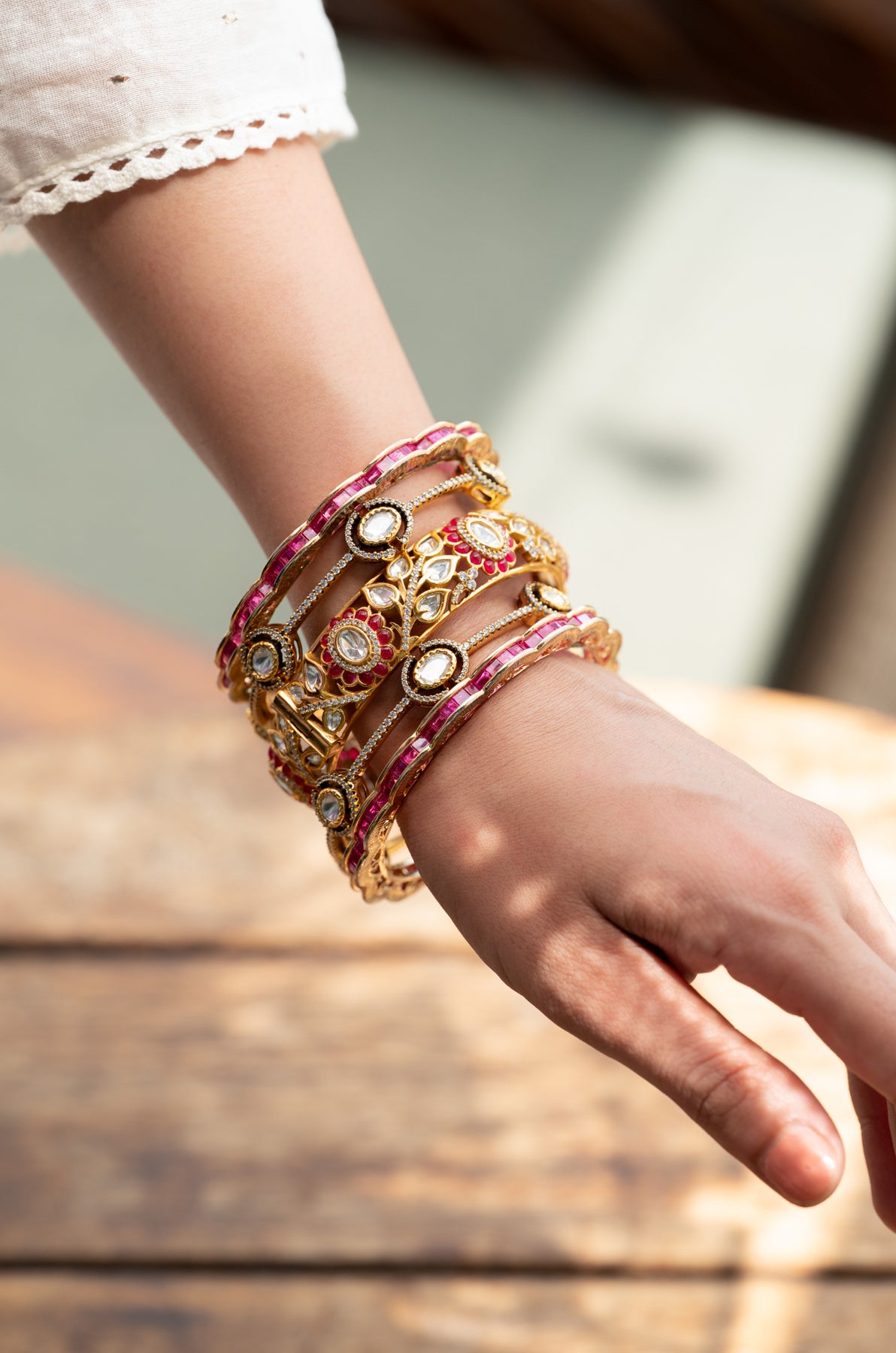 Embrace the enduring allure and sophistication of traditional celebrations with our exquisitely crafted polki bangles. Designed with expert precision and intricate detailing, these bangles are the ideal accessory for weddings, imparting a refined elegance to any special event.