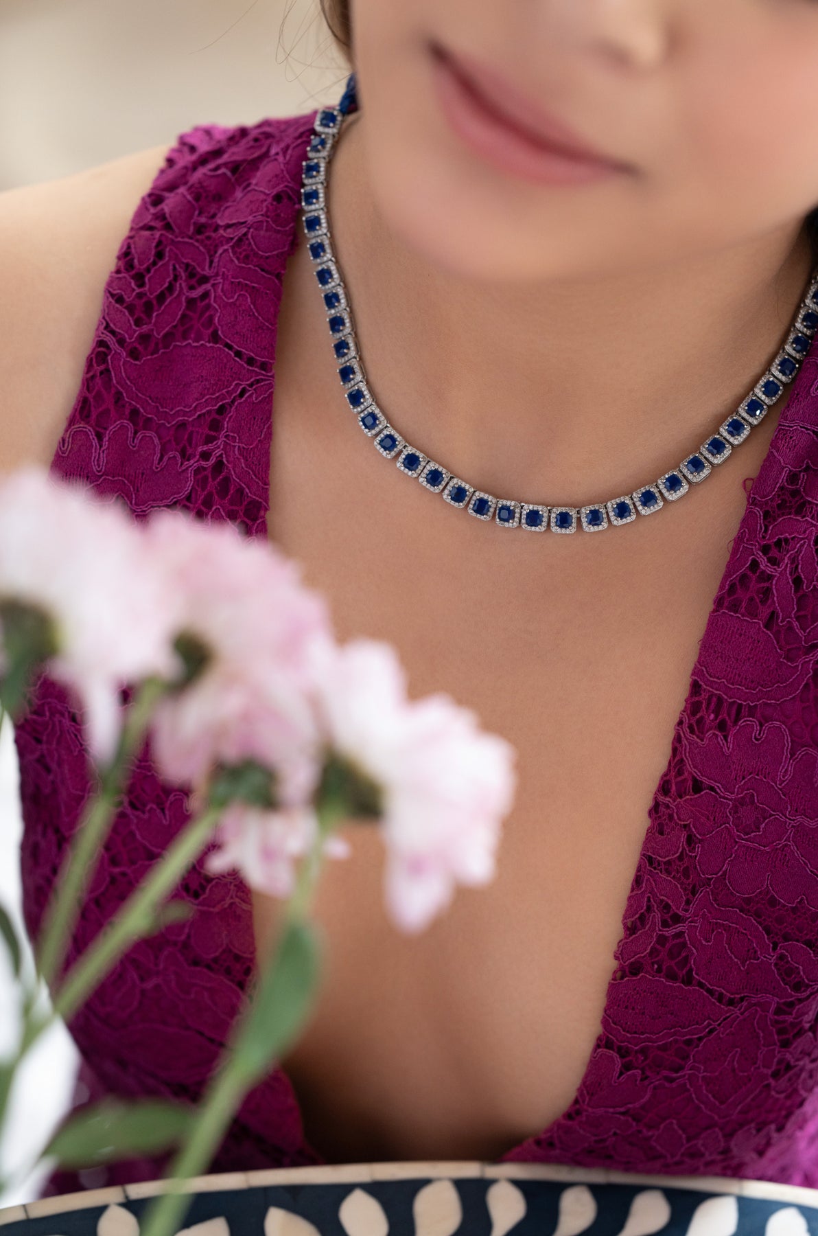 Brighten your evenings with the Blue necklace, featuring rich garnet stones sparkling alongside shimmering cubic zirconia. This playful piece adds a vibrant pop of color and glitter, perfect for making every night feel special and fun. Let your style shine effortlessly from dusk till dawn!