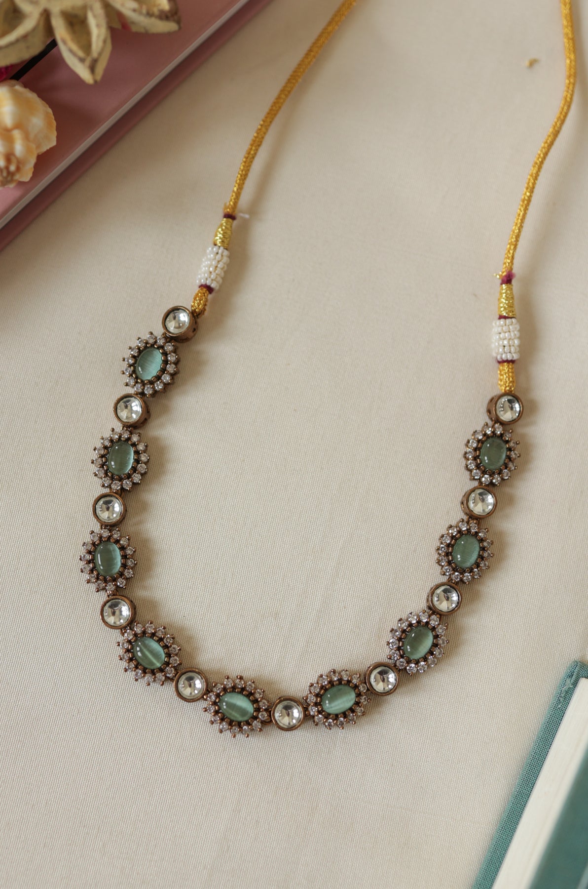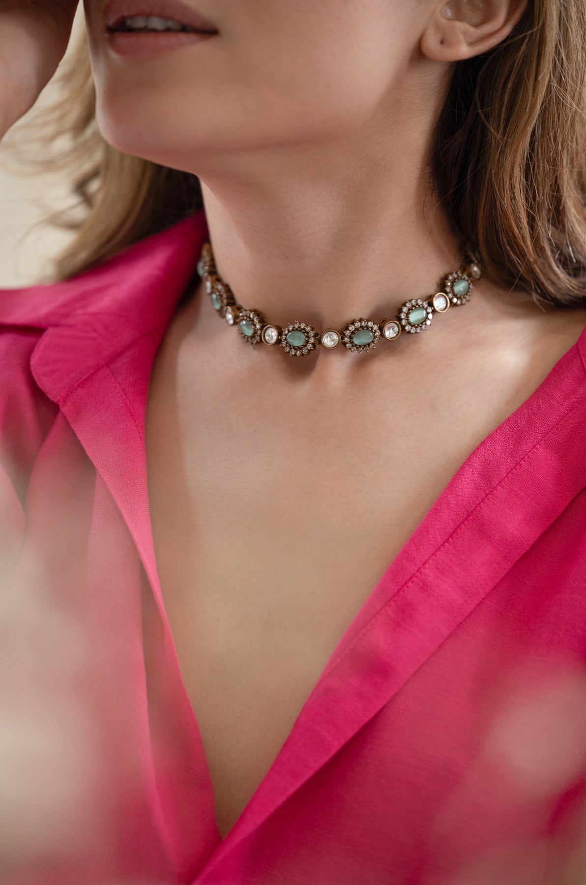 Embrace a fusion of tradition and contemporary boldness with the Cirisha choker necklace. This unique choker features a stunning contrast between the brilliant sparkle of Kundan stones and the smooth, captivating sheen of green cabochons. The design is both intricate and impactful, secured with an adjustable gold dori for a comfortable and customized fit. This is not your typical choker; it's a statement piece designed for the confident woman who appreciates bold, artistic jewelry with a touch of traditional Indian grandeur
