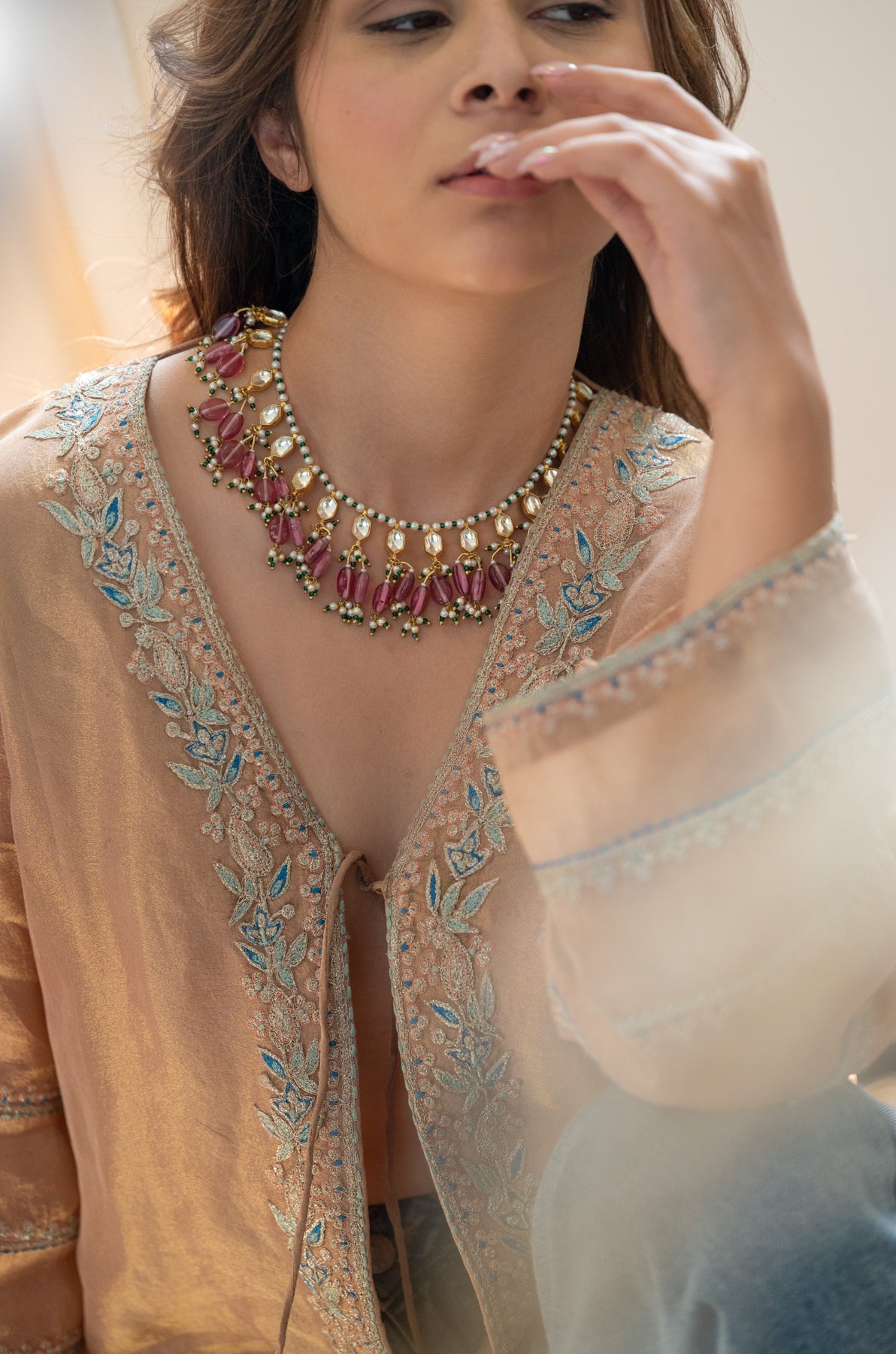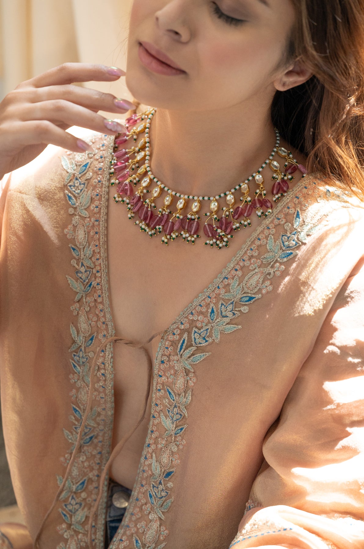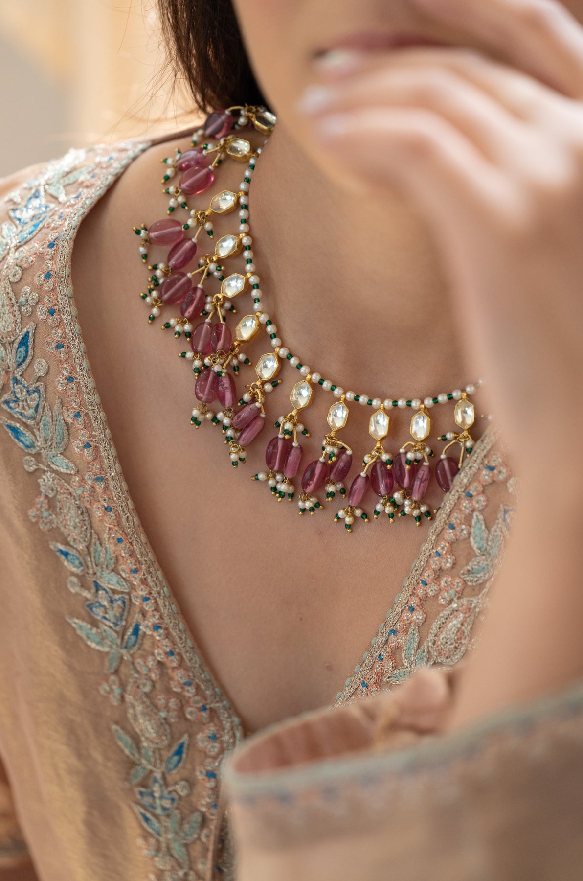Add a splash of charm with the Kamini Pink Kundan Necklace, where lustrous pearls meet sparkling kundan and vibrant pink natural stones. This contemporary piece brings playful elegance to any outfit, perfect for those who love to mix tradition with a pop of modern color.