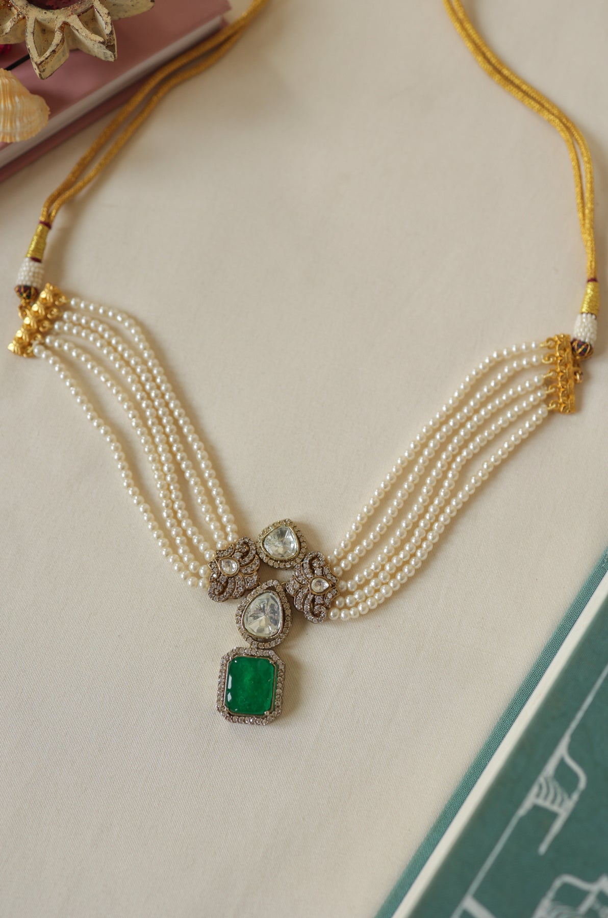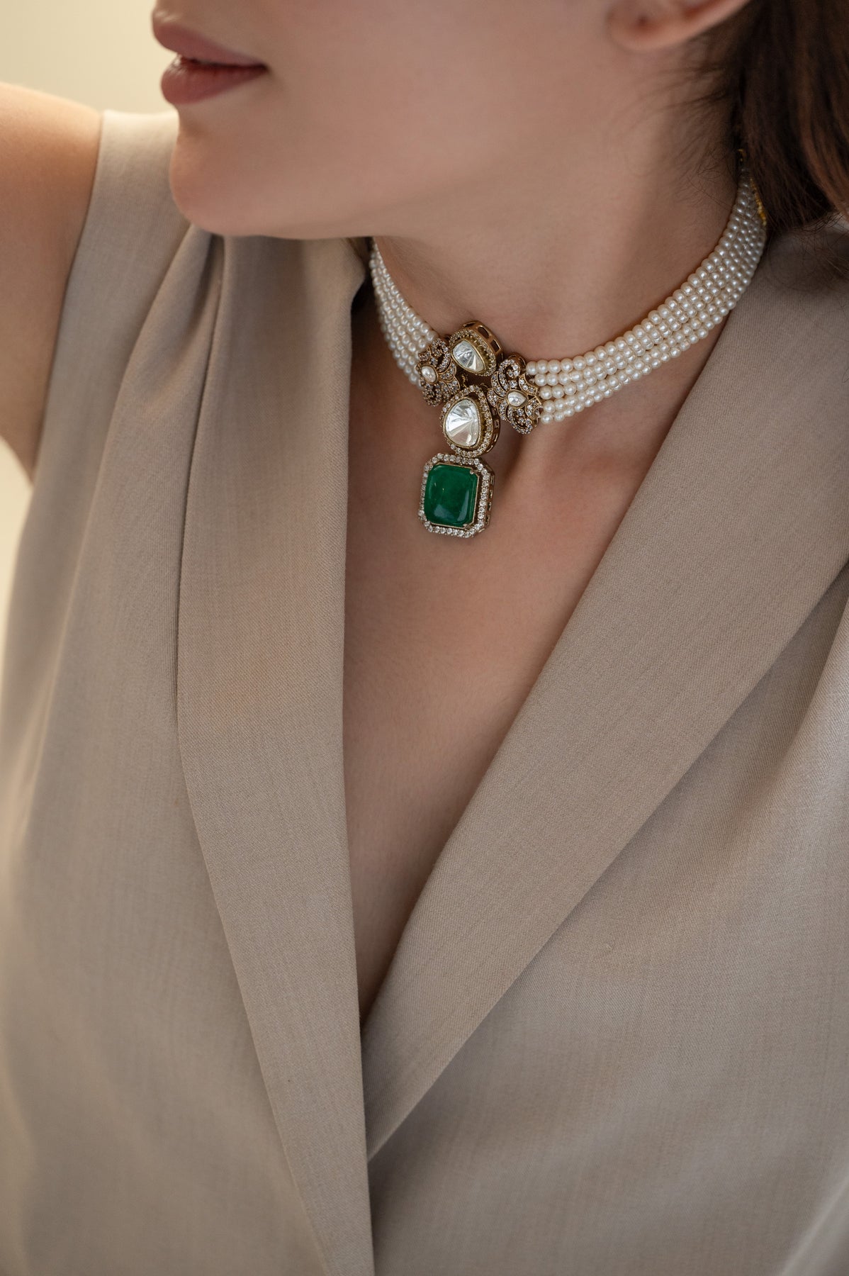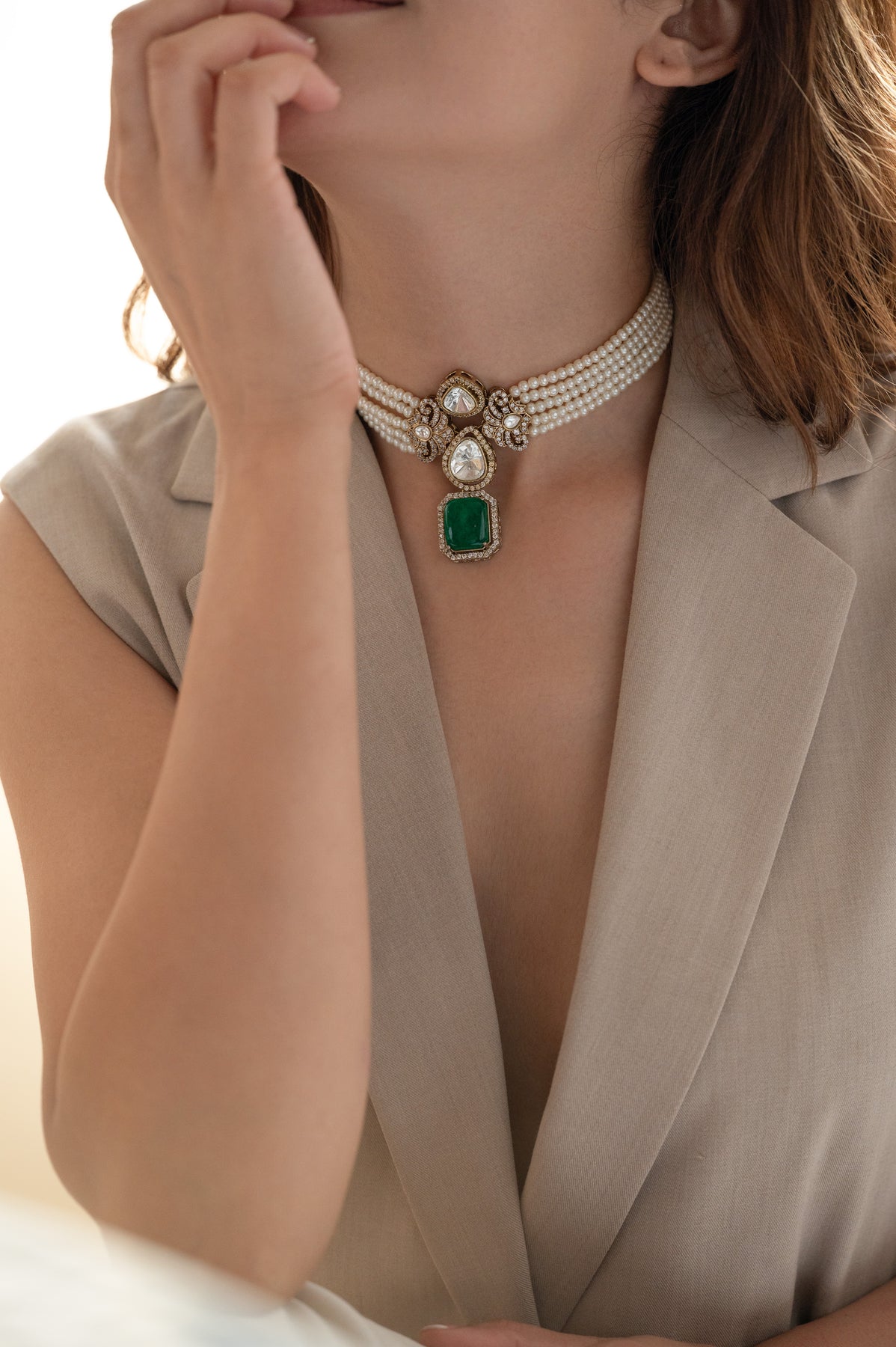 Elevate your traditional look with this stunning pearl choker. Featuring multiple strands of shimmering pearls, it boasts a captivating centerpiece with a striking emerald-cut green stone framed by brilliant polki work. This choker is an ideal choice for adding sophistication and a touch of color to your festive or celebratory attire. The intricate gold-toned design and rich materials make this choker an heirloom-worthy piece, designed to make a truly unforgettable statement at weddings, galas, and special occasions.