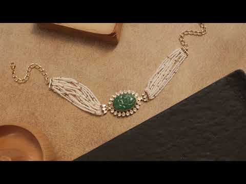 Indulge in the opulent beauty of our Radika fine silver polki choker. Inspired by the royal and simple charm, this choker boasts old traditional work embellished with delicate pearls. The intricate traditional work at the center is adorned with moissanite polkis and green carved stone, making it a luxurious addition to your jewelry collection.