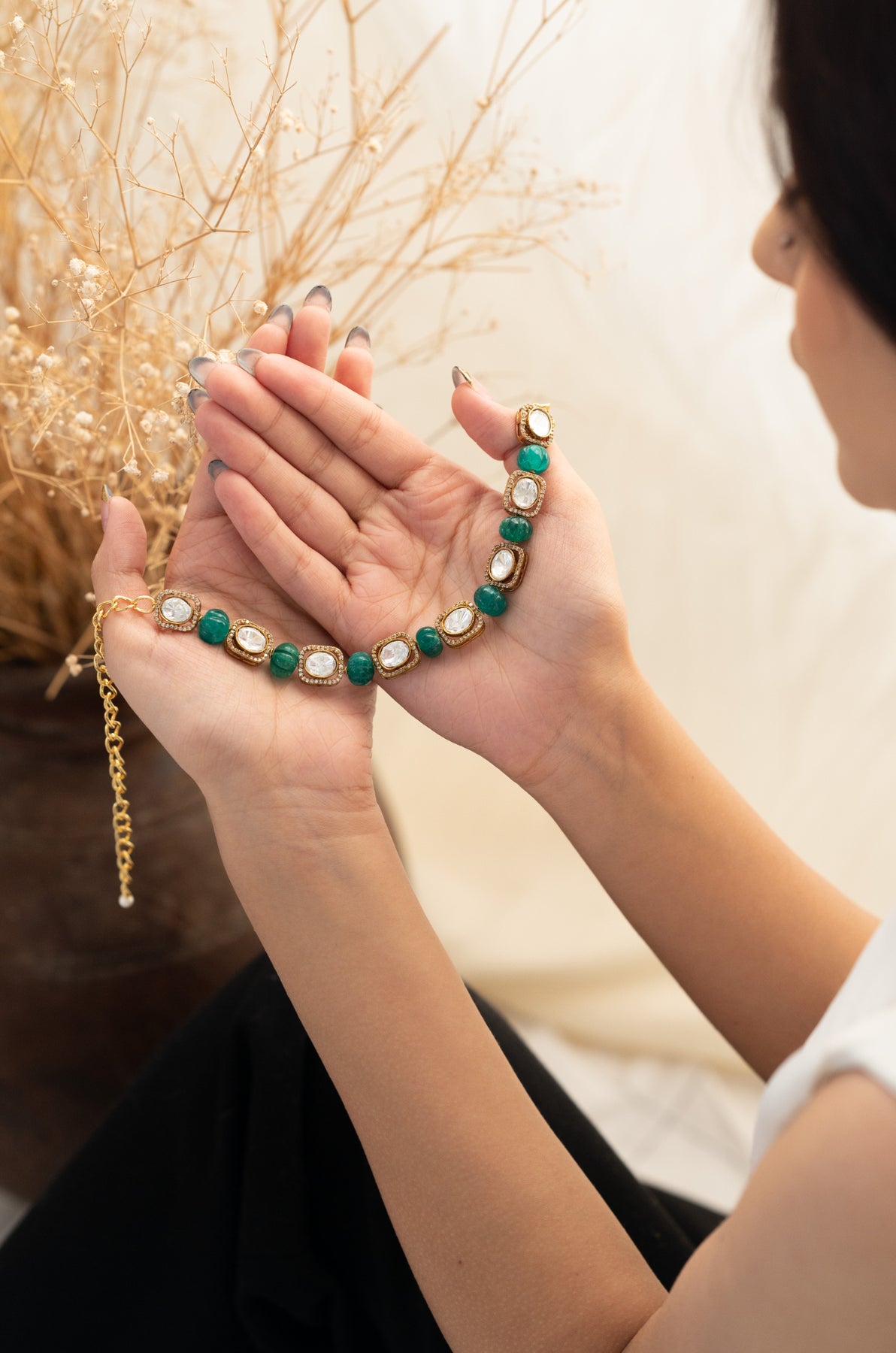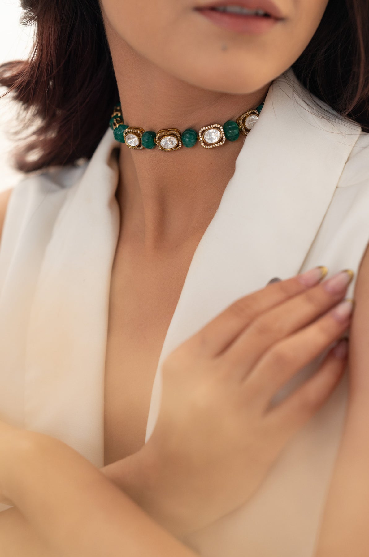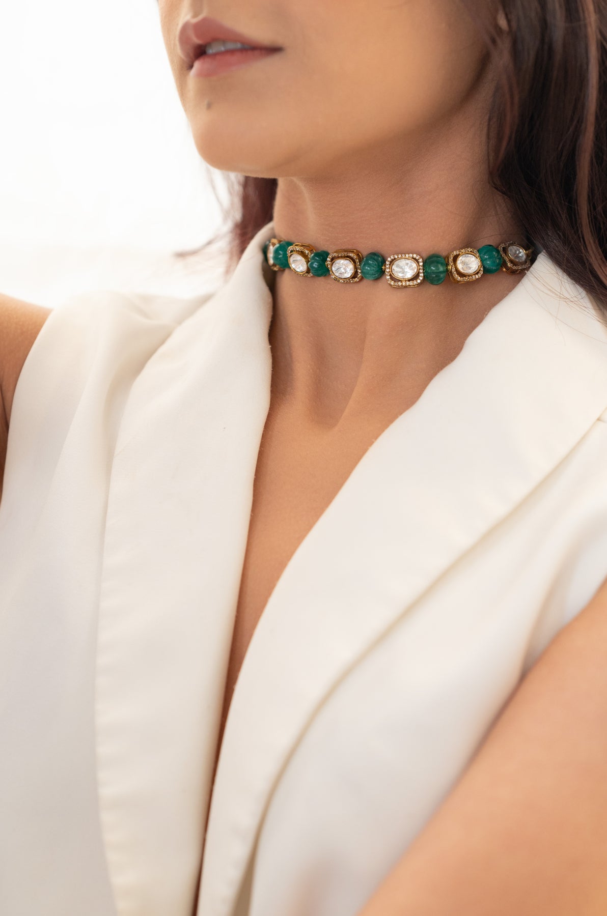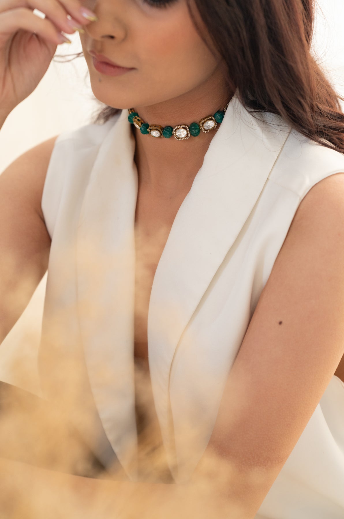 This striking Riaan choker is designed for the fearless fashionista who refuses to blend in. Adorned with luminous uncut polkis and vibrant green stones, it wraps around the neck with undeniable grace and presence. Perfect for those who speak through their accessories, this piece transforms any look into a show-stopping moment- bold, unapologetic, and absolutely unforgettable.
