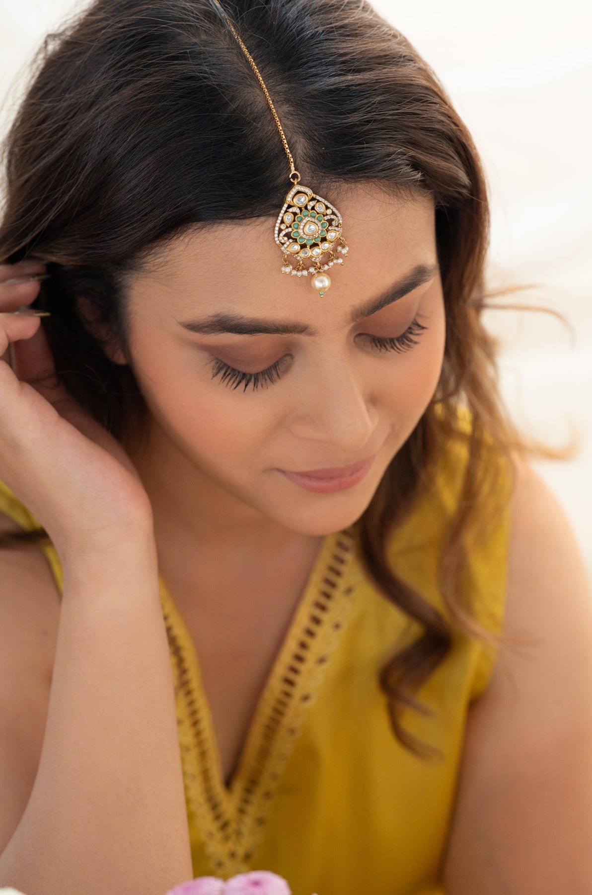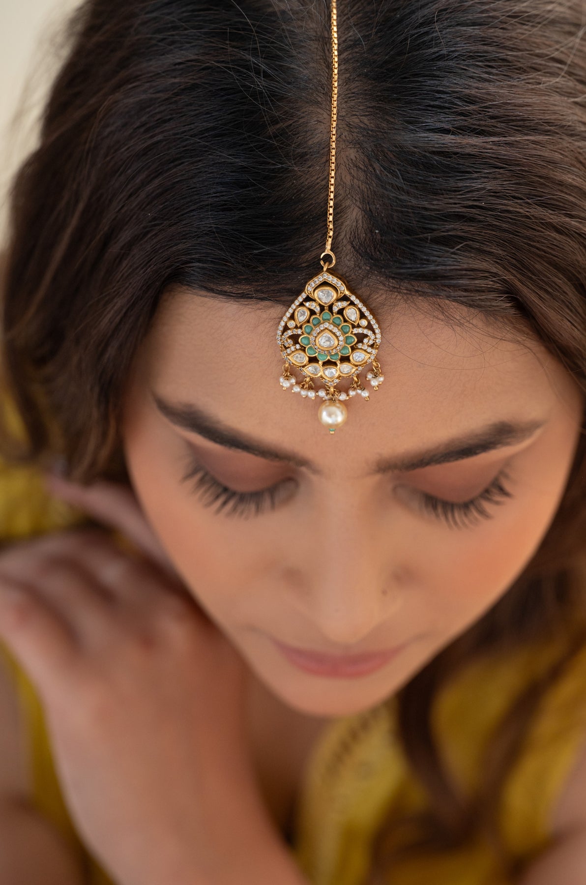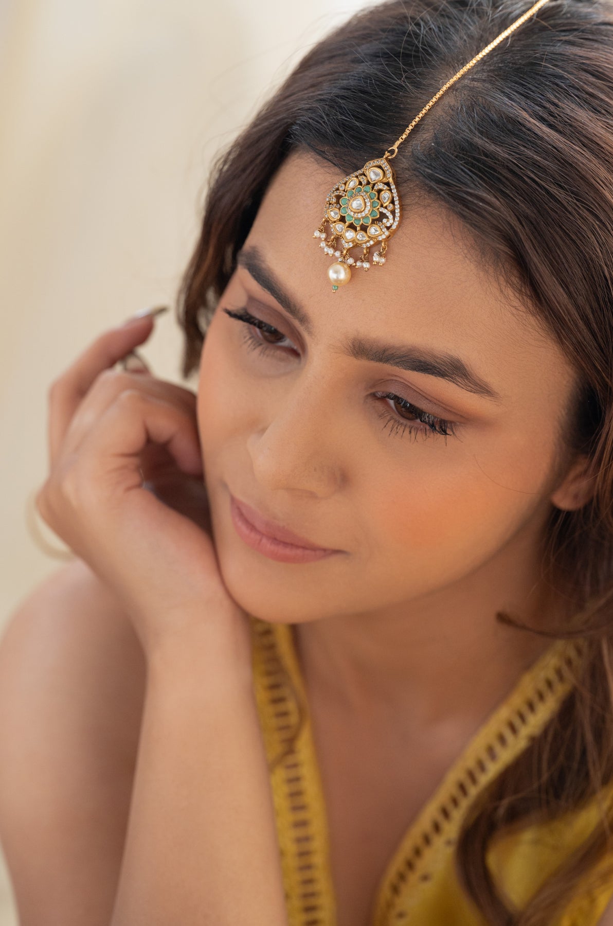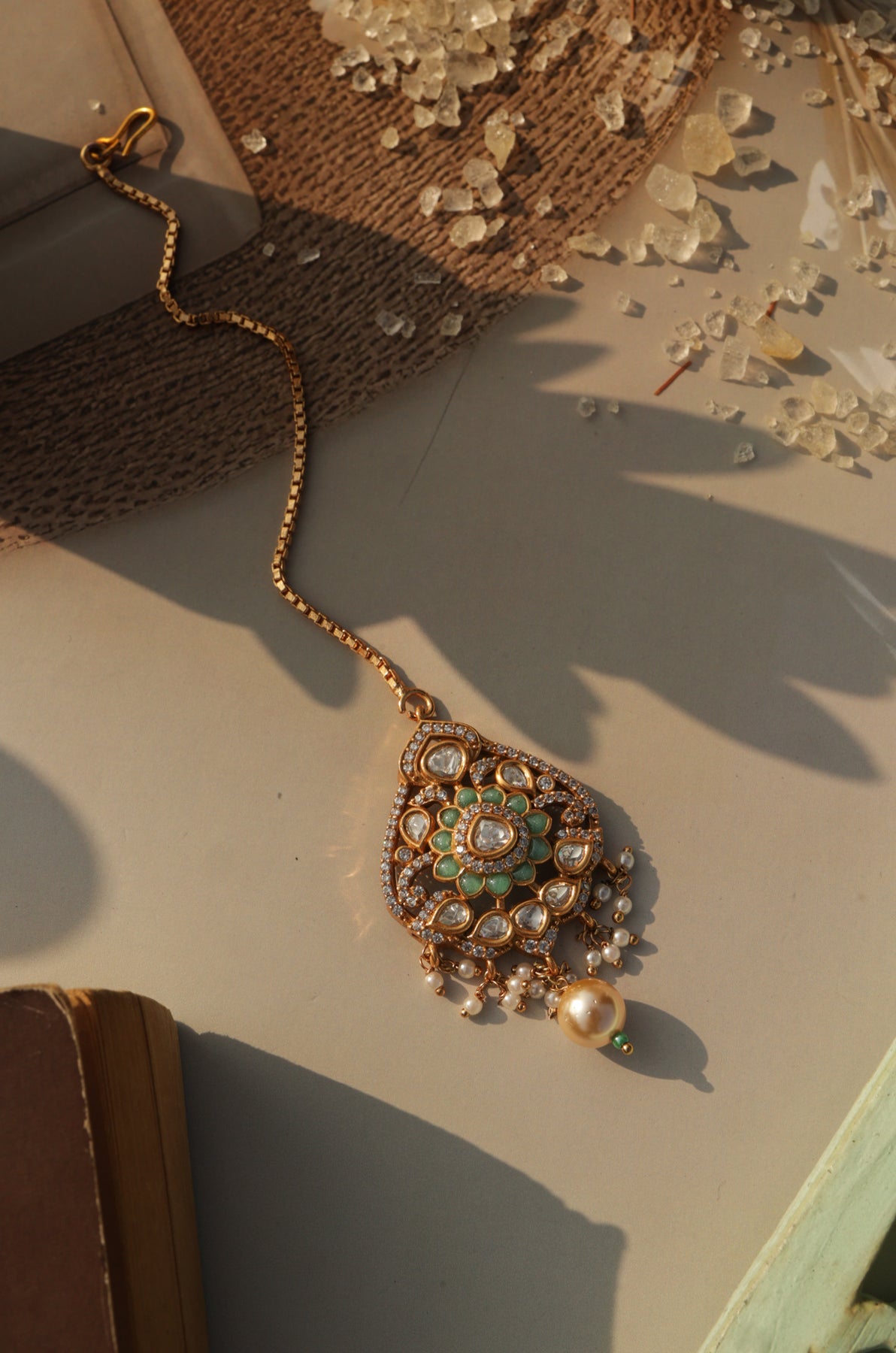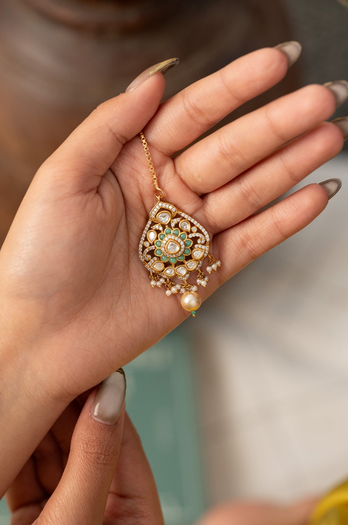 Elevate your style with the stunning Aabida turquoise polki maangtikka, adorned with a mesmerizing polki encrusted design and accented with lustrous pearls and vibrant turquoise stones. This exquisite piece adds a modern flair to any ensemble.