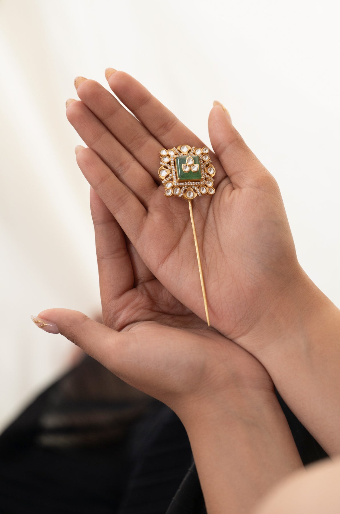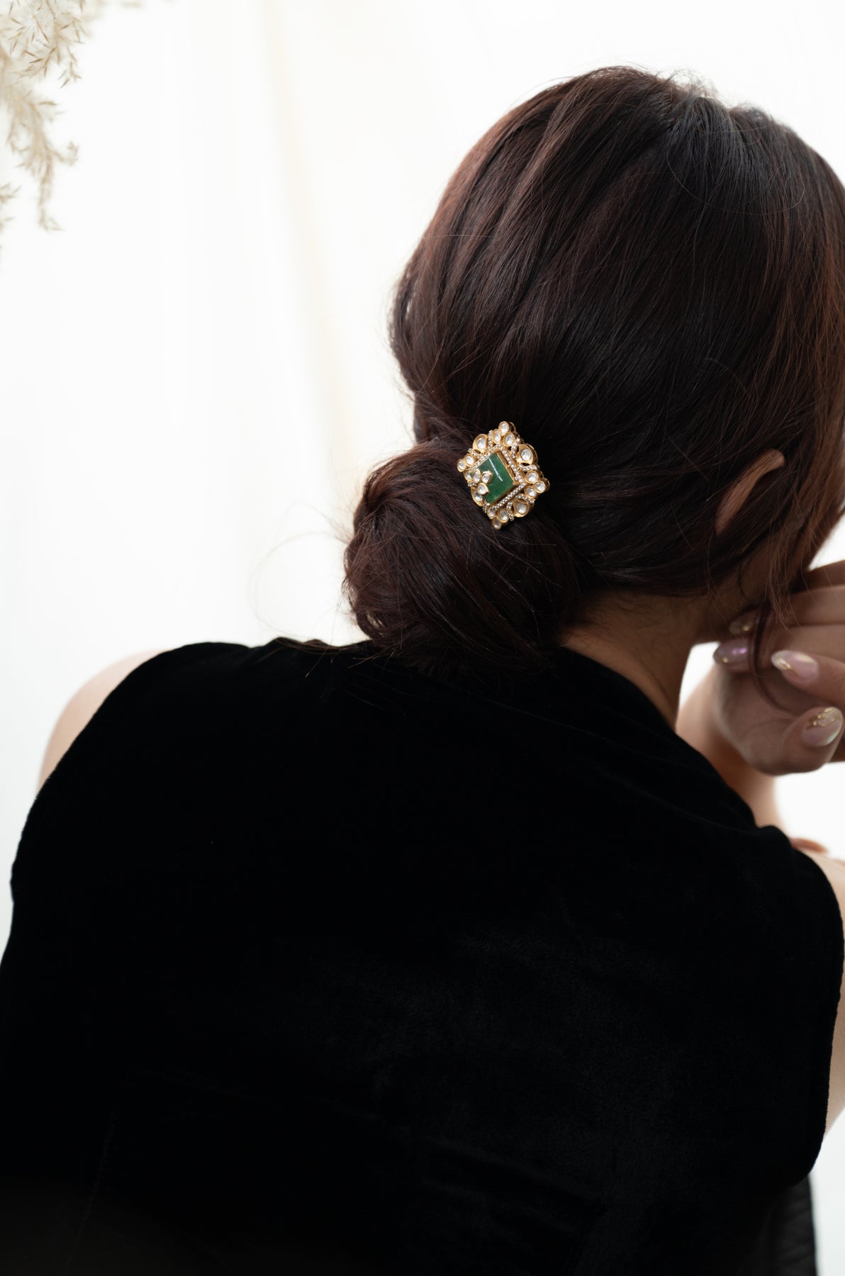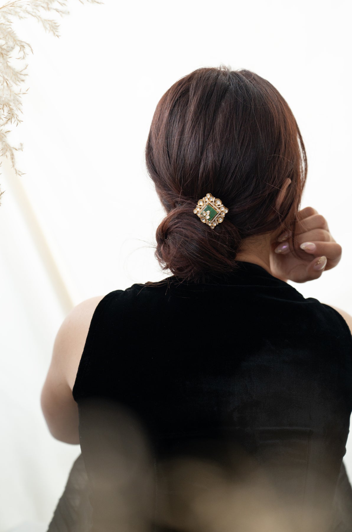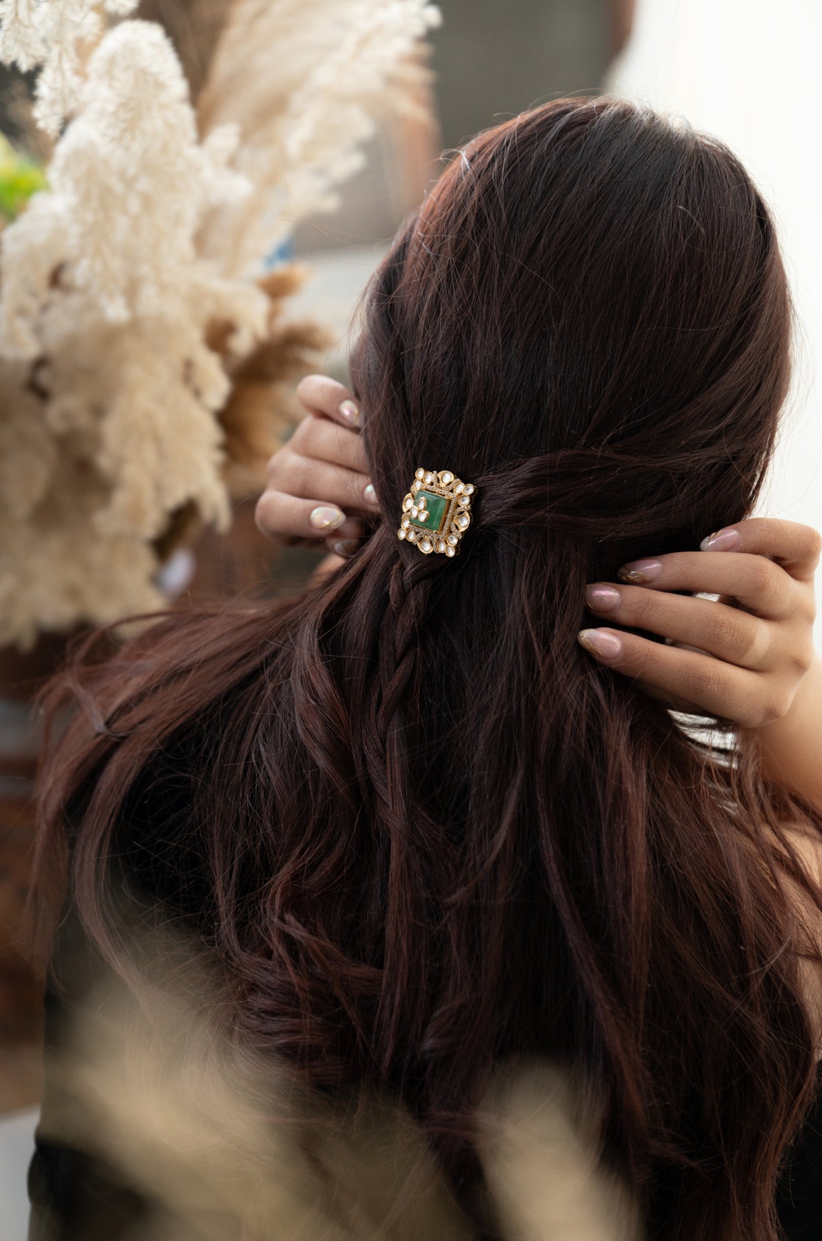 Elevate your braid game with this stunning Ezmee braid pin! Adorned with uncut polkis that catch the light beautifully, complemented by sparkling cubic zirconia and calming fluorite stone accents, this piece brings together traditional elegance and modern flair. Perfect for securing your braids while adding a touch of glamour to any hairstyle. Whether you're heading to a celebration or just want to jazz up your everyday look, this braid pin is your go-to accessory for that extra sparkle and charm.