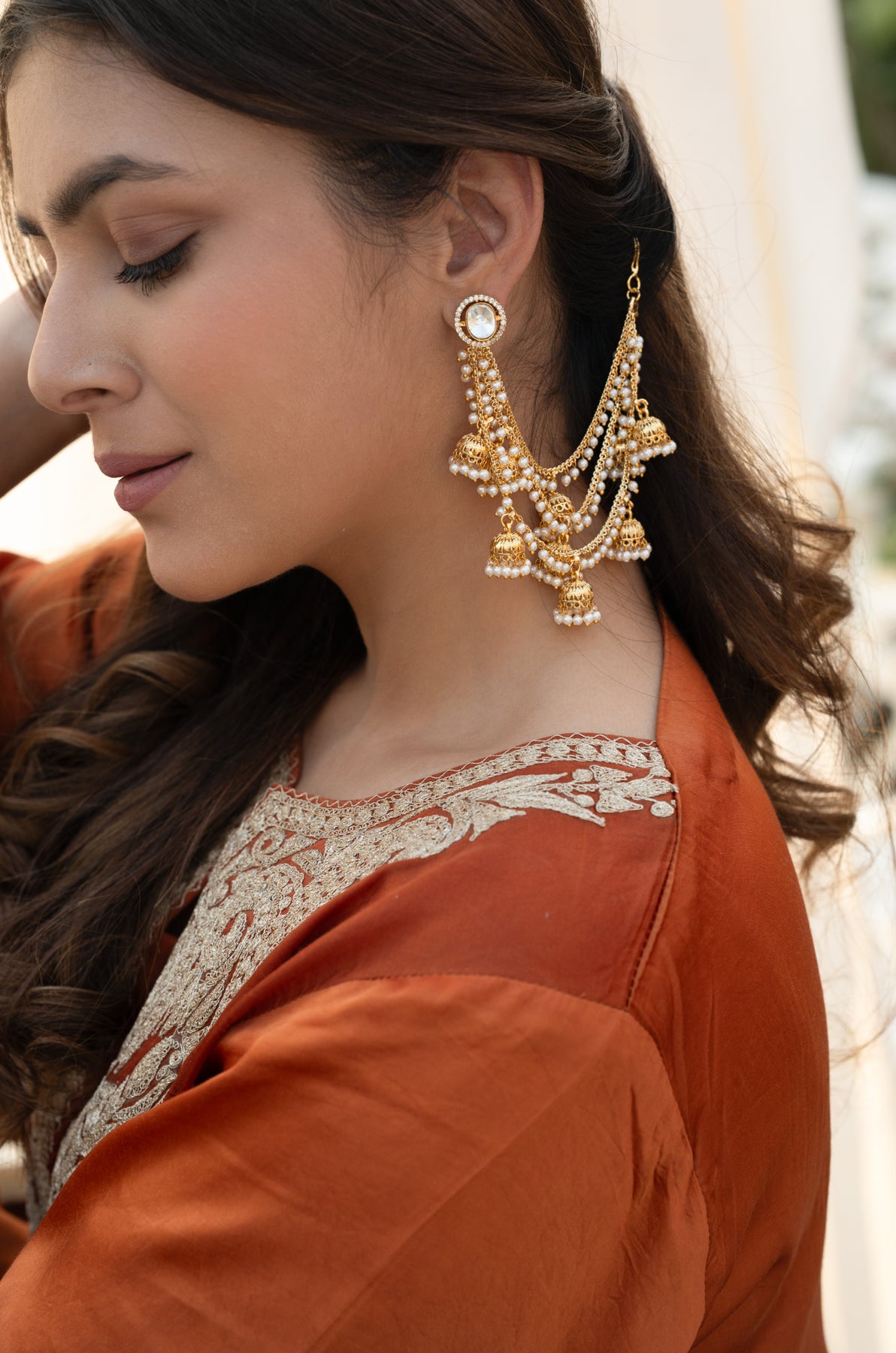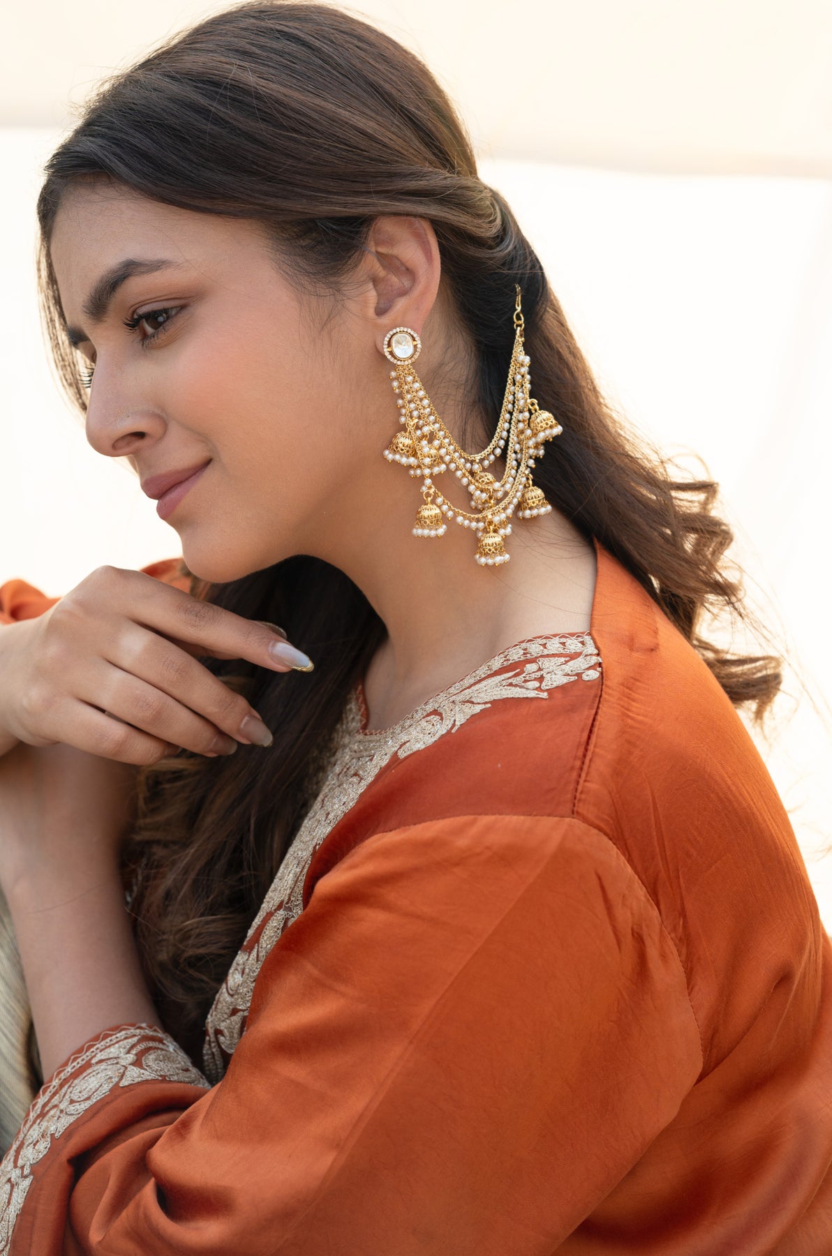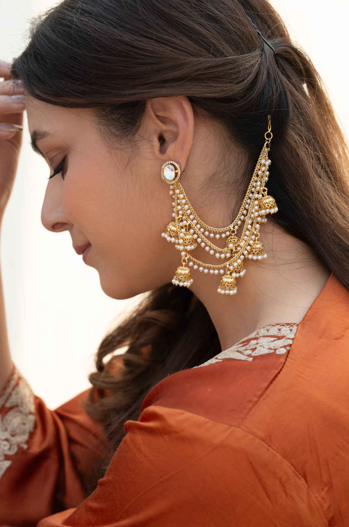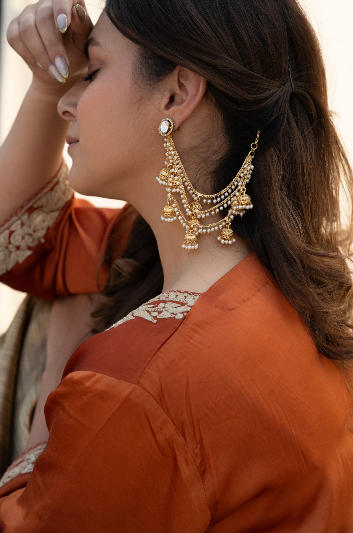 Swing into tradition with the Panna kaan chain! This charming ear accessory celebrates timeless elegance with delicate jhumkis that catch the light beautifully. Connected by a graceful chain, the lustrous pearls add a soft, sophisticated touch to your festive look. Perfect for weddings, celebrations, or whenever you want to channel classic Indian glamour, this piece lets your ears do the talking with playful, pendulous charm.
