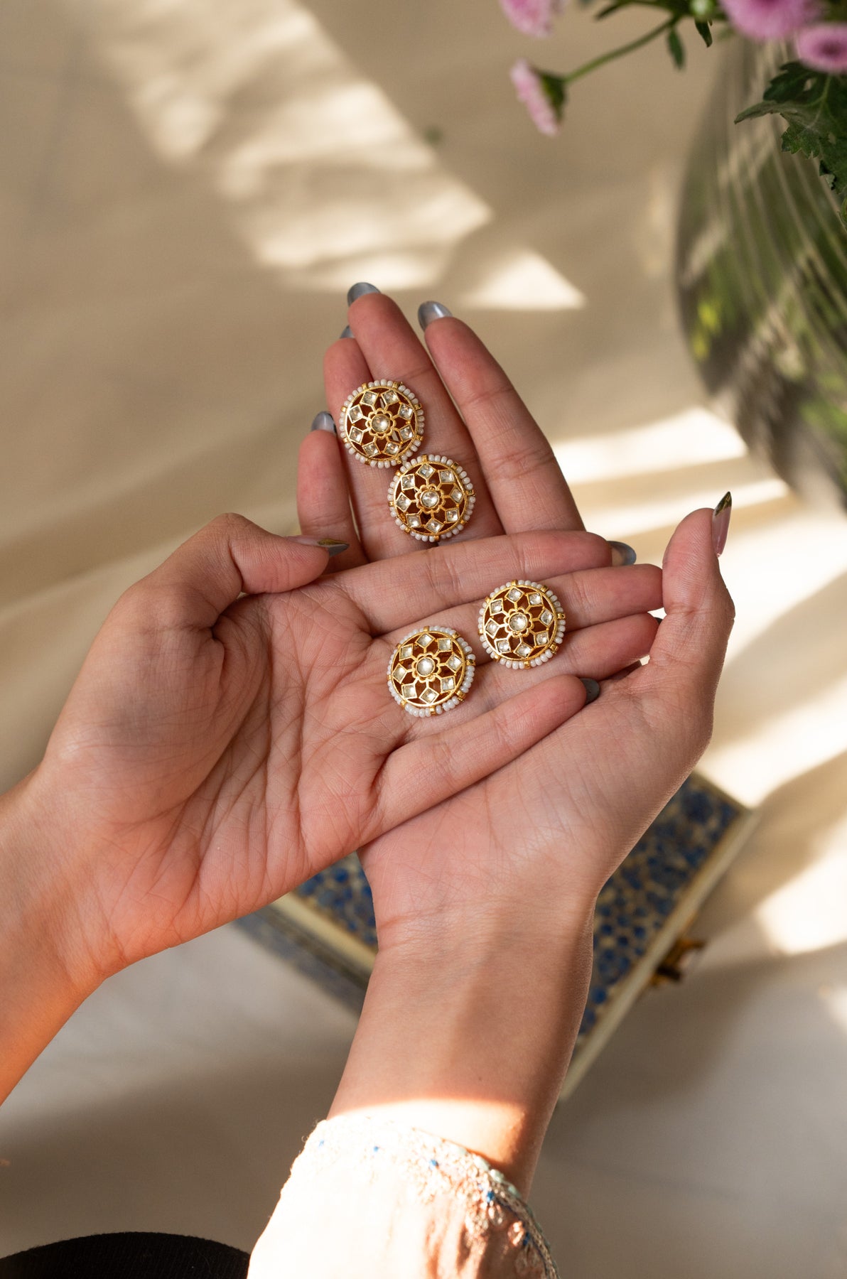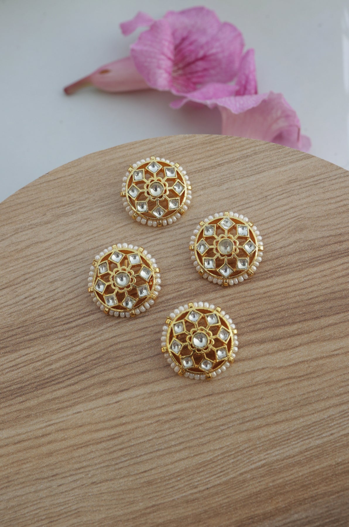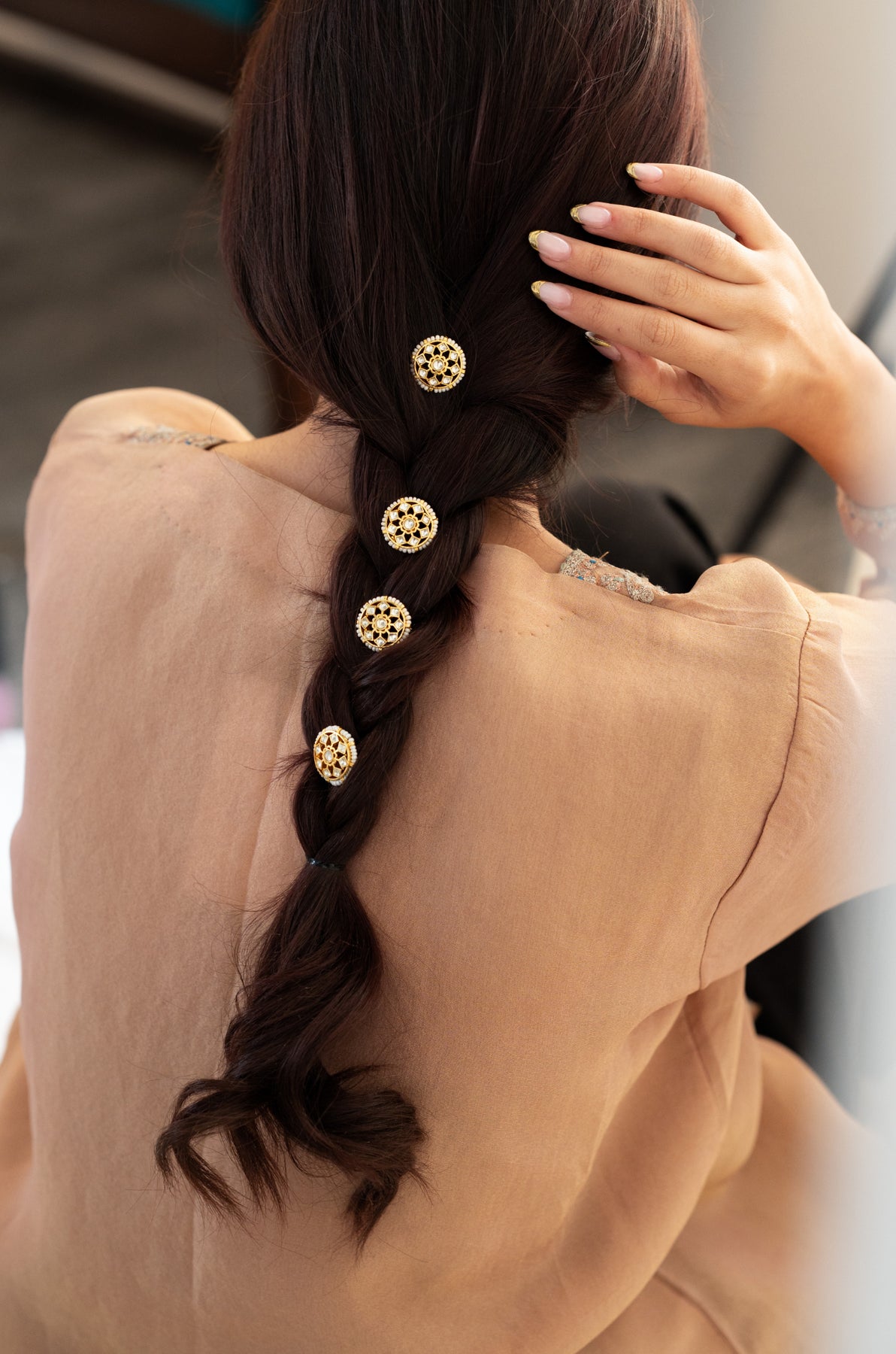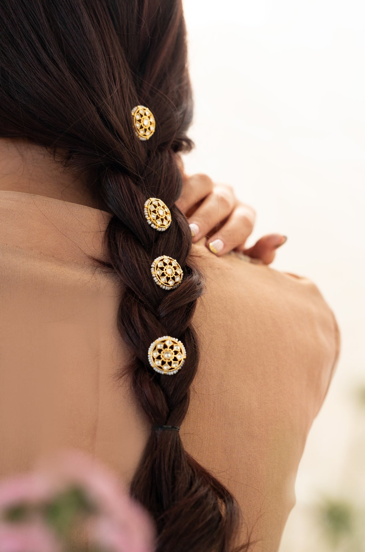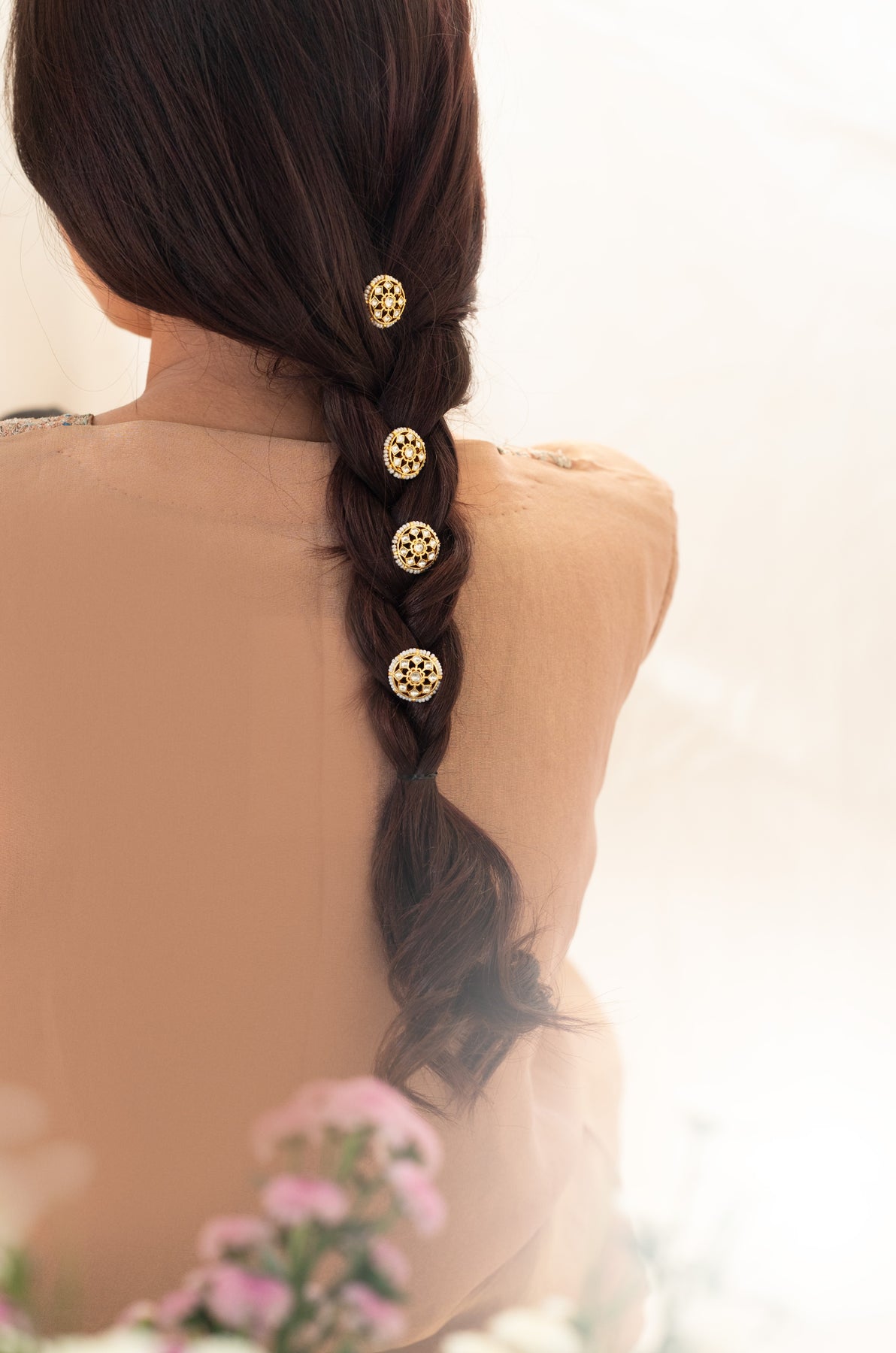 Introducing Timara floral braid pins, a set of four effortlessly chic hair accessories. Elevate your hair game with these traditional yet stylish pins, featuring exquisite floral kundan work. Embrace luxury and Indian design with this perfect finishing touch.