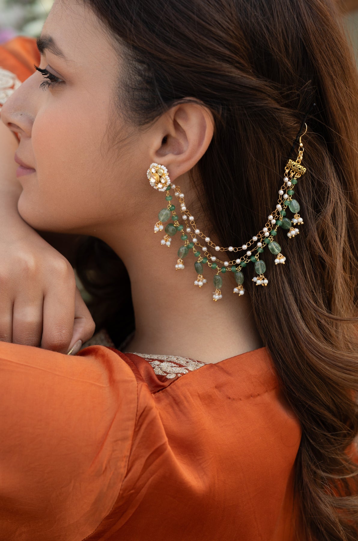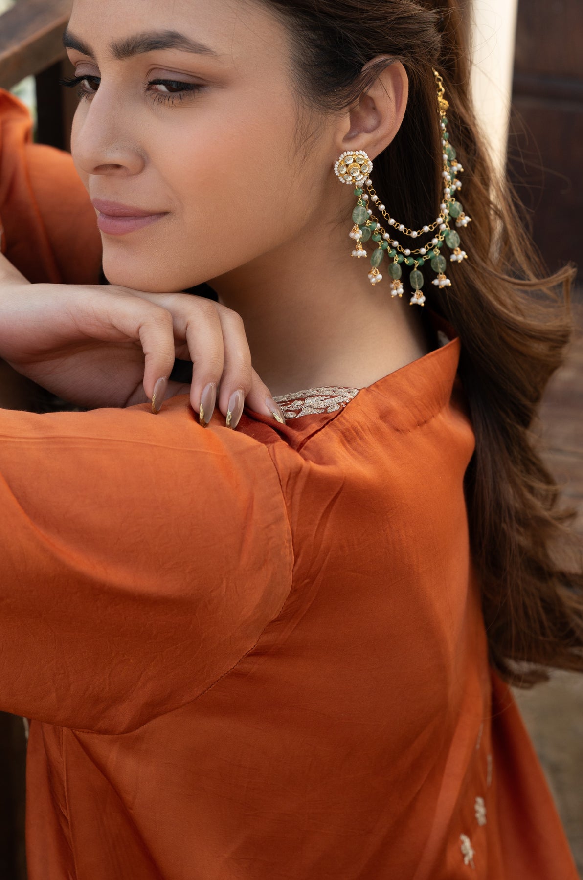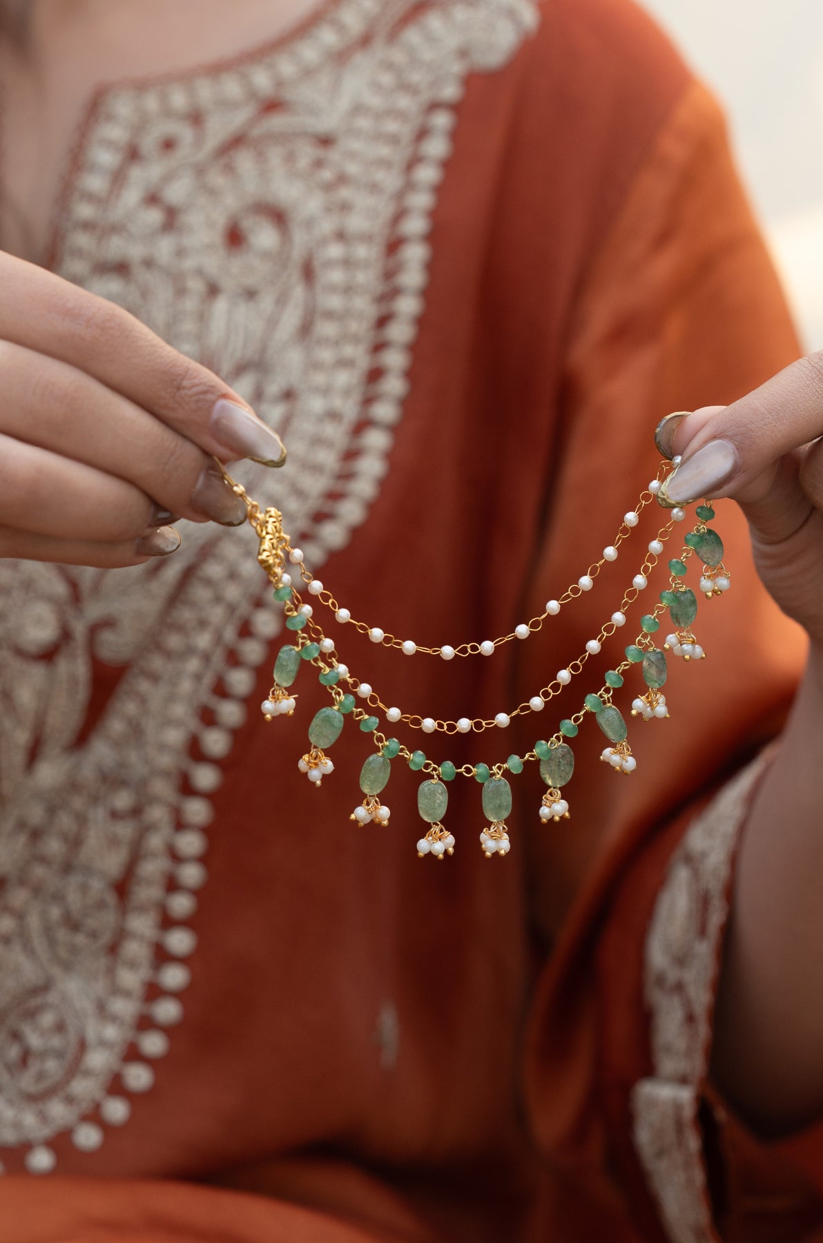 Swing into tradition with the Zahra kaan chain! This charming ear accessory celebrates timeless elegance with delicate jhumkis that catch the light beautifully. Connected by a graceful chain, the lustrous pearls add a soft, sophisticated touch to your festive look. Perfect for weddings, celebrations, or whenever you want to channel classic Indian glamour, this piece lets your ears do the talking with playful, pendulous charm.