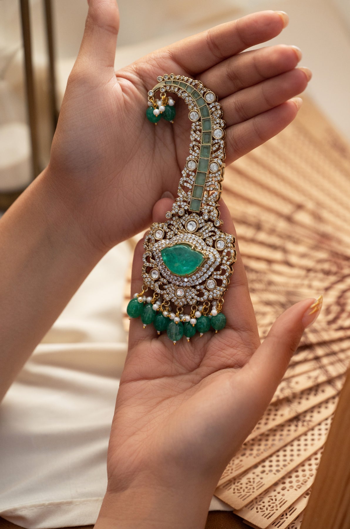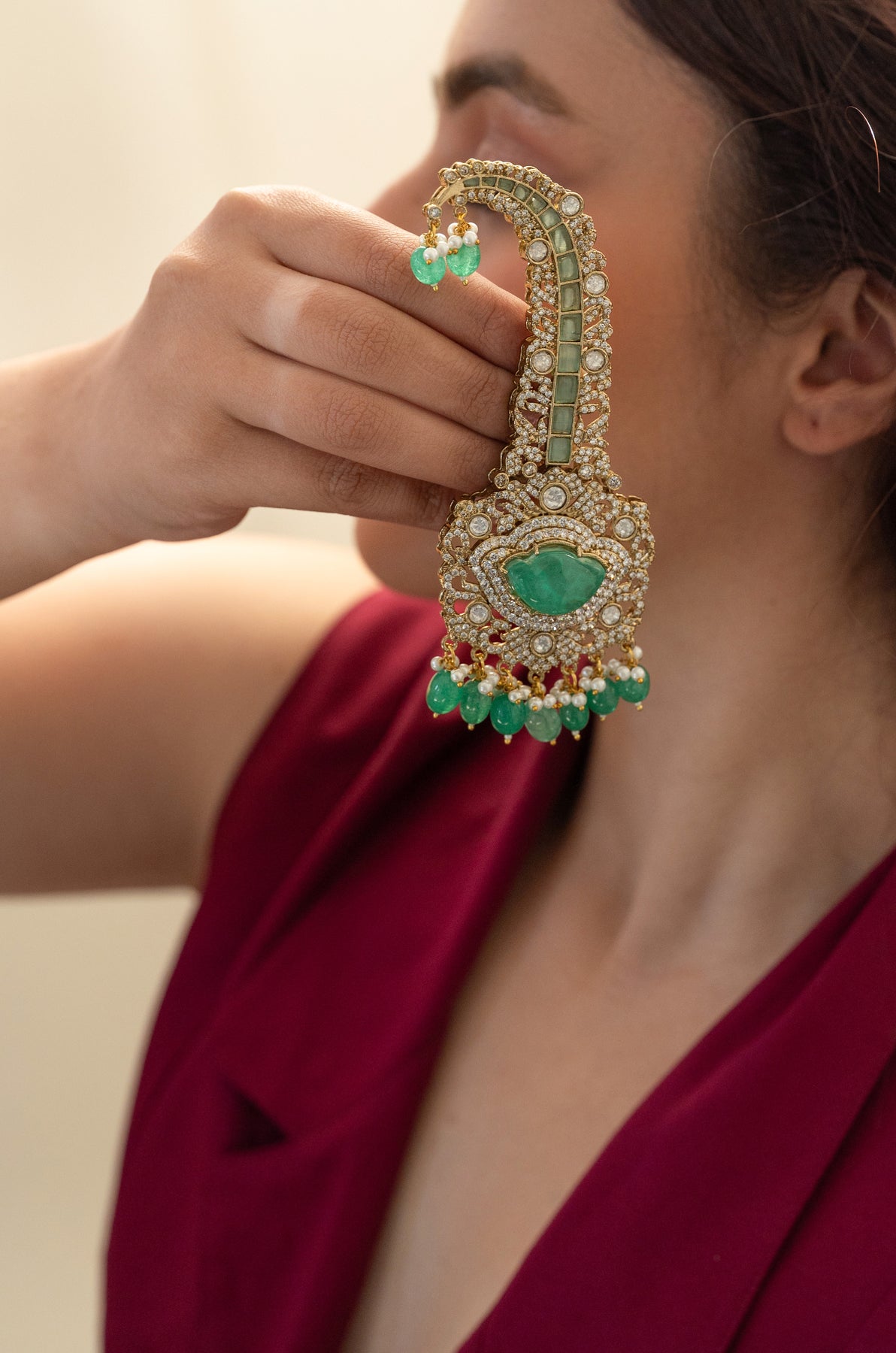 Introducing the Zaveri kalgi where timeless elegance meets playful charm! This exquisite piece features uncut polkis that catch light like captured starlight, paired with shimmering zirconia and lustrous pearls for a wedding-day wow factor. Delicate fluorite stones add a serene, ethereal touch that whispers sophistication. Perfect for brides seeking something beautifully unique, this kalgi transforms any celebration into a moment of pure magic. Wear it and let your inner radiance shine through!