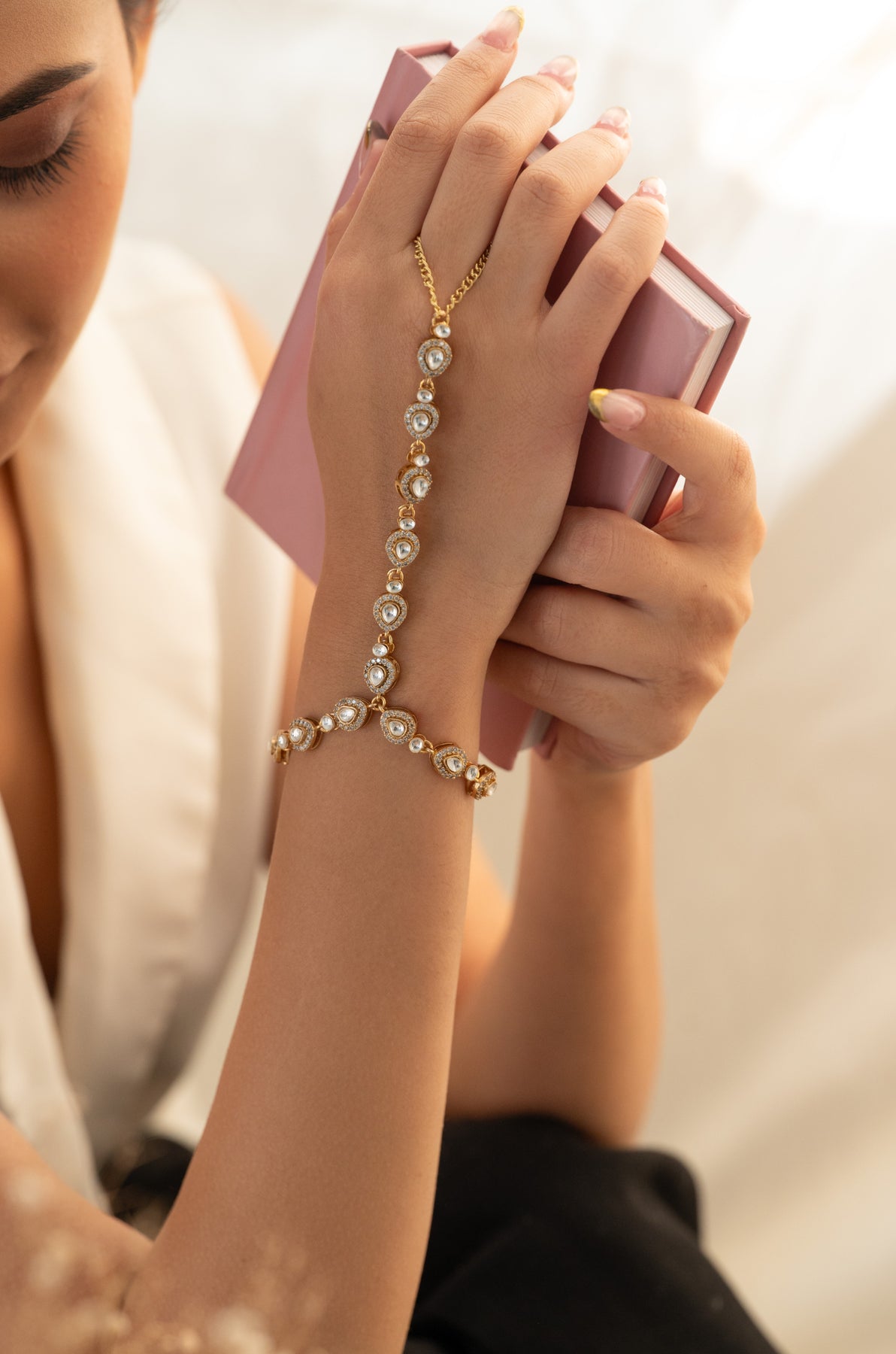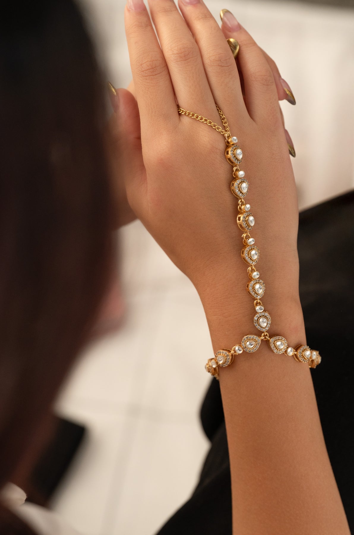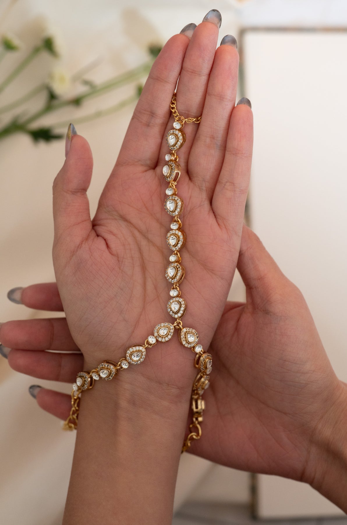 Elevate your wrist game with this charming polki hathphool bracelet that's equal parts timeless tradition and modern edge. The intricate floral polki work brings that perfect blend of cultural elegance and understated sophistication, ideal for anyone who loves making a statement without shouting about it. Whether you're dressing up or keeping it casual, this beauty adds just the right touch of sparkle and heritage to your everyday look.