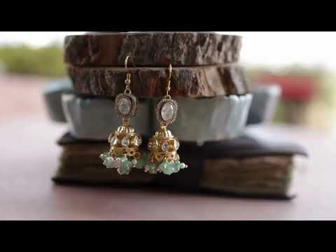 Indulge in luxury with our Deshi polki jhumka earrings. These stunning pieces feature a unique design and are embellished with intricate polki and kundan work. The top polki is outlined with sparkling cubic zirconia, adding an extra touch of elegance. Complete your look with the added dainty touch of mint green onyx stones. A must-have for any exclusive collection.