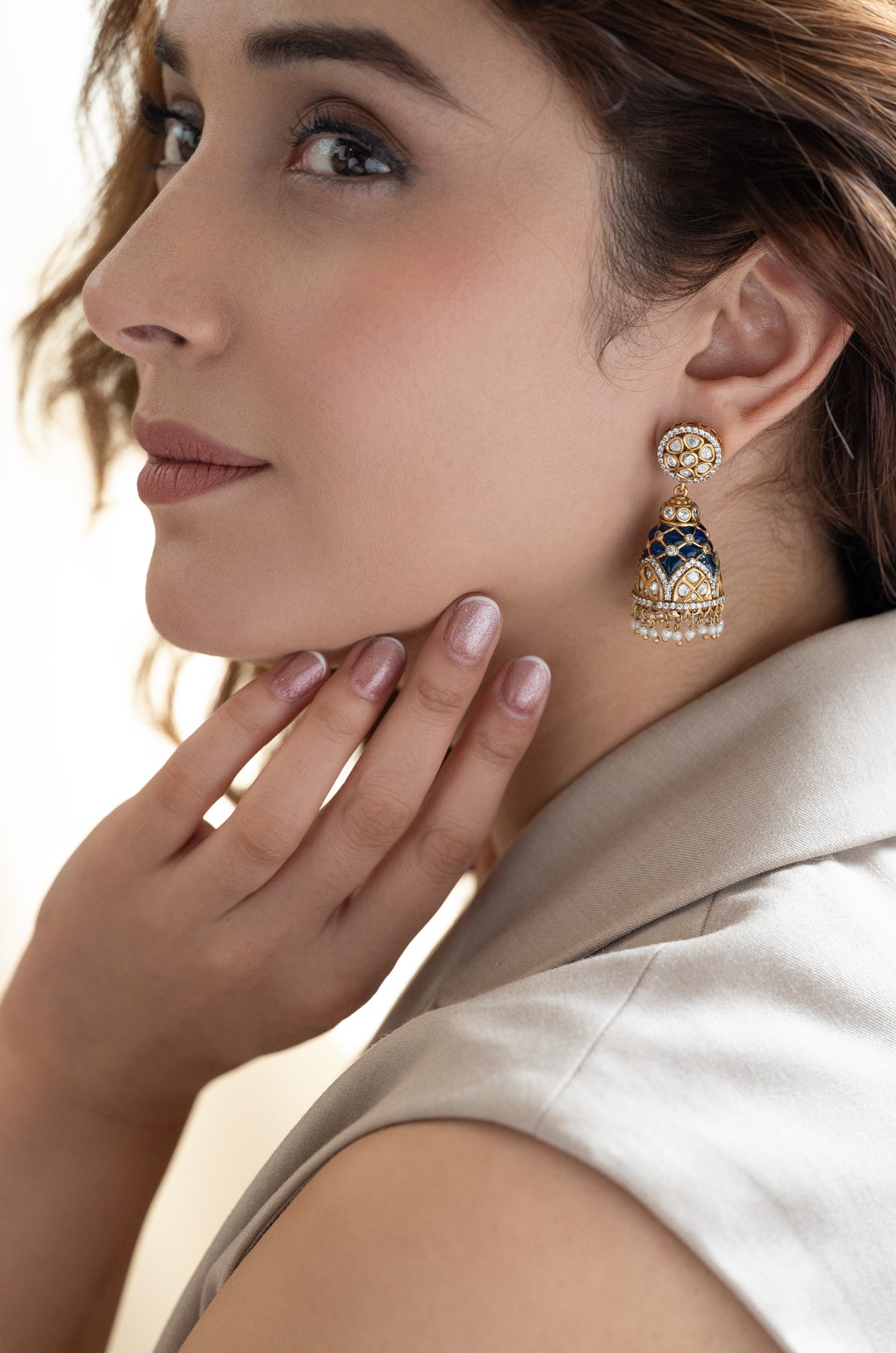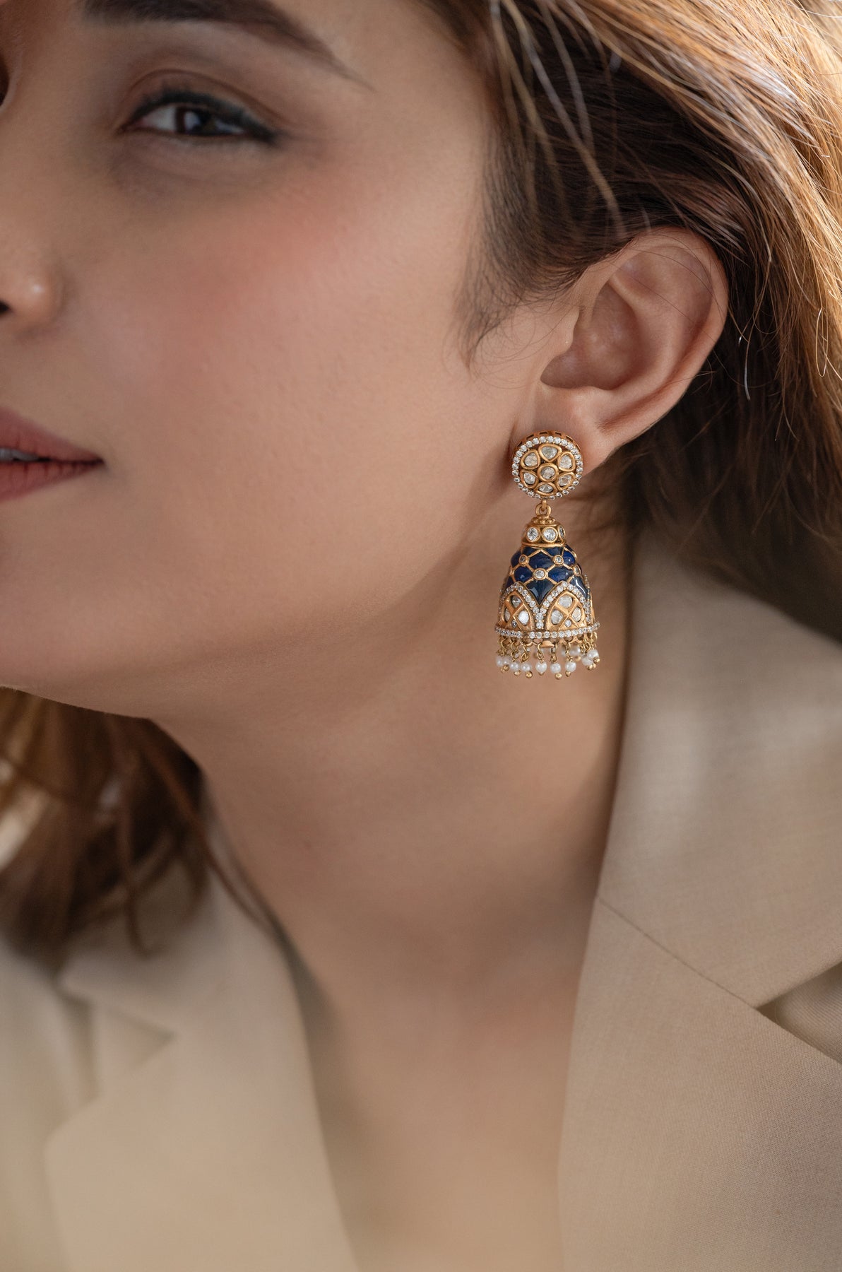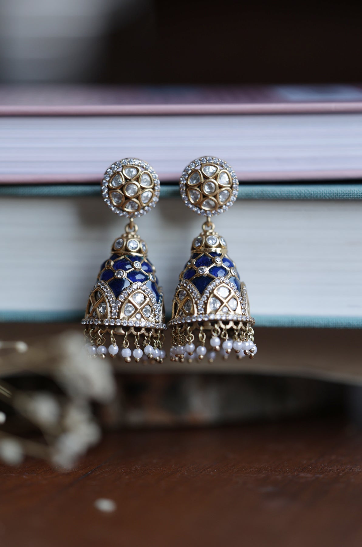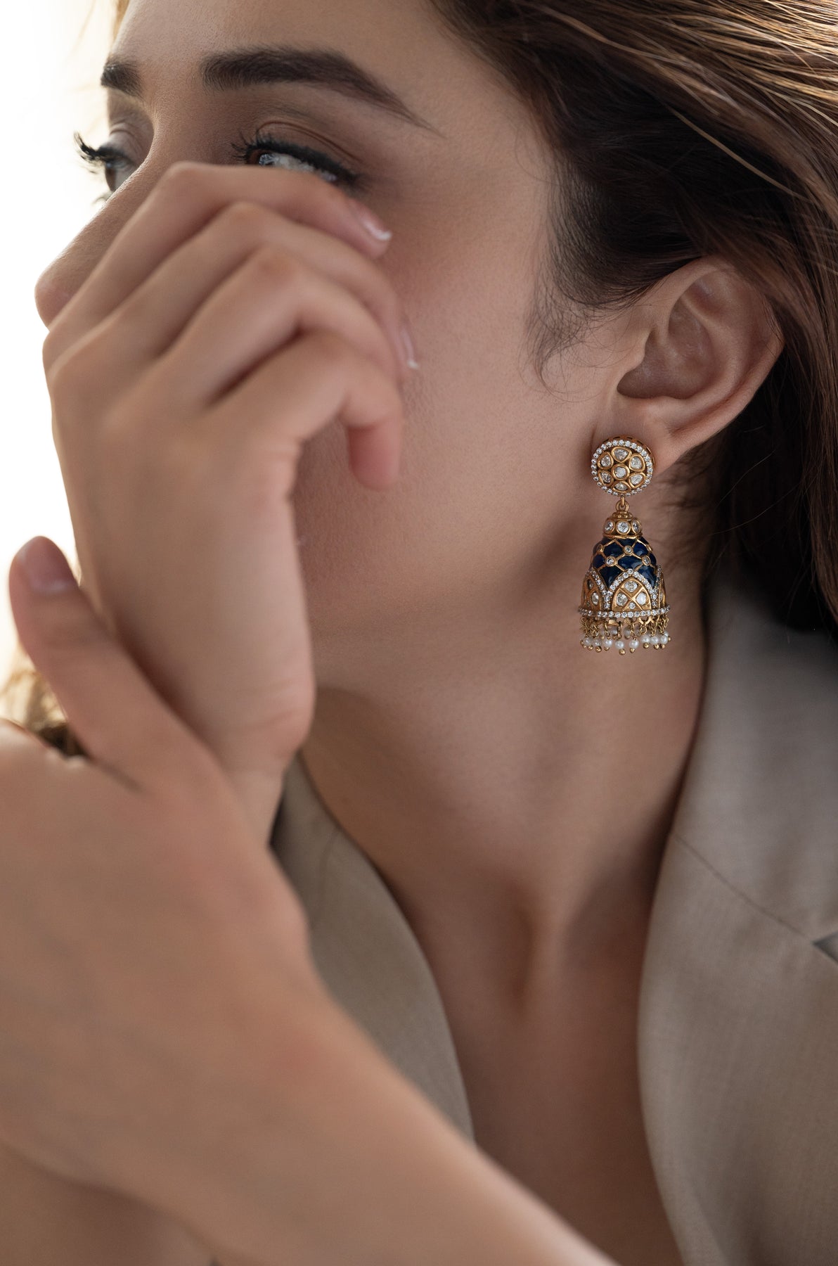 A royal affair with a playful twist, meet the Ifra jhumkas, where tradition takes a glamorous spin! These beauties feature a dome of midnight blue enamel, crowned with a lattice of glittering polkis and delicate white stones. The intricate detailing is oh-so-regal, while the tiny pearl clusters at the base add that delightful jingle-jangle charm we all secretly adore