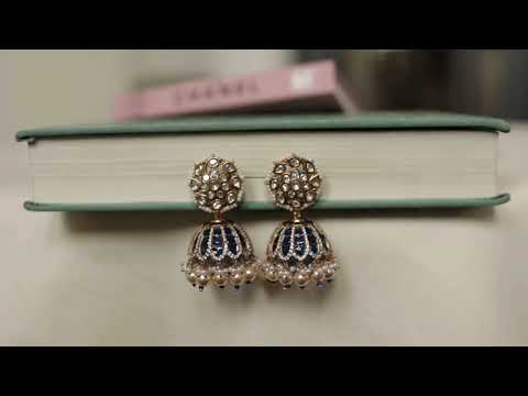 Quirky Oshin earrings with swinging kundan jhumkas adorned with gorgeous blue stones. Beautifully made with intricate details for a touch of heritage. Inspired by Indian jewelry, it's a delightful blend of timeless tradition and modern style, accented with charming floral polki accents. Perfect for any occasion and a must-have in your stunning jewelry collection.