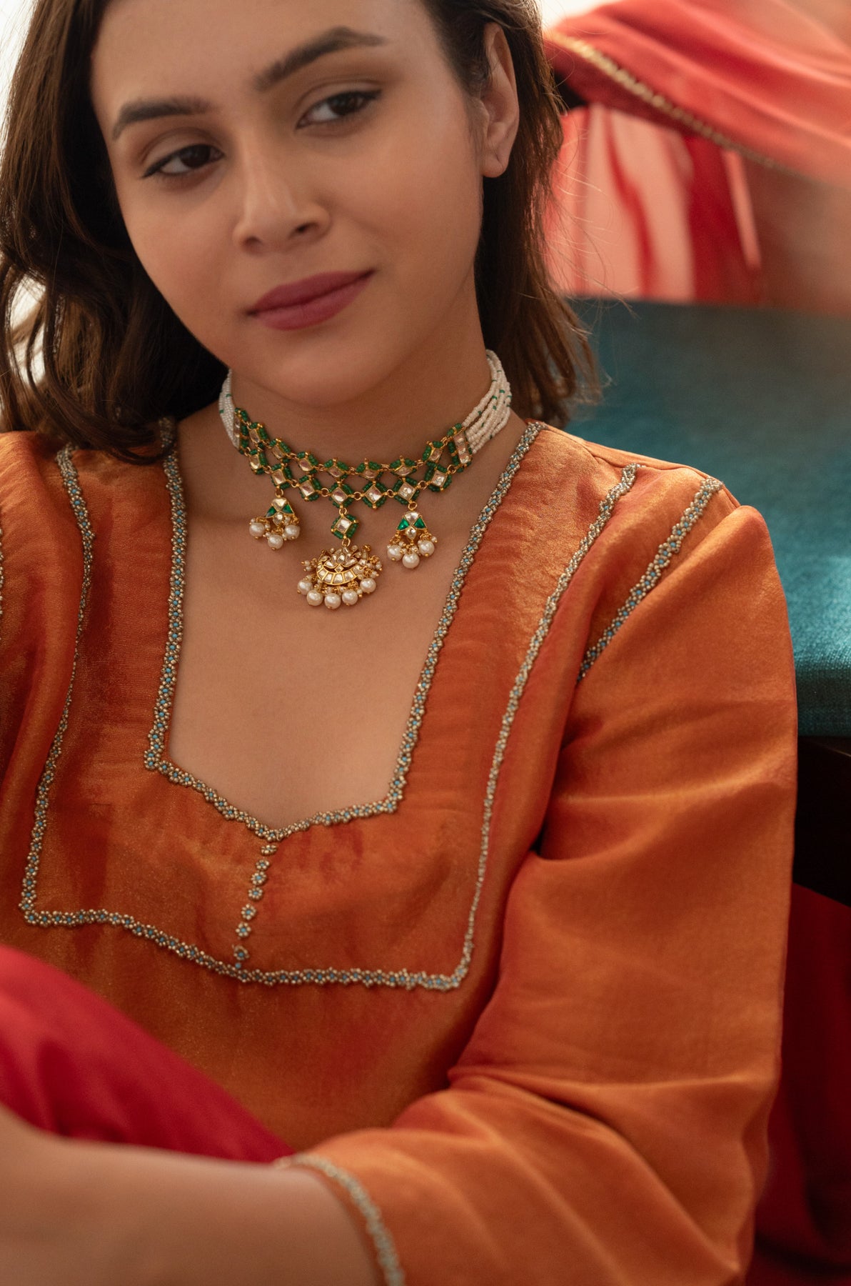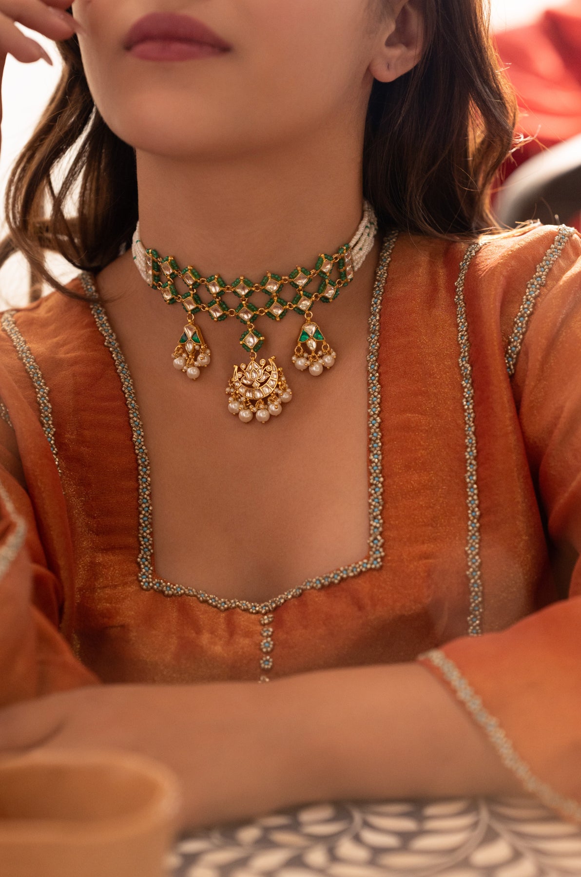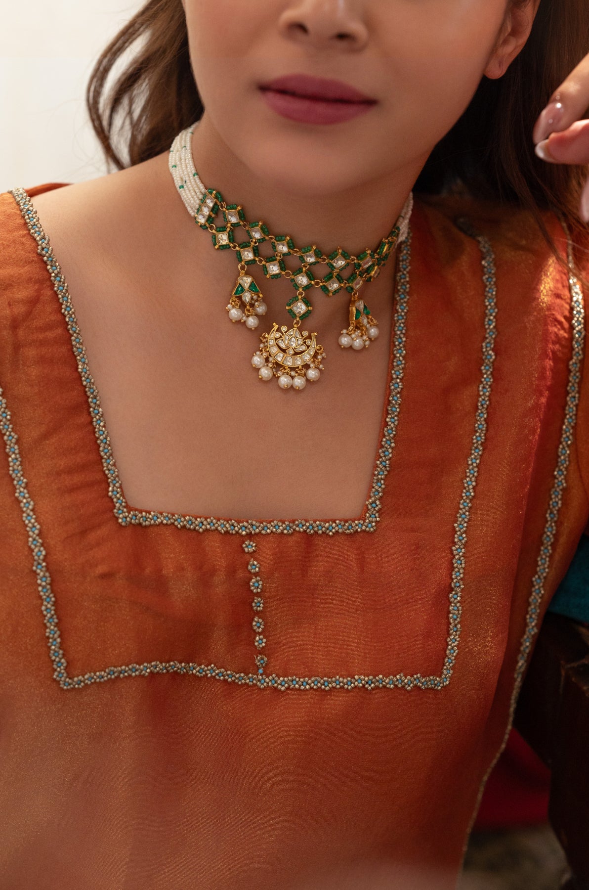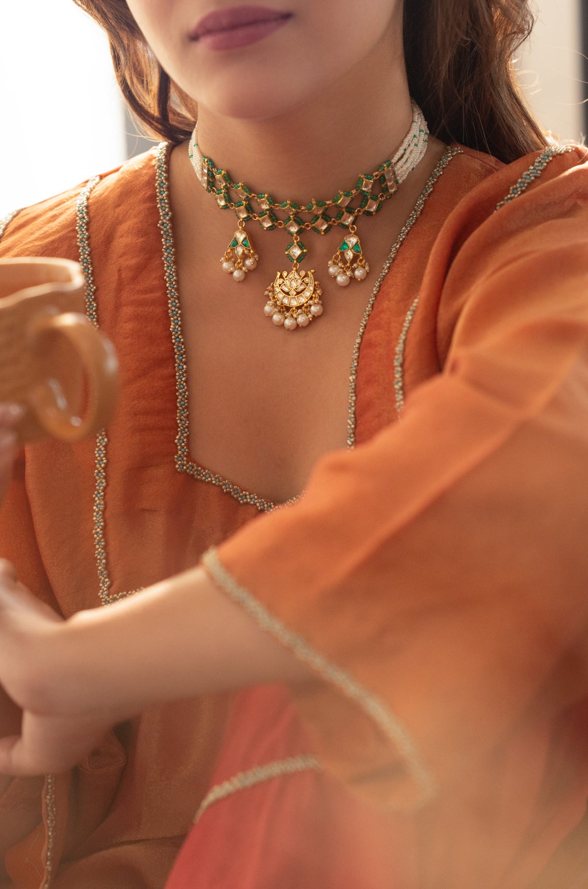 This Anika necklace sparkles with strewn pearls and dazzling kundan stones, all beautifully outlined with vibrant green hydro stones. Highlighted carefully with pearls, it adds a playful twist to the traditional design, perfect for adding charm and color to your festive looks.