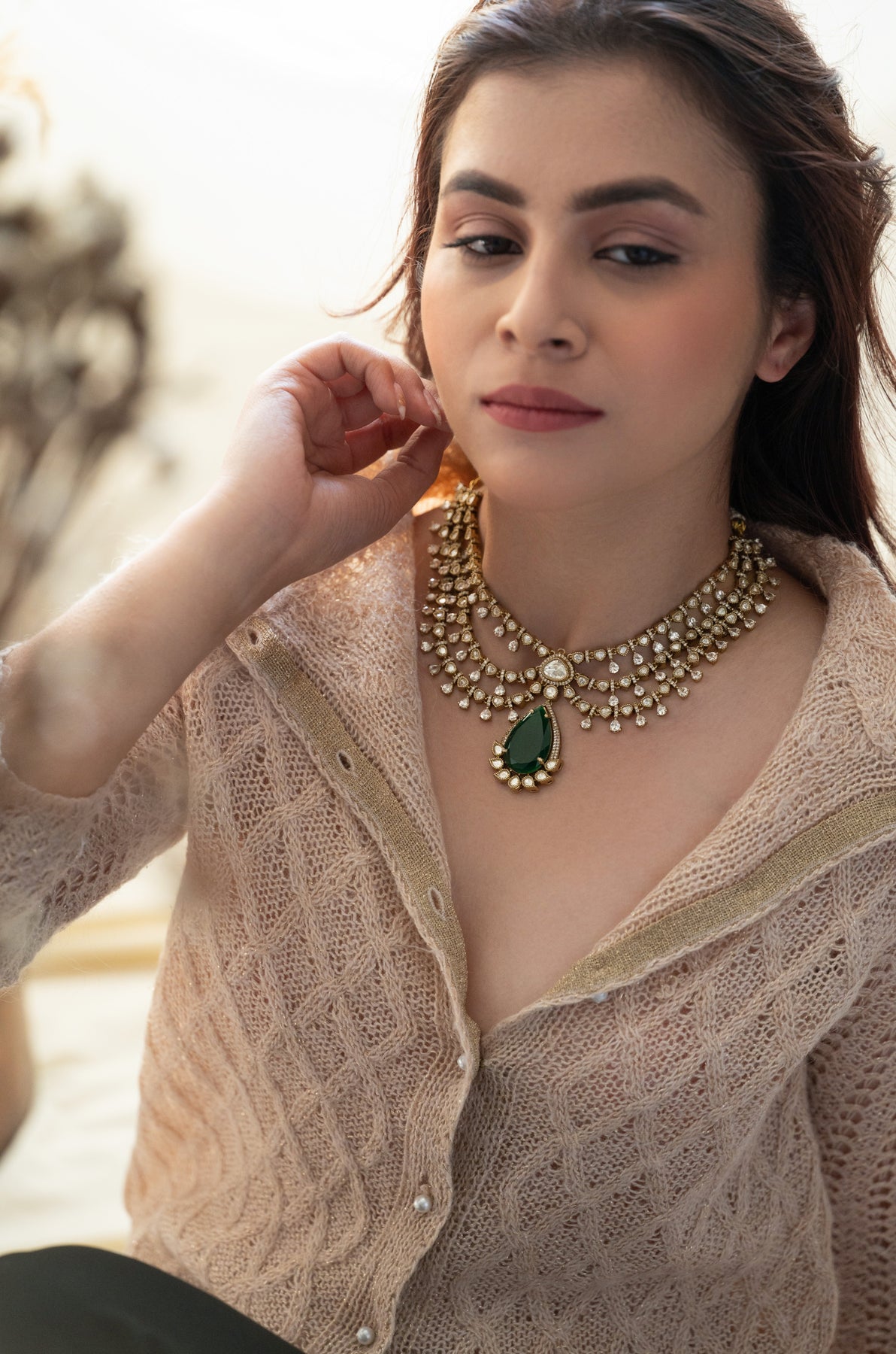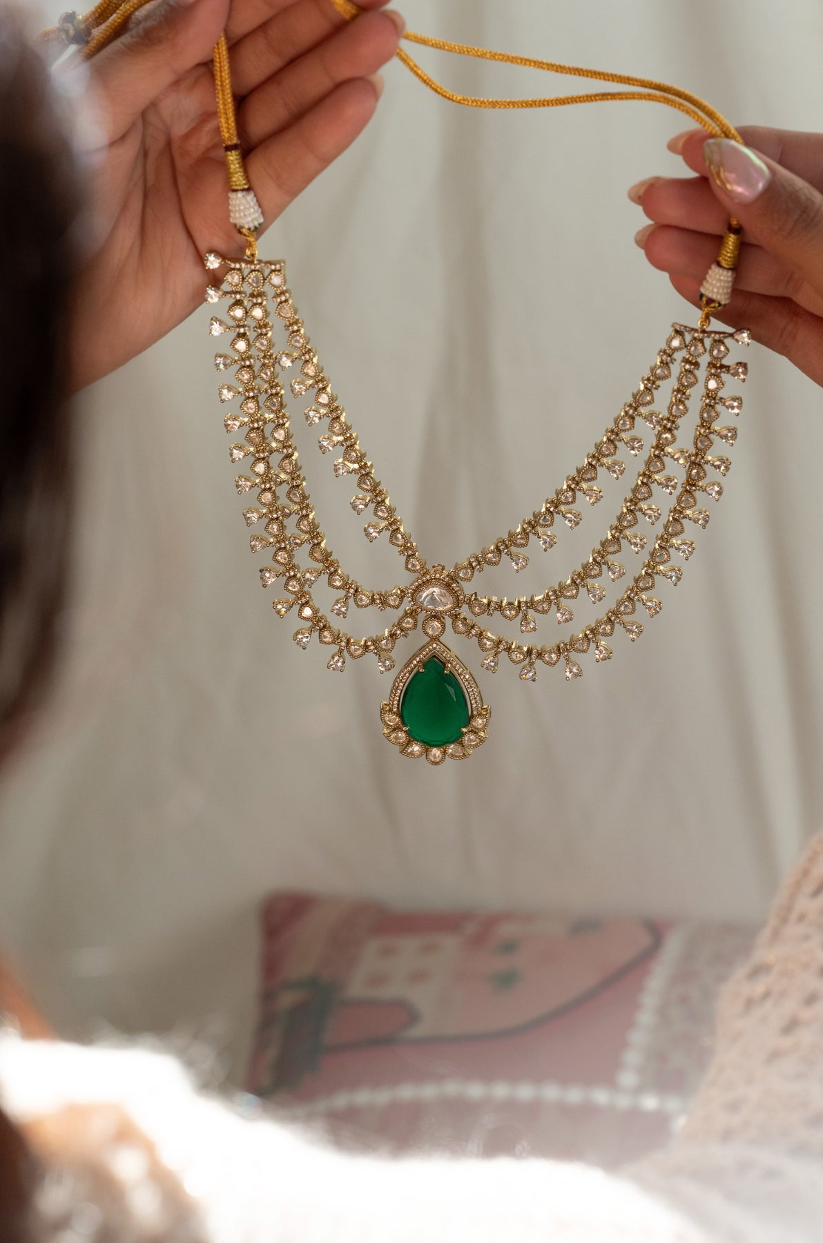 Discover the magic of layered elegance with our Aurora Necklace, where timeless craftsmanship meets contemporary charm. This stunning piece features lustrous polki stones paired with mesmerizing emerald green accents and sparkling zirconia details that catch light from every angle. The thoughtfully layered design creates an alluring, multidimensional look that's utterly unique perfect for adding a touch of regal sophistication to any occasion. Whether you're dressing up for celebrations or elevating your everyday style, this necklace is your ticket to turning heads and feeling absolutely radiant.