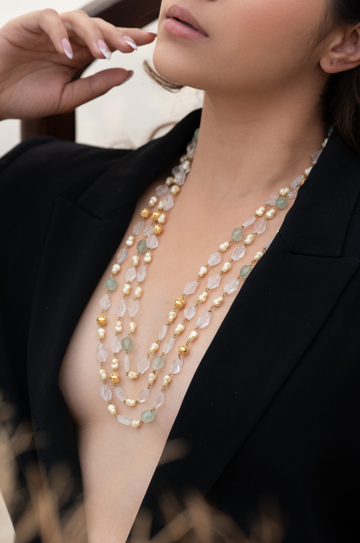 Elevate your look with effortless grace and artistic flair with the Sanya mint layered necklace. Expertly intertwined layers of lustrous pearls and natural stones create an alluring and chic aesthetic, making this necklace a must-have for the woman seeking a timeless and modern sense of style.