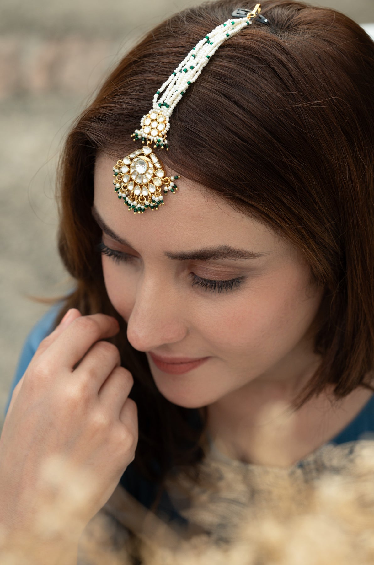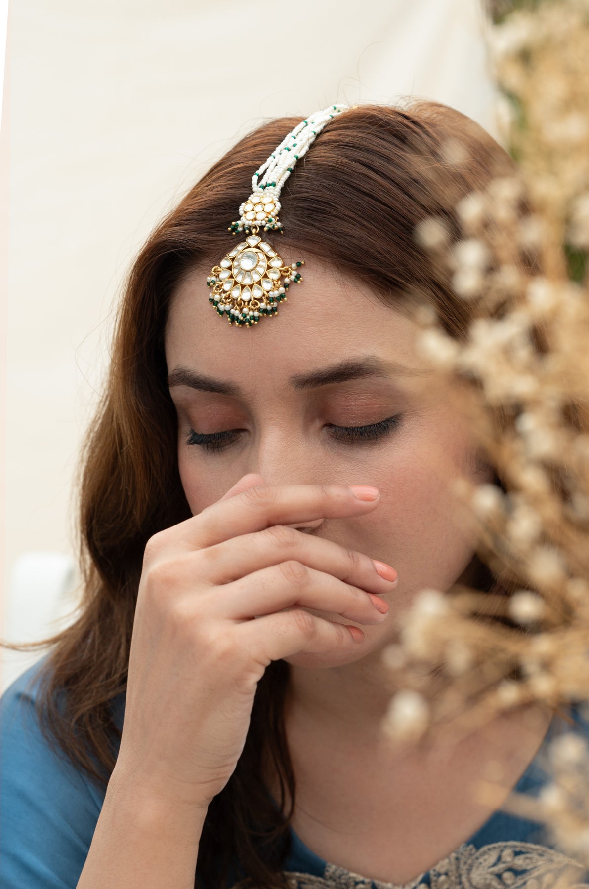 Elevate your traditional ensemble with the Kiara maangtikka. Expertly crafted with radiant kundan stones, delicate pearls, and subtle green trinket accents, this maangtikka offers a refined balance of elegance and heritage. Perfect for weddings and cultural celebrations, it enhances your look with timeless charm while maintaining intricate artistry true to classic designs.