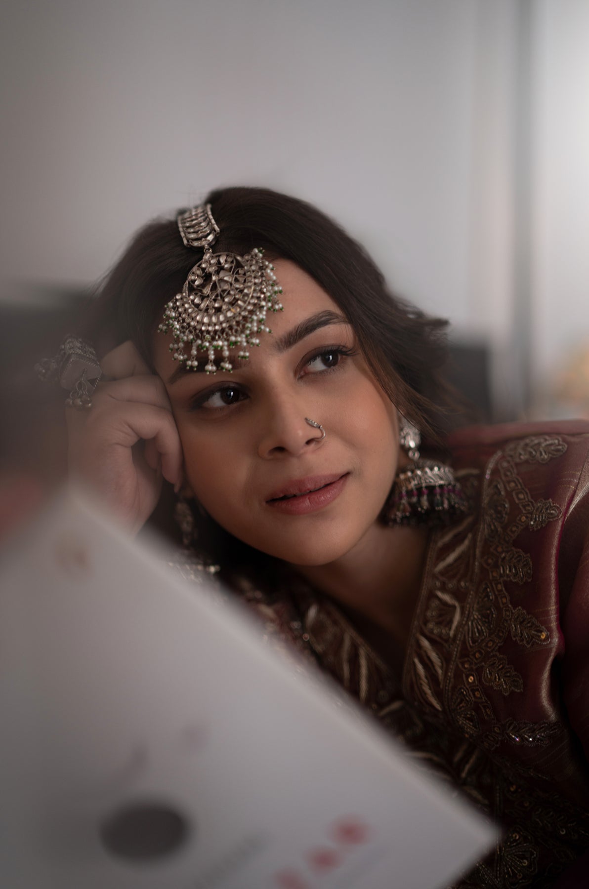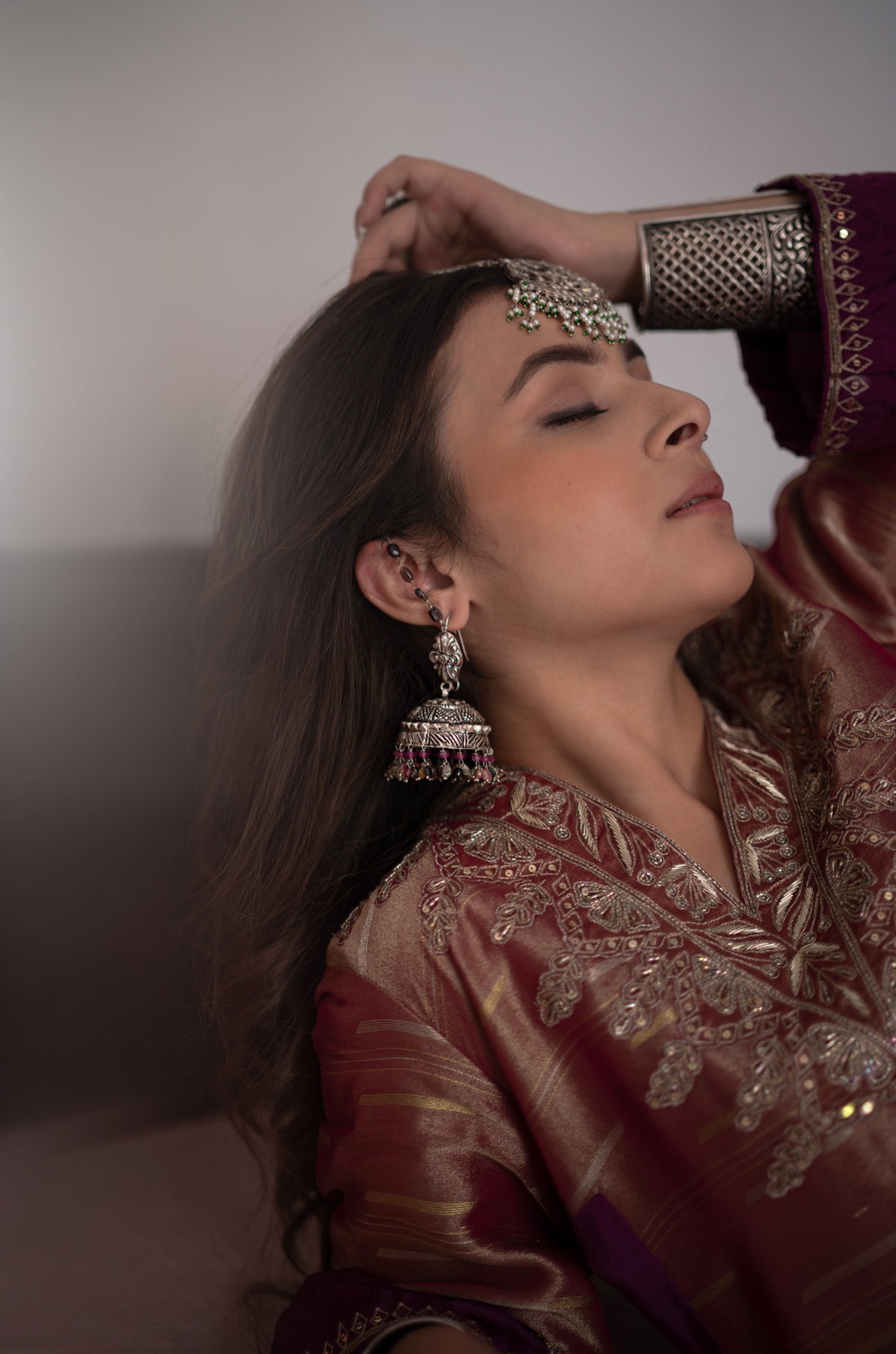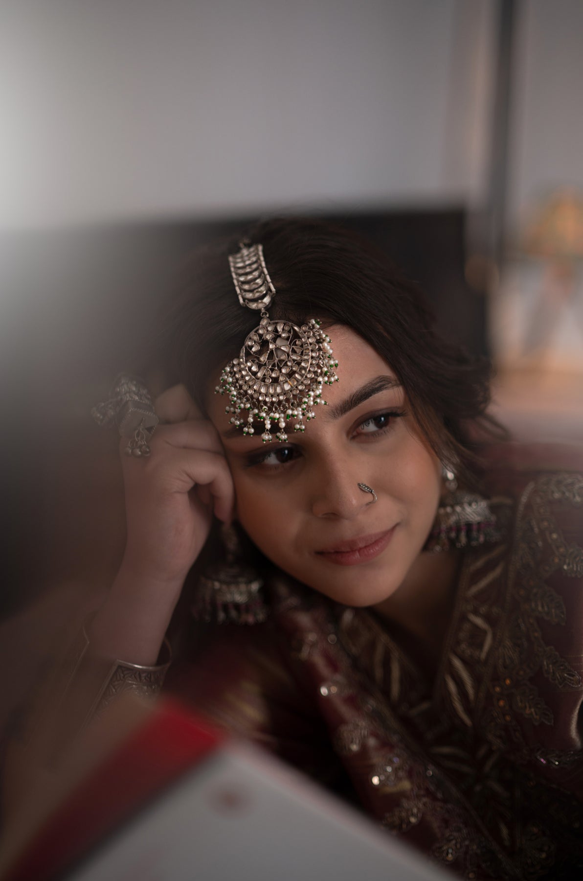 The Adira maangtikka is a stunning blend of refined silver and raw kundan. Its beauty is accentuated by top-notch shell pearls and vibrant green seed beads - a truly unique and graceful accessory.