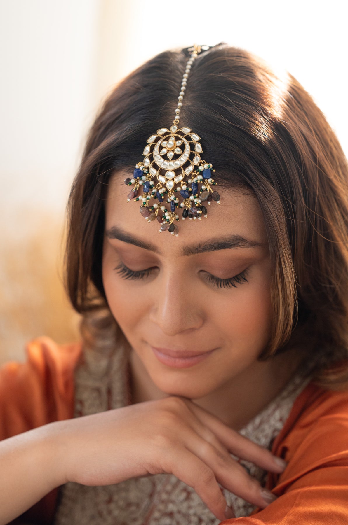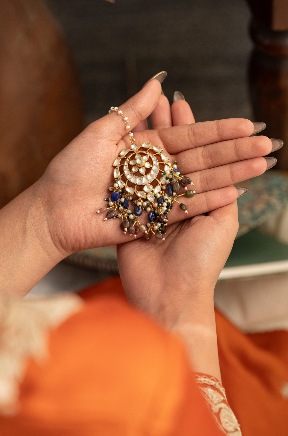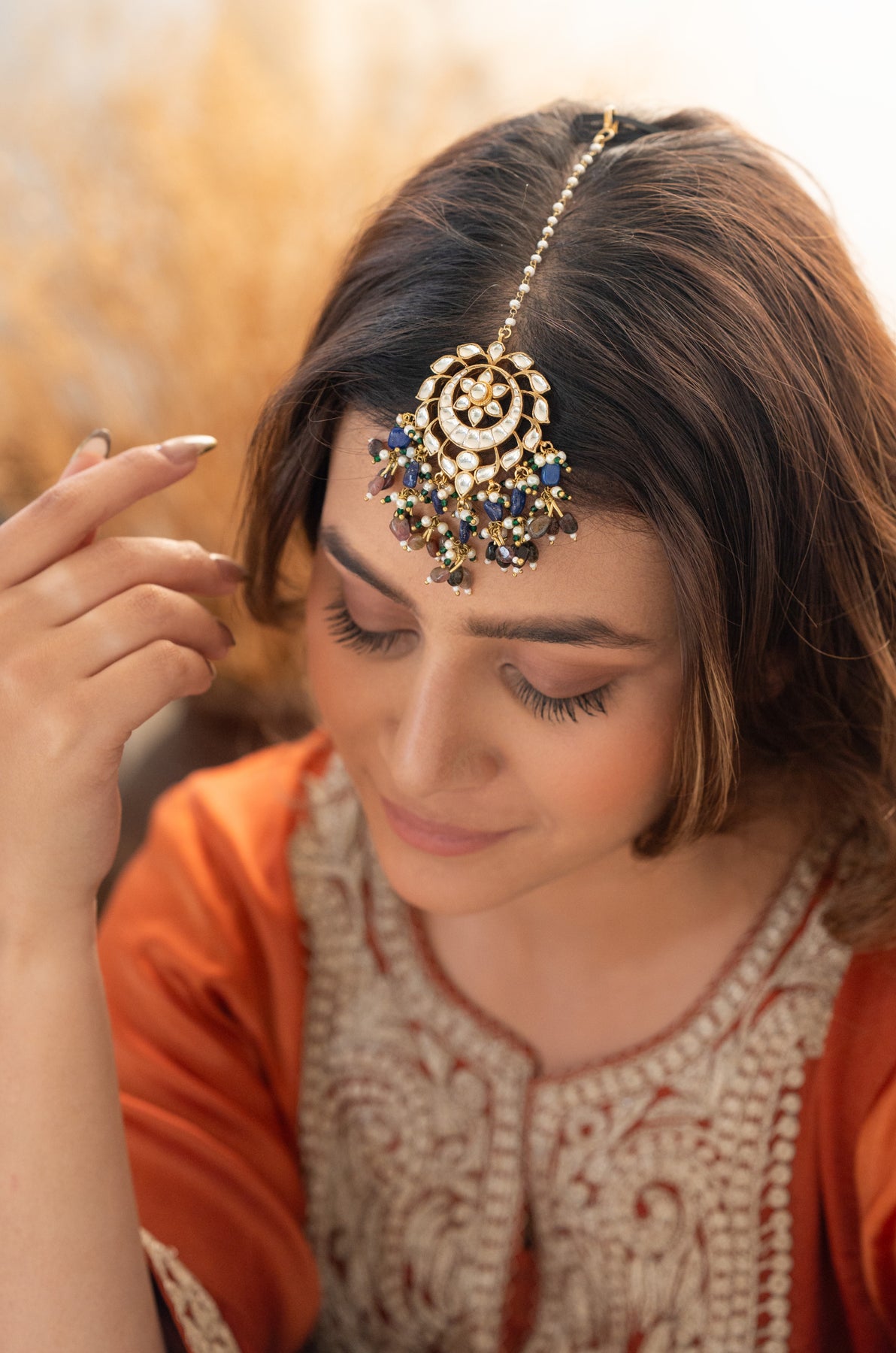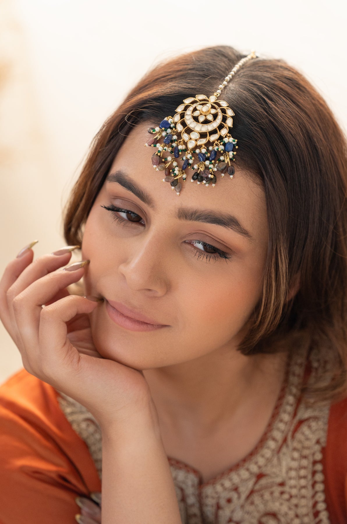 Add a splash of charm to your look with the Sanchi maangtikka. This playful piece features delicate floral designs adorned with lustrous pearls and vibrant multicolored natural stones, making every moment feel special and sparkling. Perfect for adding a touch of whimsy and elegance to any outfit!