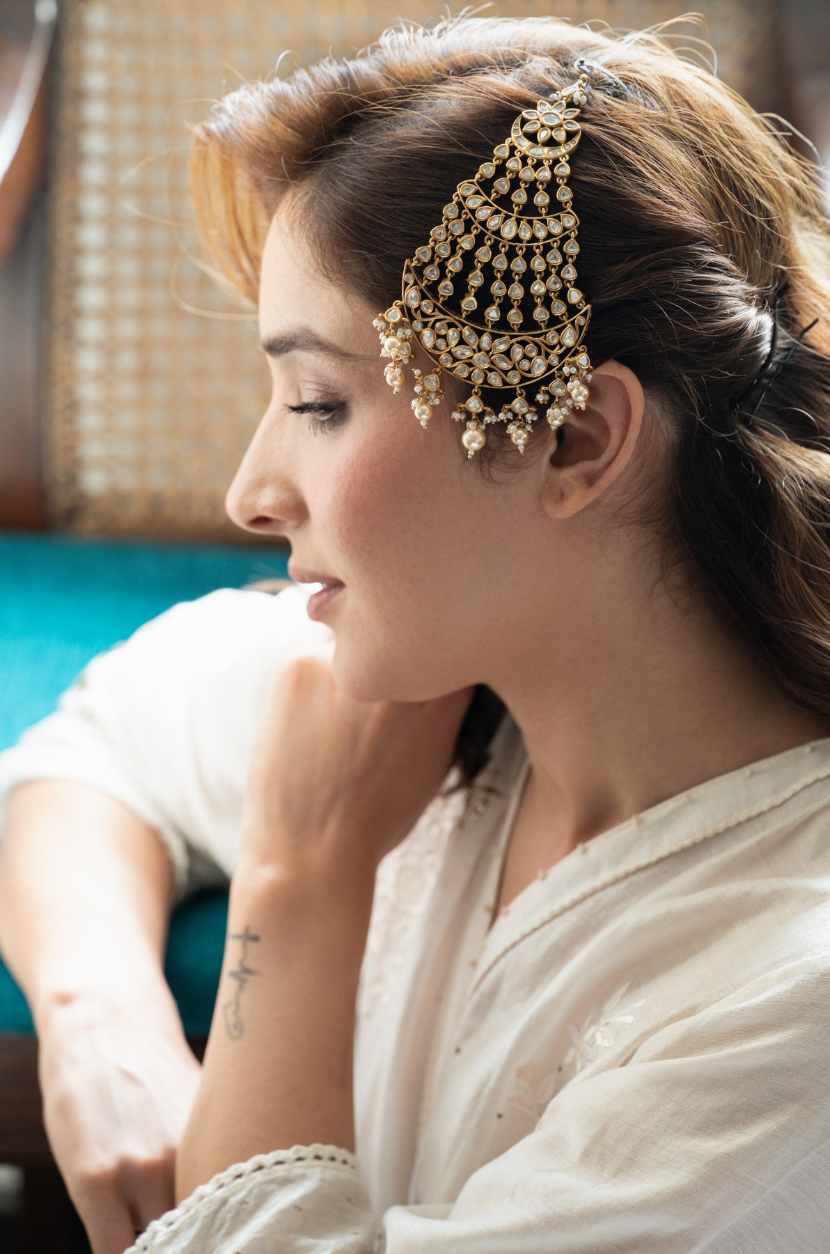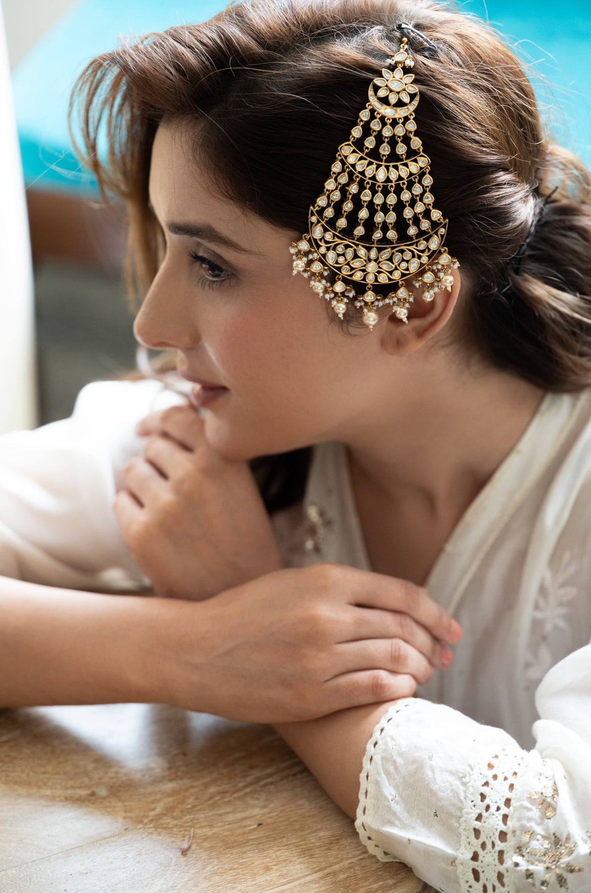 Naaz passa weaves a story of tradition, adorned with pearls and the gentle sparkle of uncut polki. It pays tribute to the elegant allure of bygone eras, ideal for the woman who cherishes vintage elegance and enduring narratives.