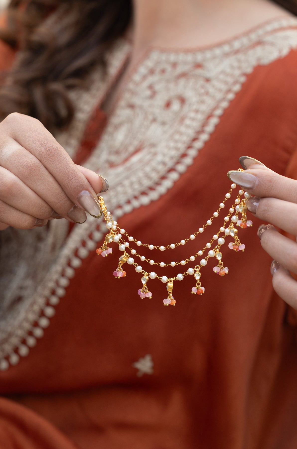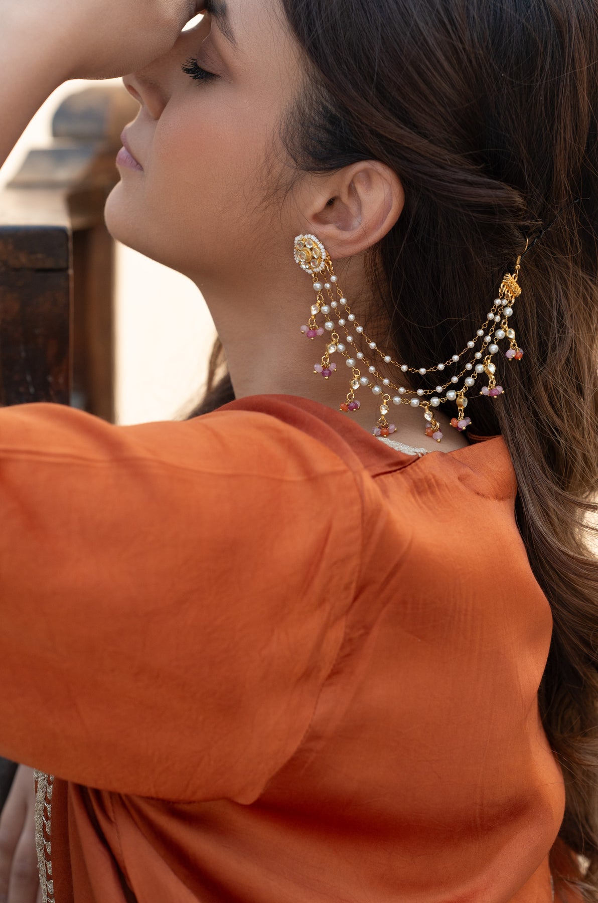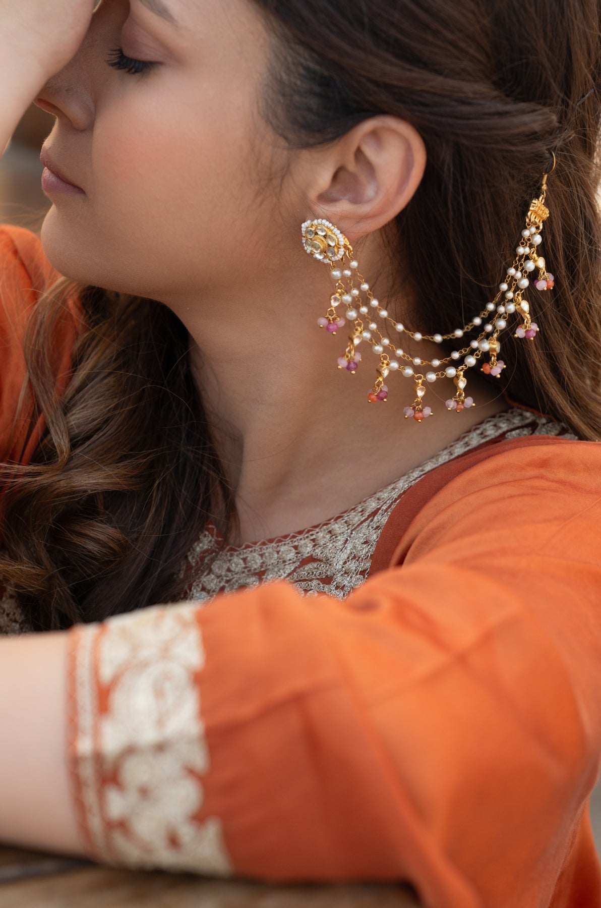 Dangle into elegance with our Ridhi kaan chain, where kundan sparkle meets pearl perfection! This playful piece features lustrous pearls dancing alongside intricately highlighted kundan work, all beautifully accented with rich multicolored onyx stones. Perfect for adding that extra shimmer to your festive look or everyday glamour. Let your ears do the talking with this stunning fusion of traditional craftsmanship and contemporary charm!