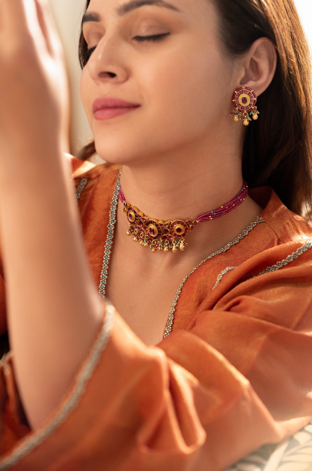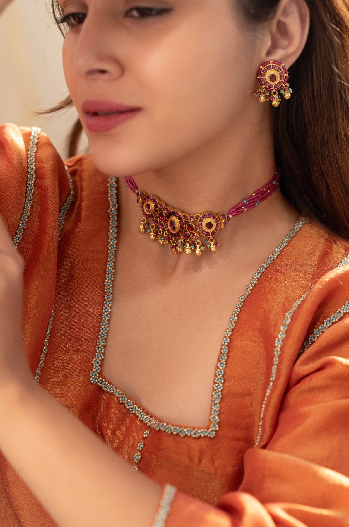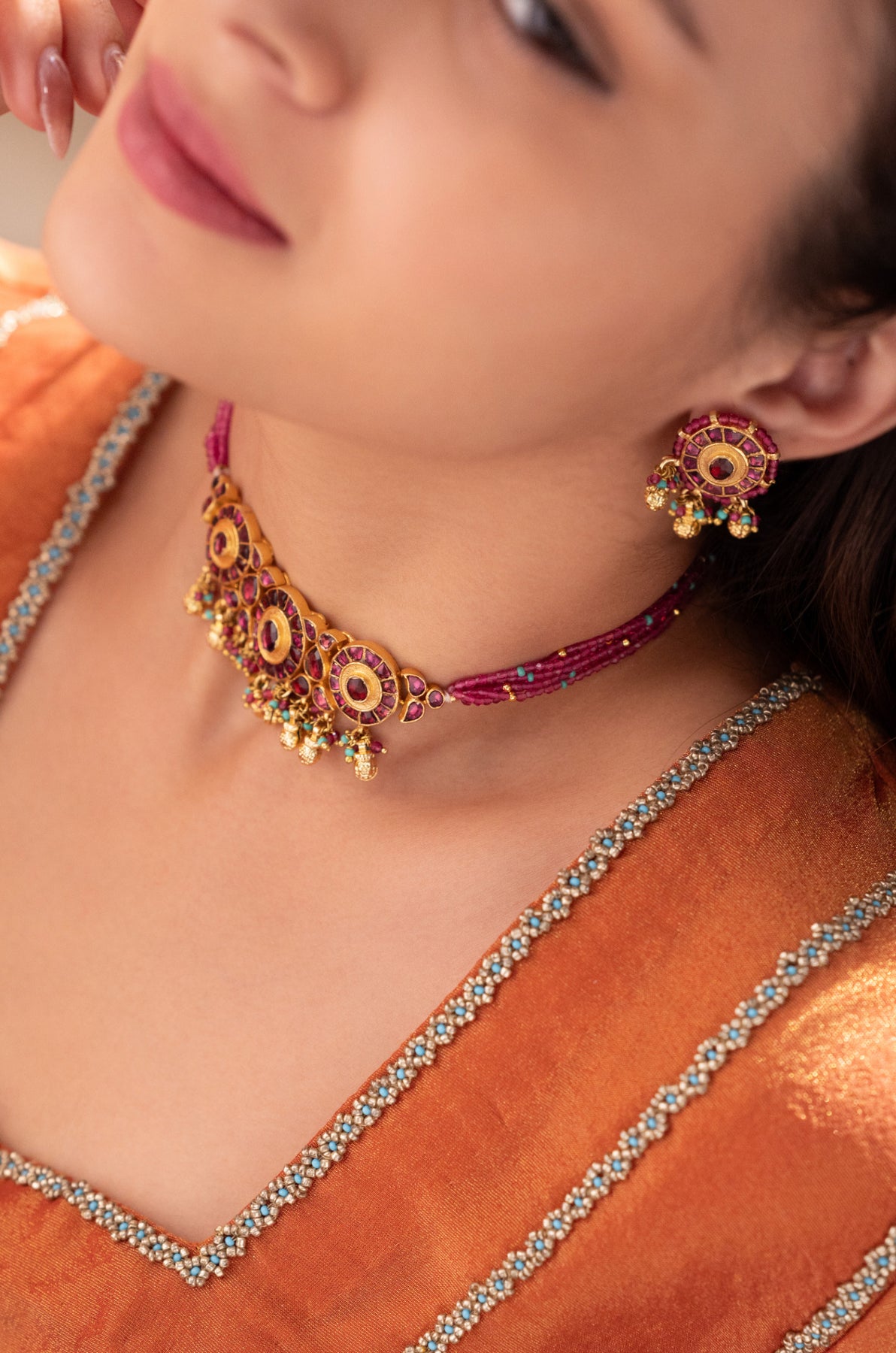 Step into tradition with the Aakriti necklace set, a perfect blend of classic charm and modern playfulness. This stunning necklace, beautifully strewn in hydro pink hues, pairs effortlessly with matching earrings to brighten any ensemble. Ideal for celebrations or everyday elegance, it adds a fun, vibrant touch to your traditional look.