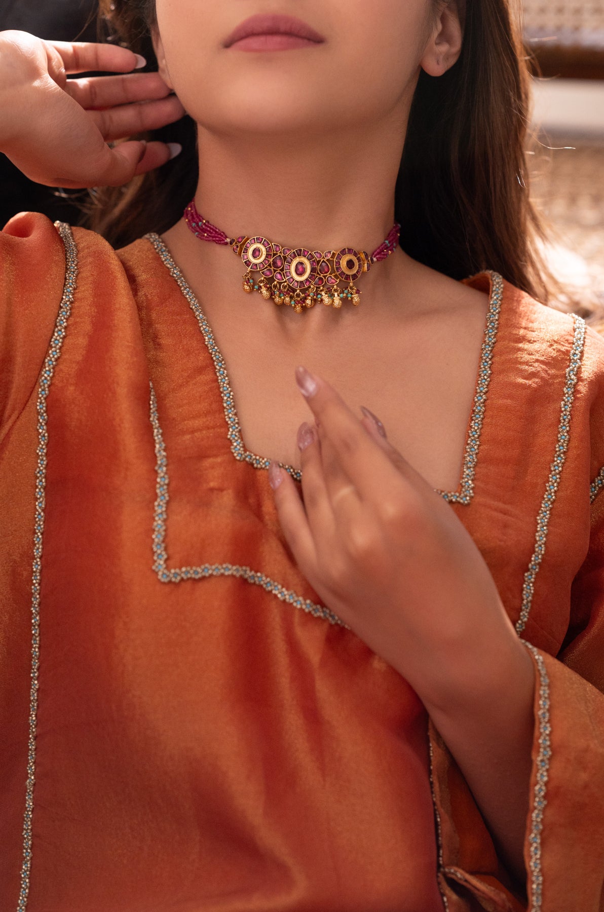 • When handling your jewelry, do so with clean and dry hands. Avoid excessive pulling, twisting, or bending, especially with delicate pieces or those with intricate stringing.