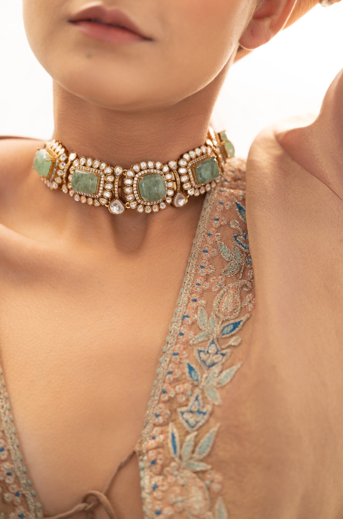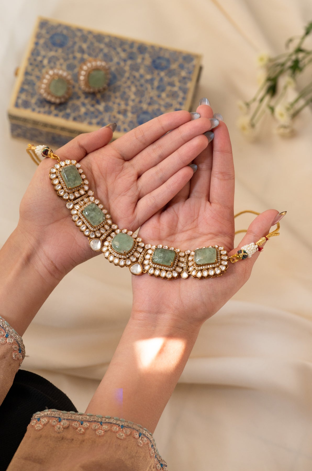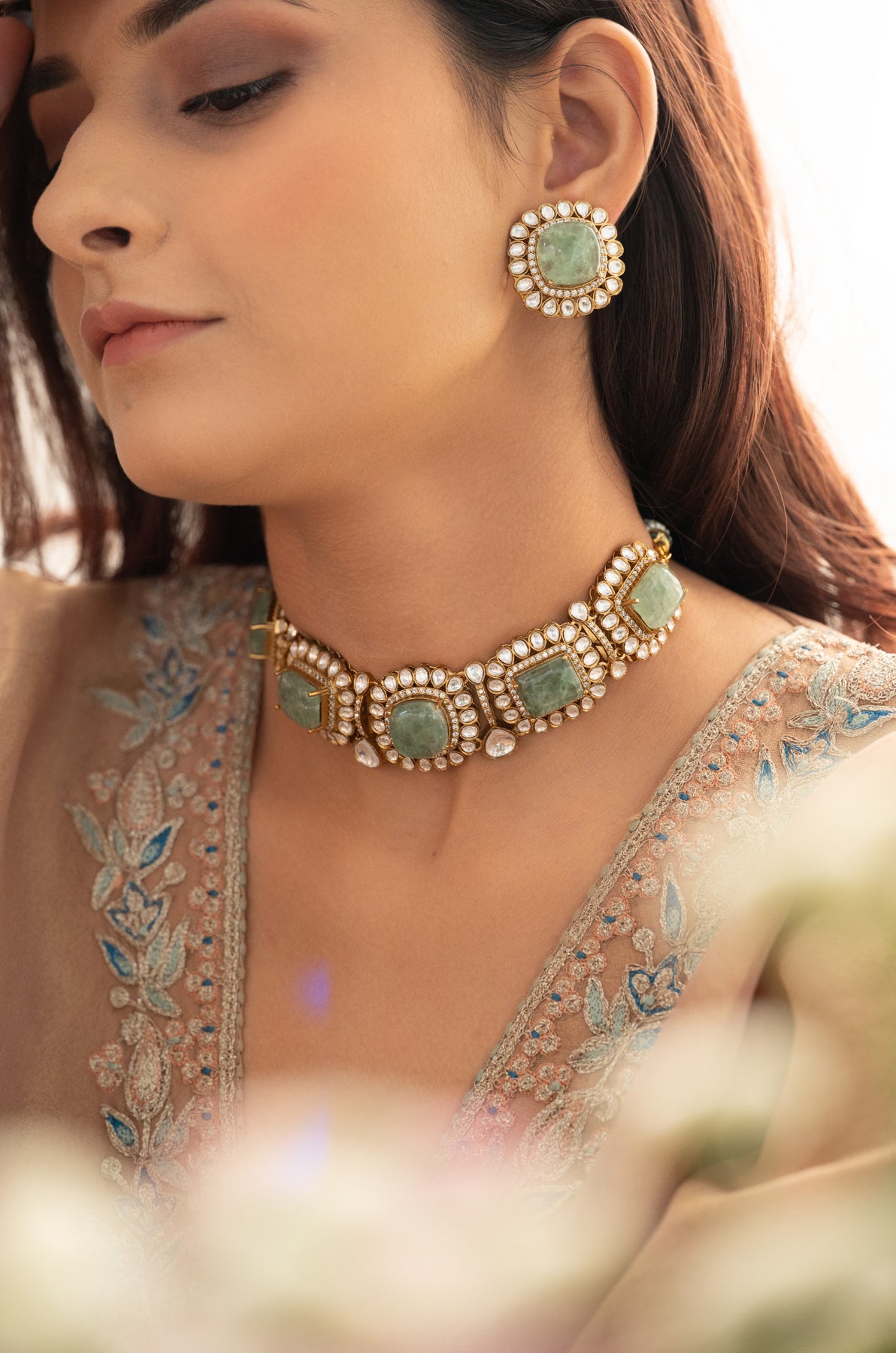 Elevate your everyday elegance with the Adyth necklace set where timeless craftsmanship meets modern flair. This stunning contemporary piece features lustrous fluorite stones paired with intricate polki work, creating a statement look that's undeniably classy. The set includes a gorgeous necklace and matching studs, giving you a coordinated ensemble that transitions effortlessly from day to night. Perfect for those who appreciate jewelry that speaks volumes without saying a word.