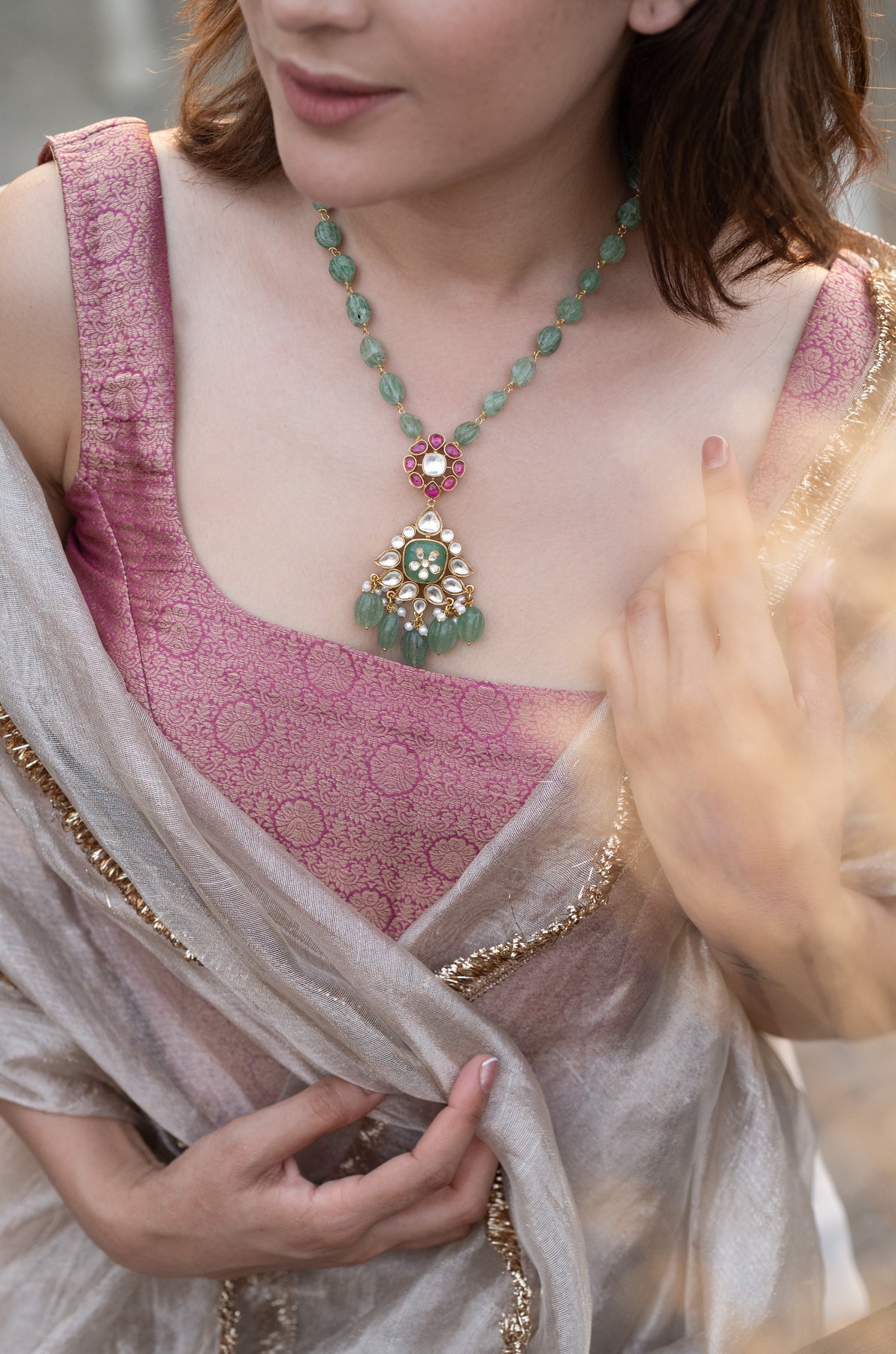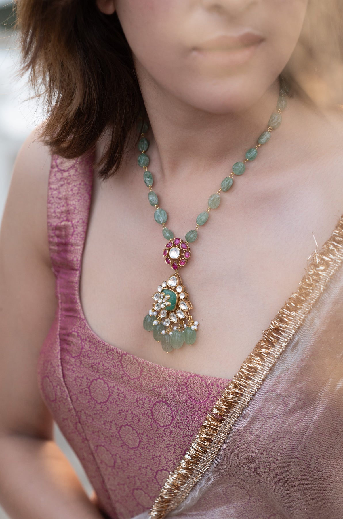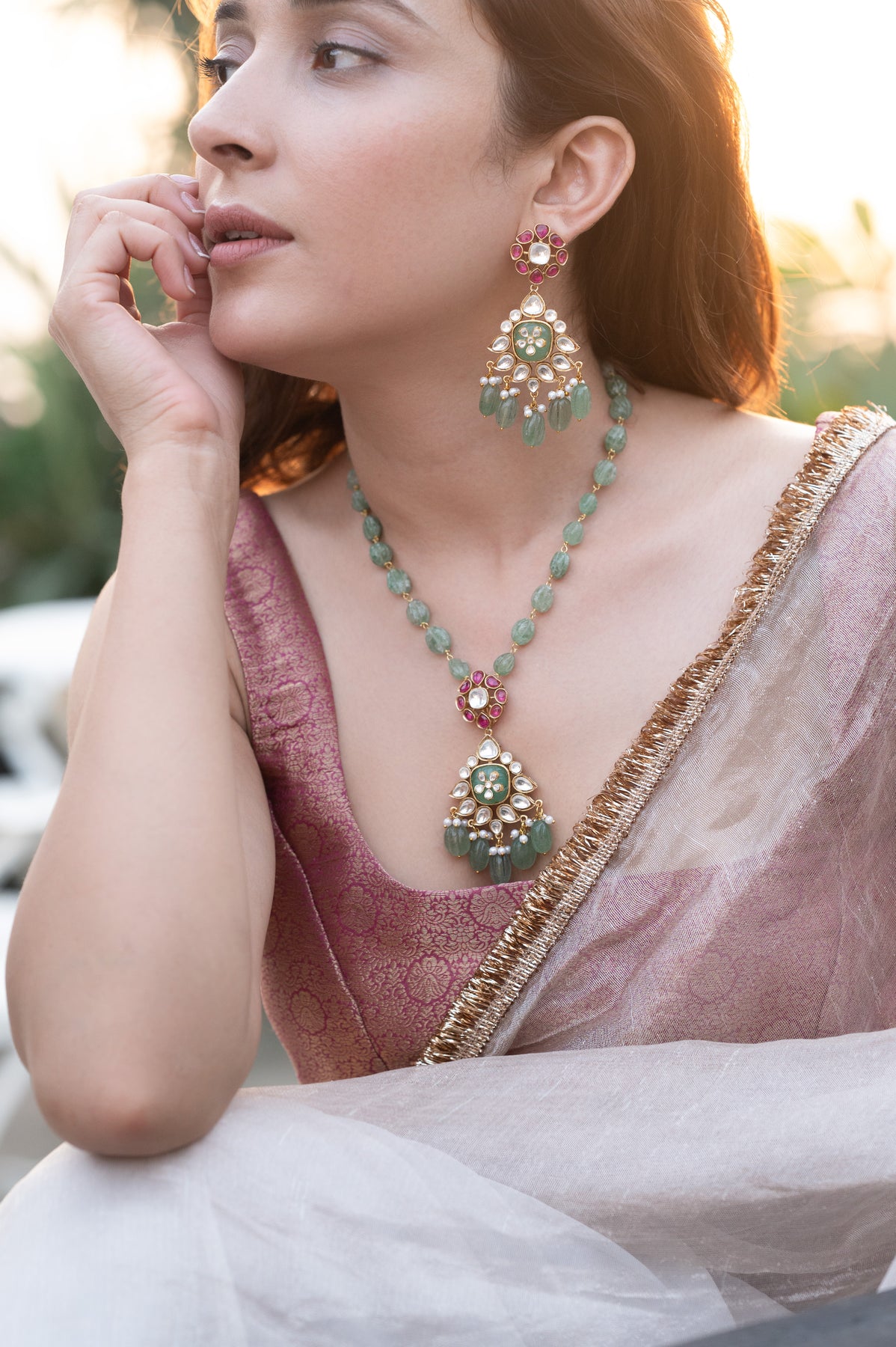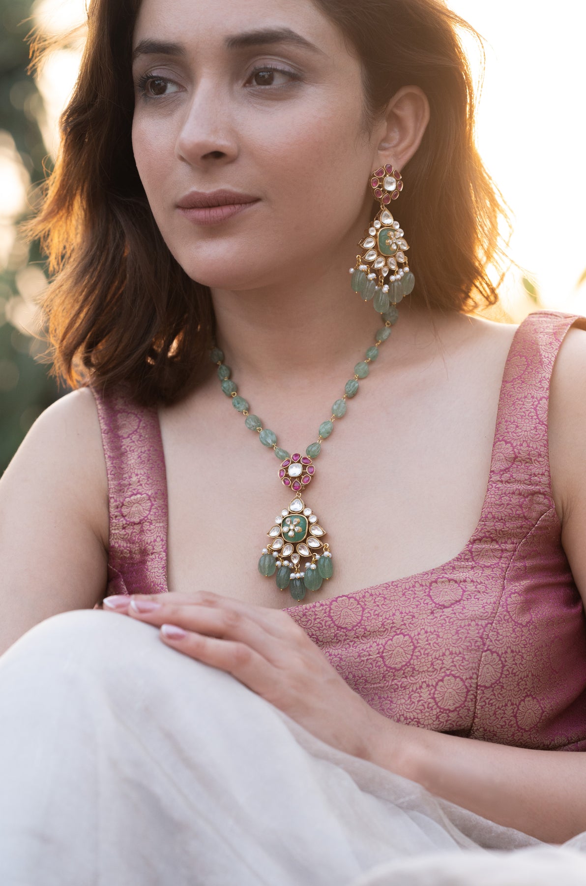 Add a fresh twist to your look with the Chitwan necklace Set, featuring sparkling polki stones paired with cool mint fluorite gems. This contemporary set comes complete with matching earrings, making it the perfect playful duo to brighten up any outfit. Embrace a fun, modern style with a hint of timeless elegance!