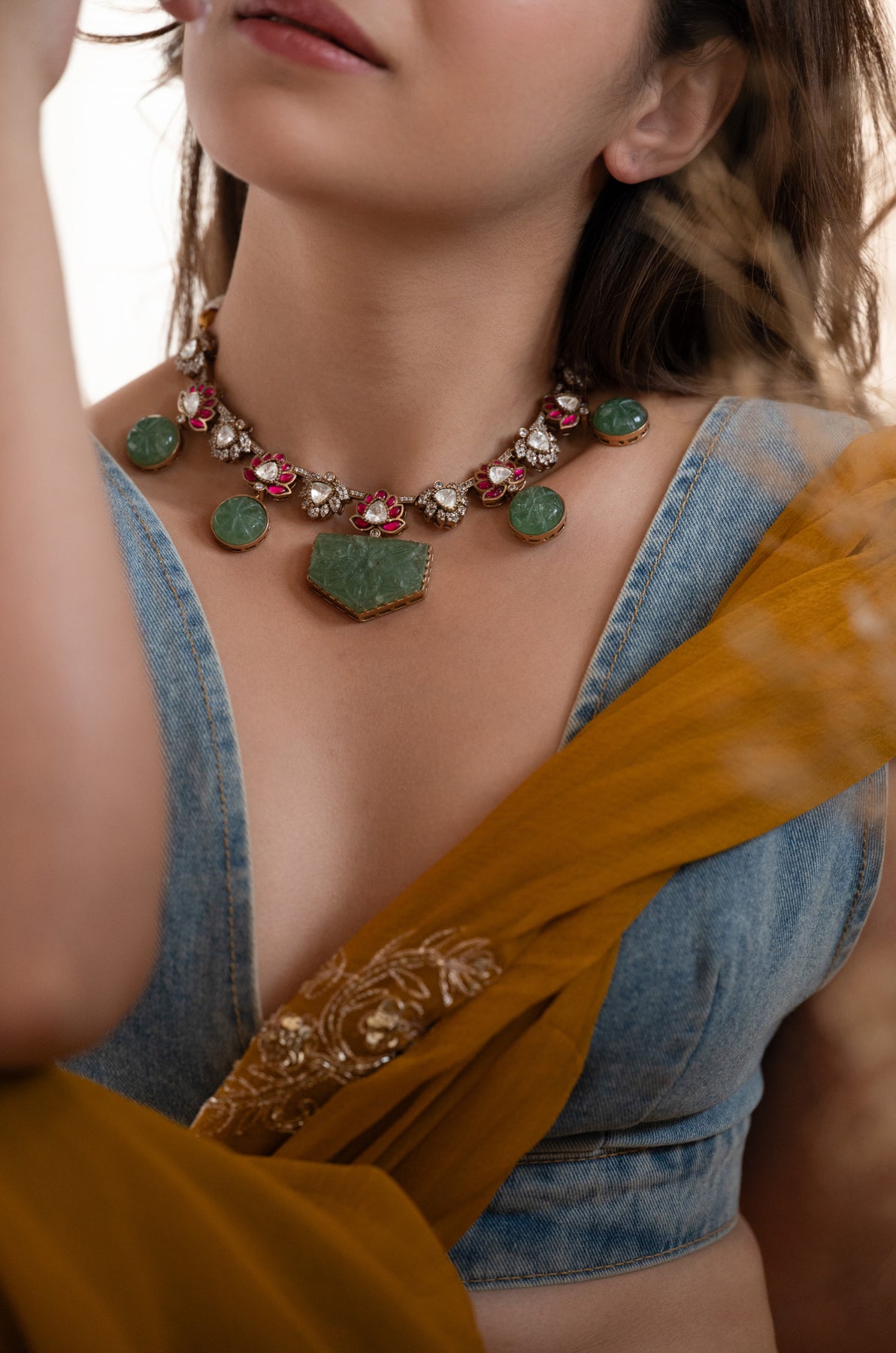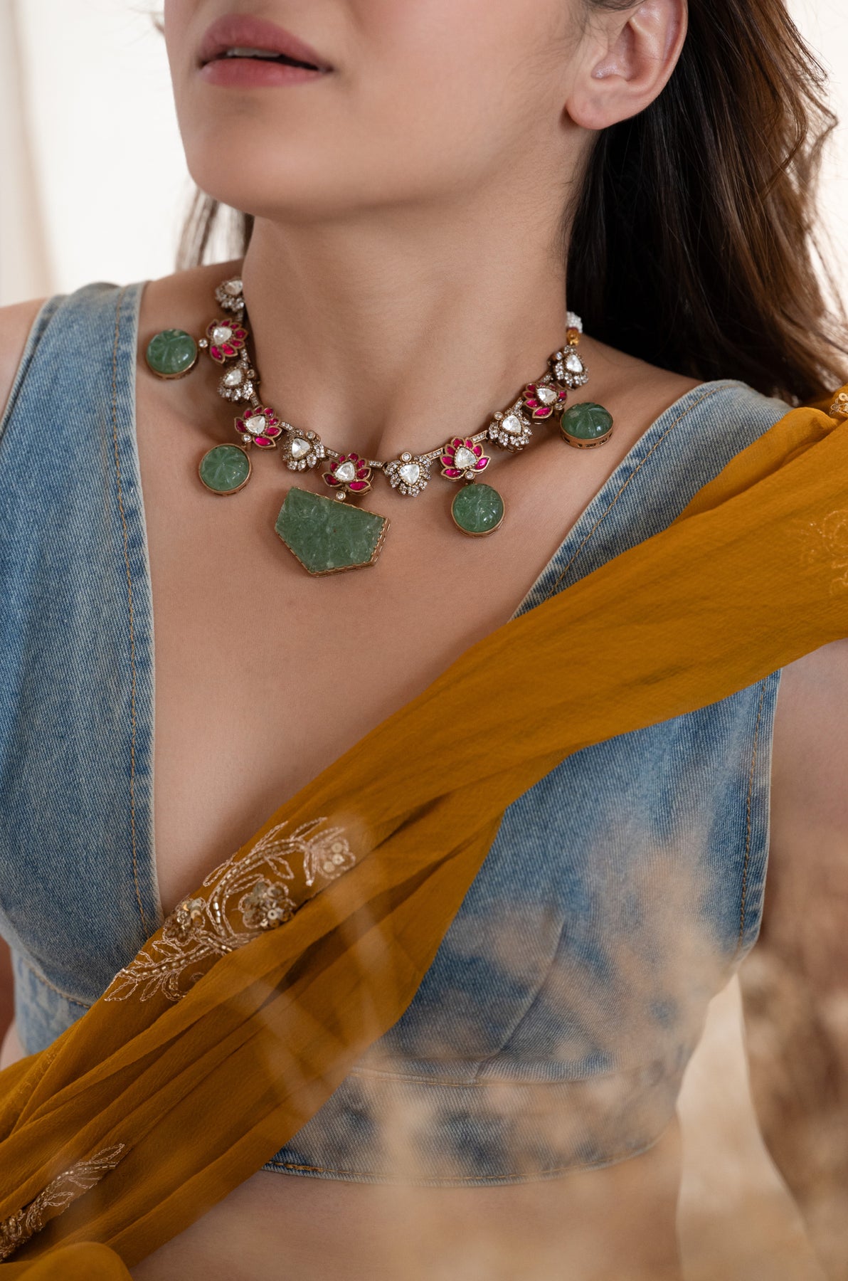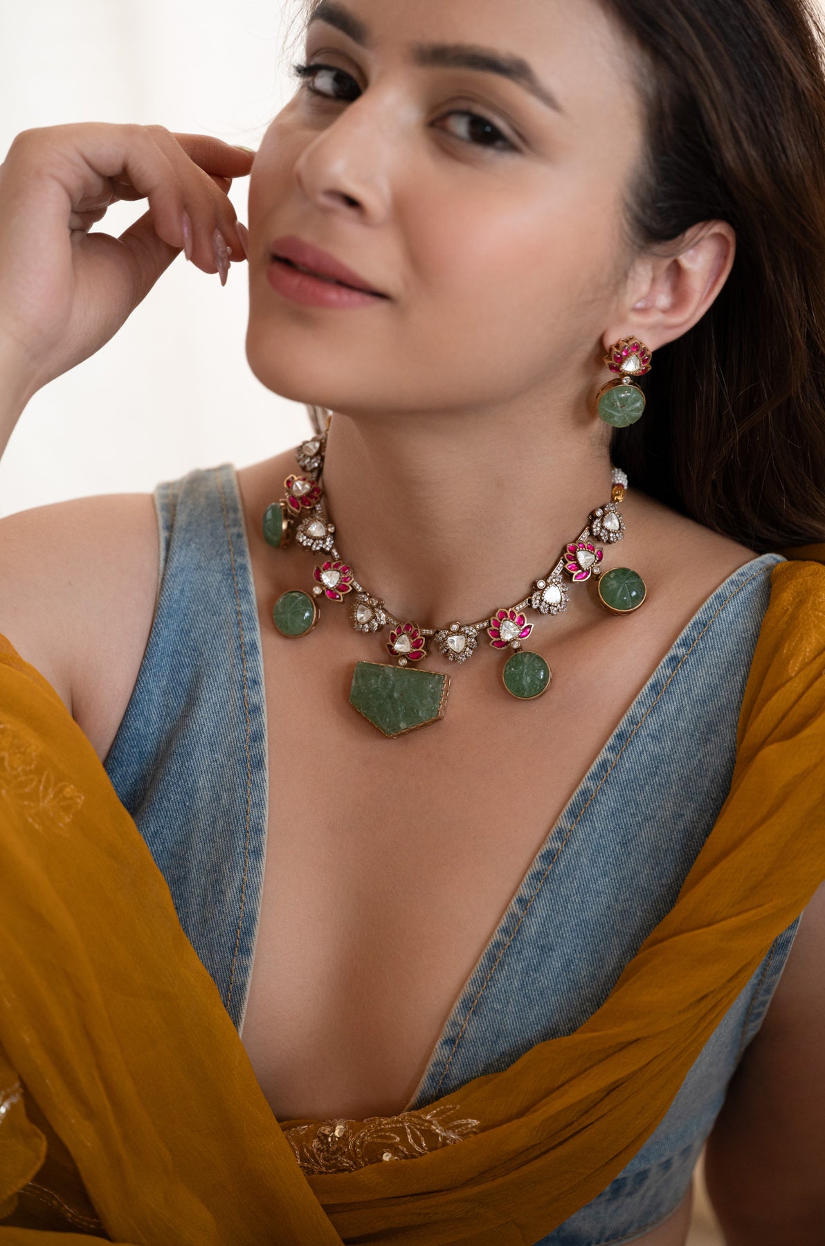 The Harika necklace set shines as a playful tribute to calm vibes and dazzling style. The rose-cut polki sparkle mingling with rich red garnet lotus designs, all wrapped around beautifully detailed fluorite stones. The striking centerpiece brings a rooted energy, while the charming accents twinkle with a touch of magic.