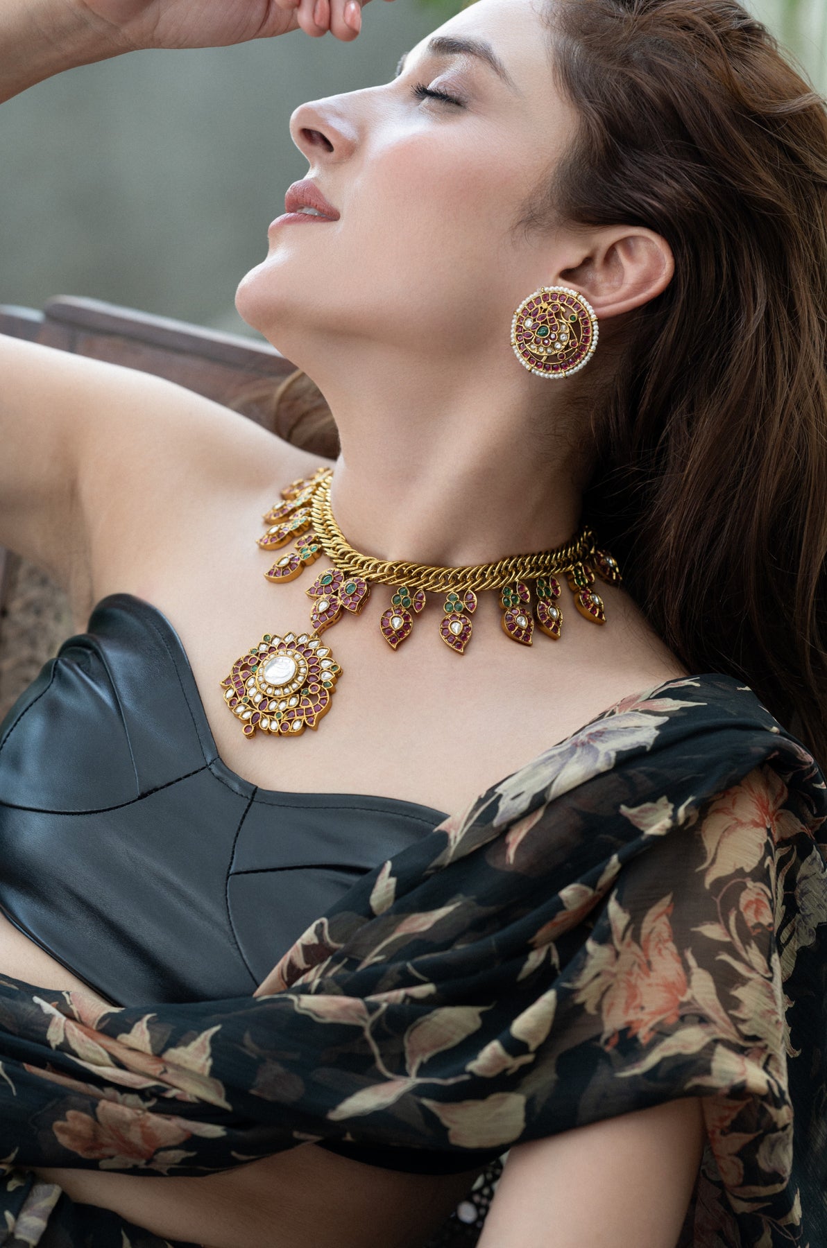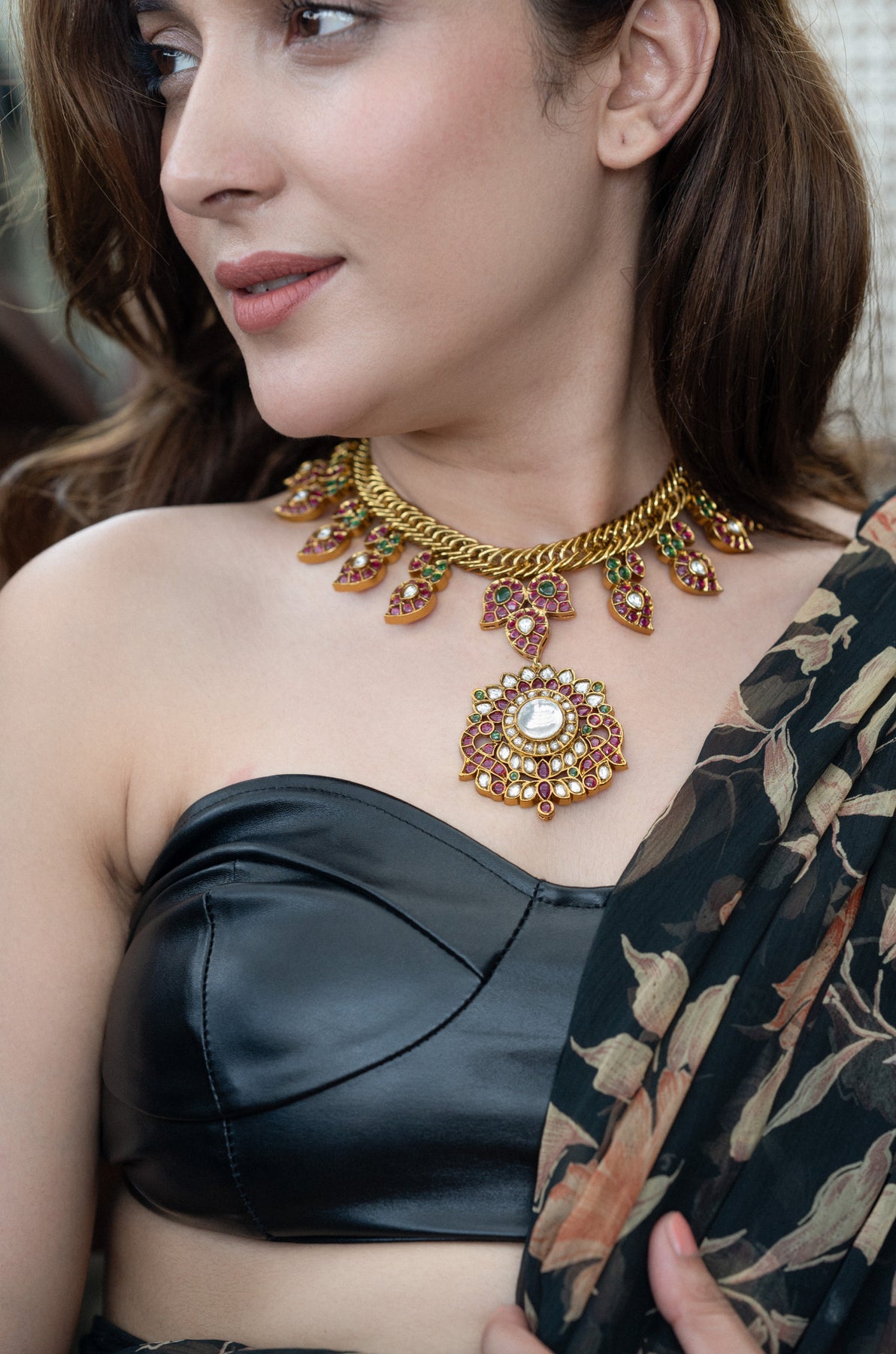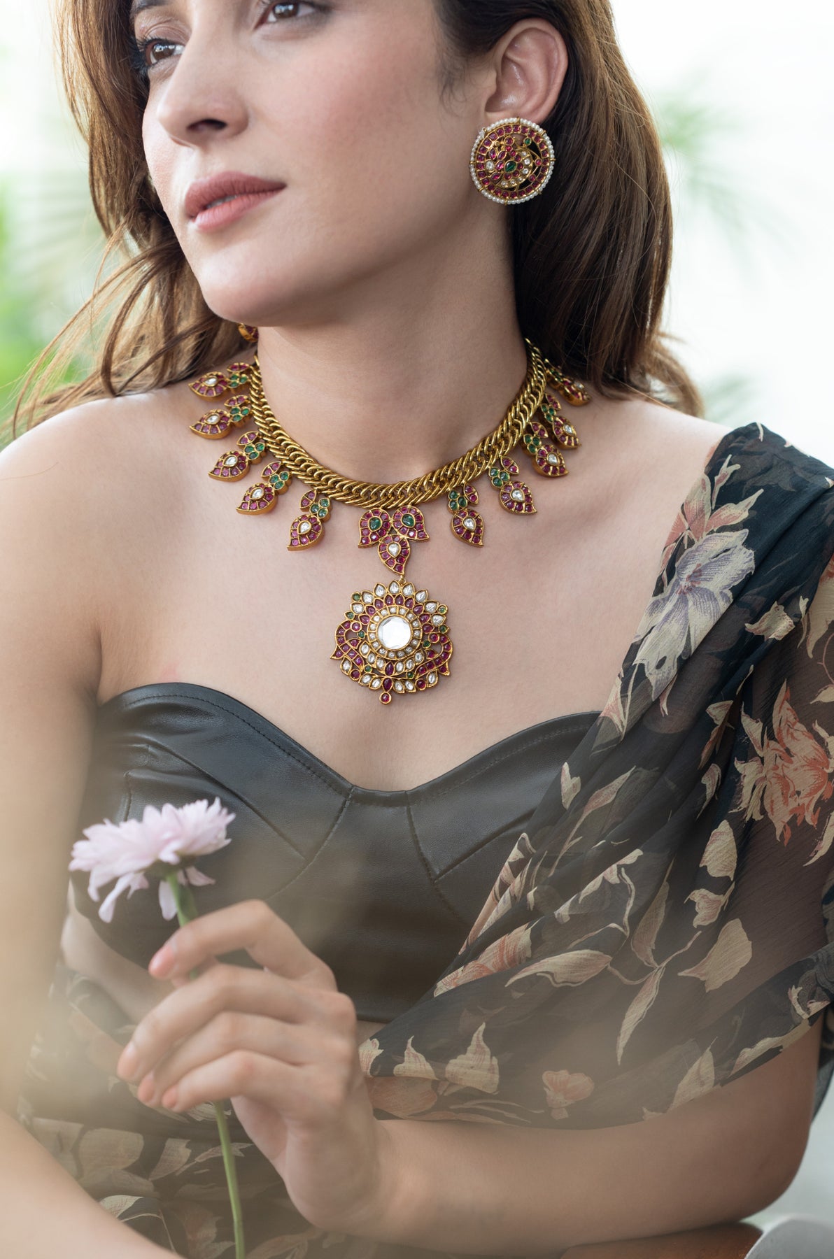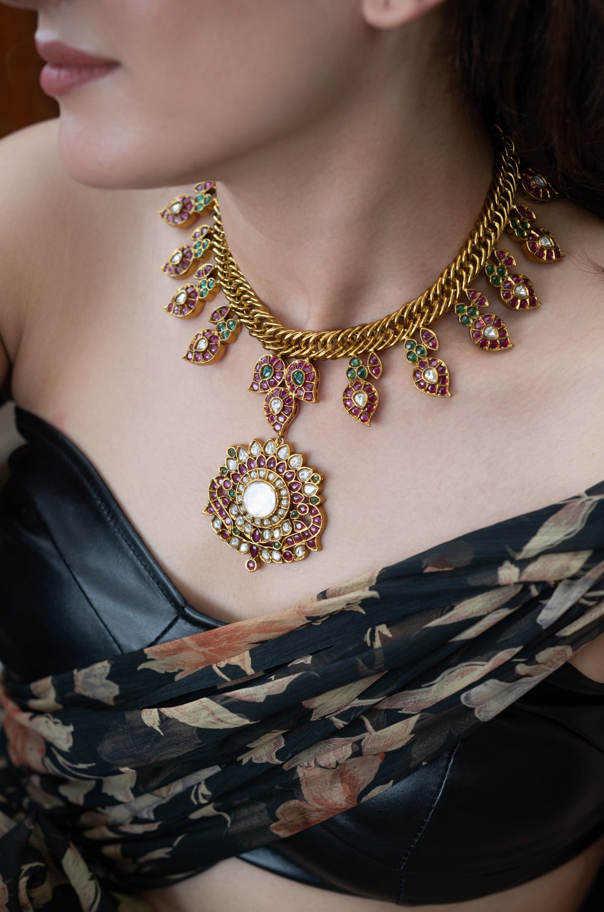 This dazzling gold choker necklace steals the spotlight with its intricate design of tiny leaf motifs studded with red and green stones. A bold central pendant shines bright, featuring red stones and a sparkling white kundan pearl. It comes with matching oversized circular studs that echo the necklace’s playful goldwork and vibrant red-green gems, capturing the charm of traditional kundan or meenakari artistry.