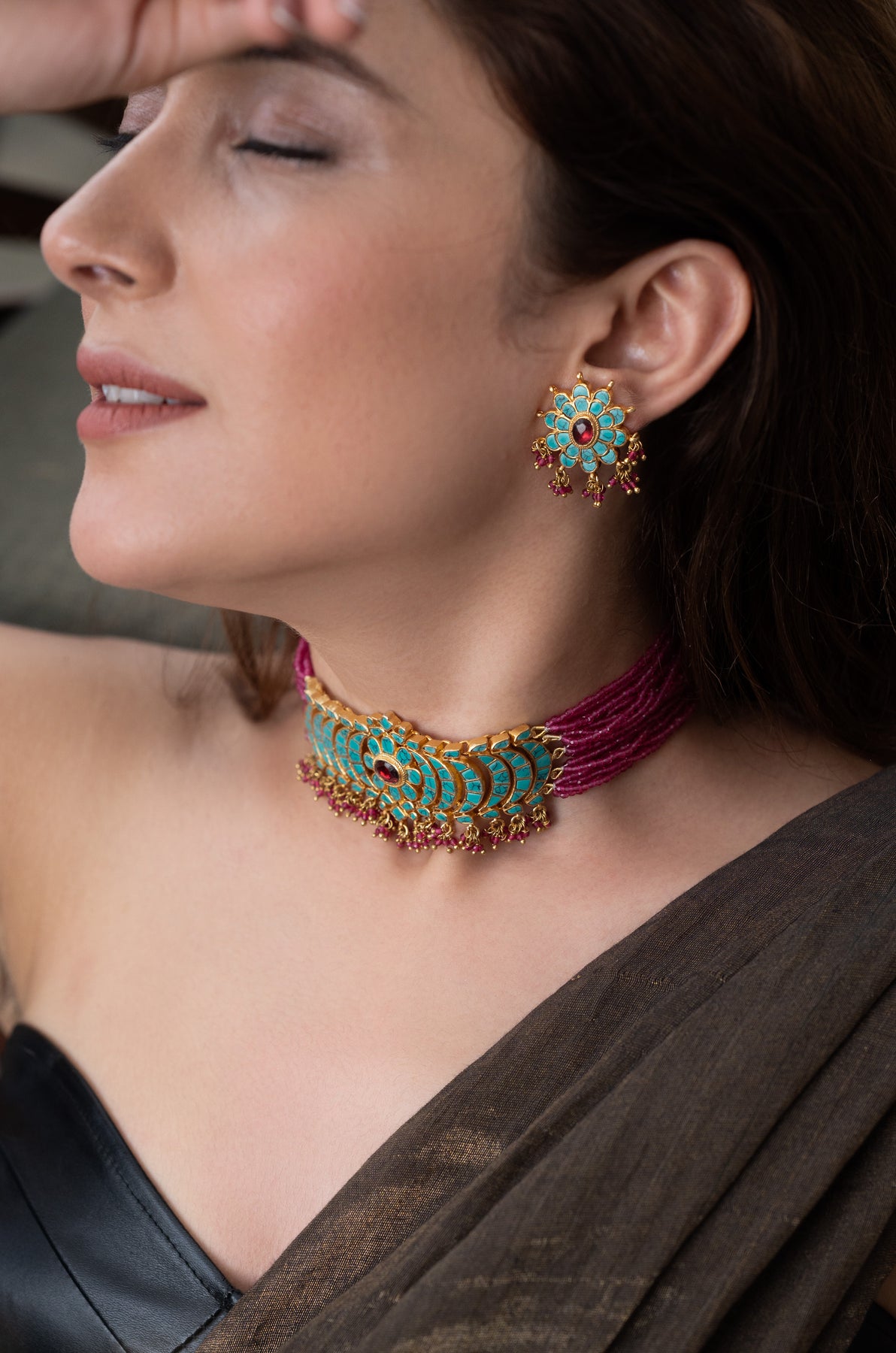 Add a splash of oceanic charm to your outfit with the Linea necklace set. This vibrant turquoise necklace, thoughtfully strewn with pink hydro stones, perfectly balances bold color with delicate elegance. The matching earrings complete the look, bringing playful harmony and a touch of sparkle wherever you go. Ideal for brightening any day or night occasion with a fun, fresh vibe.