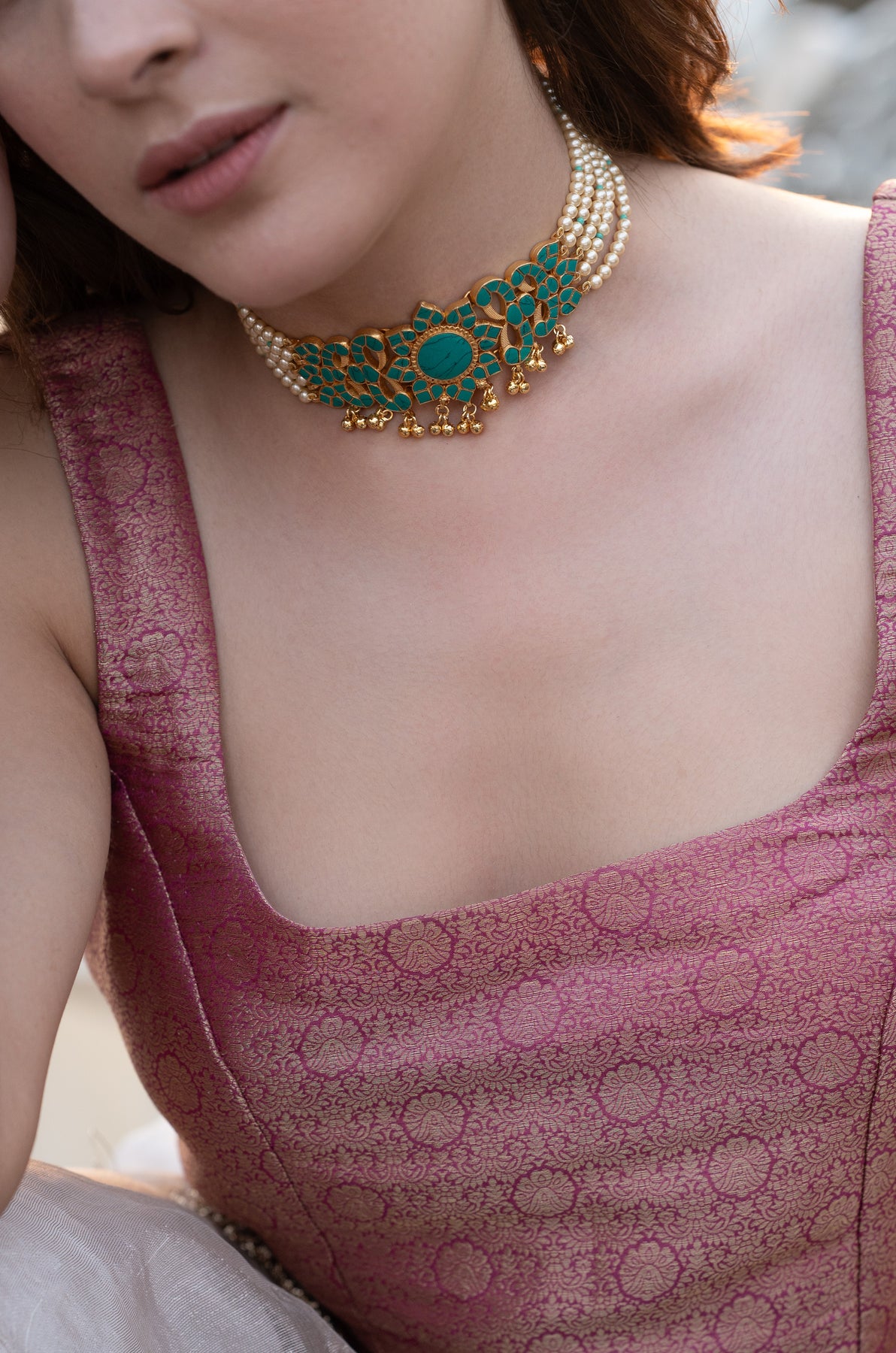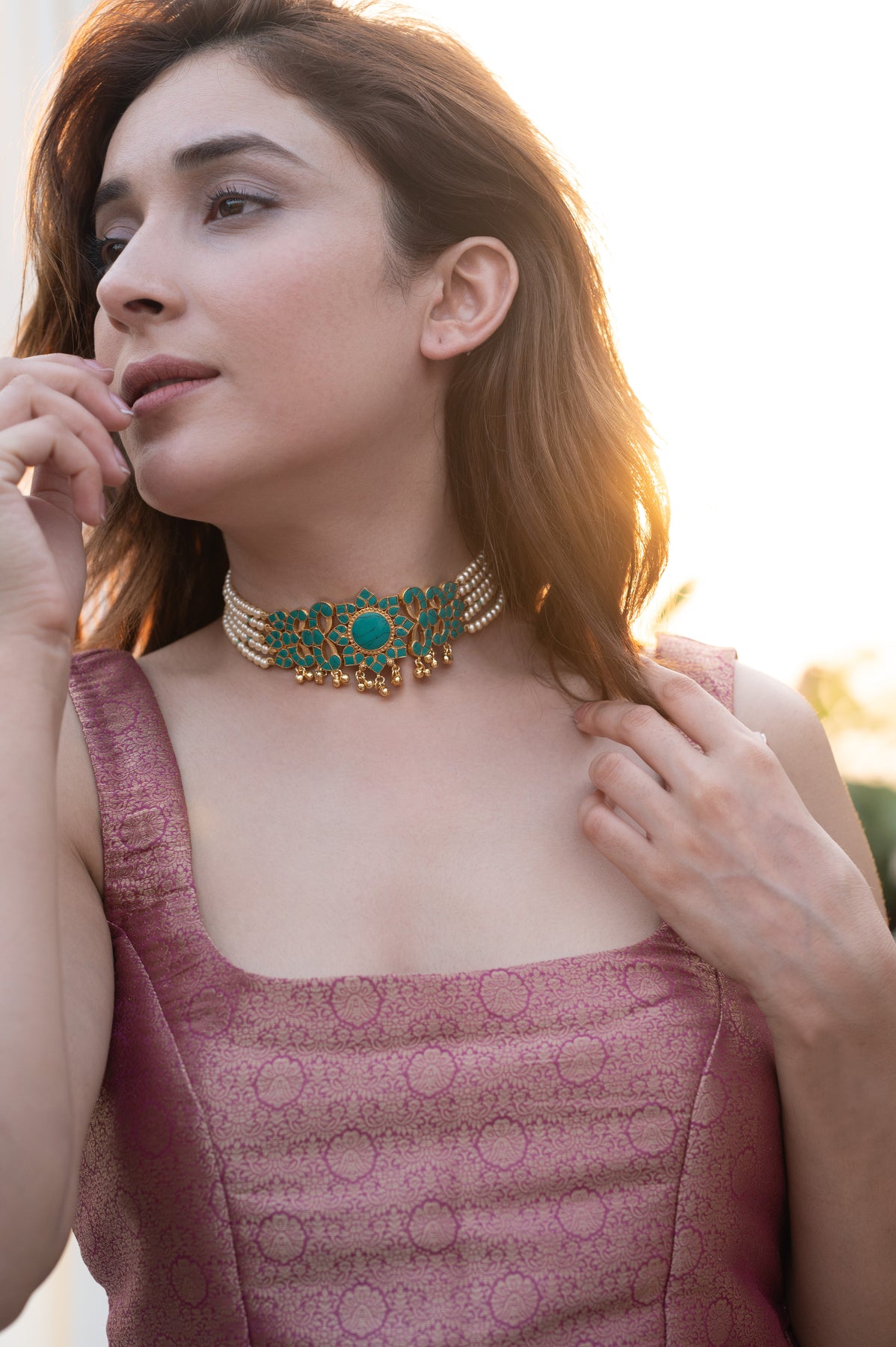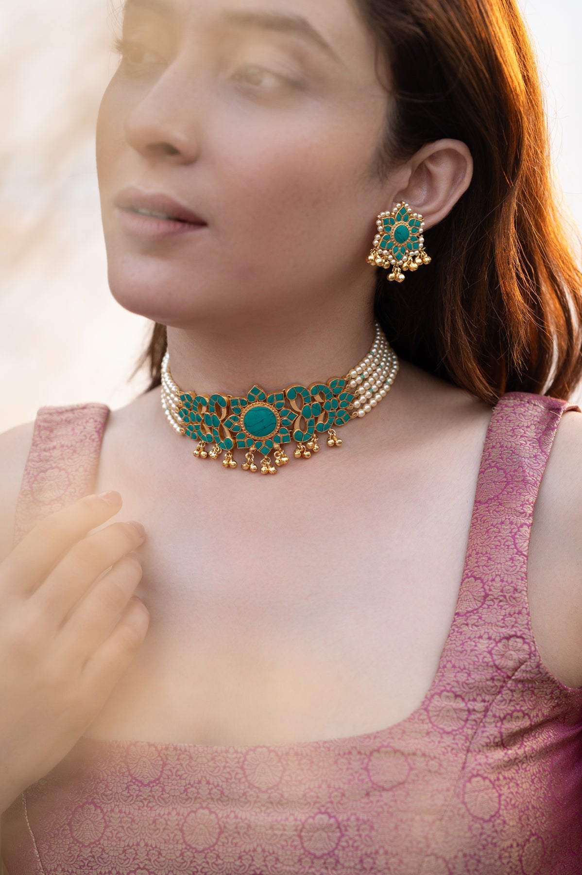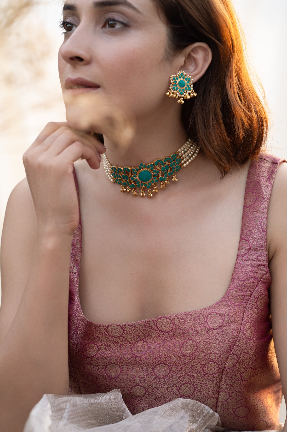 Add a splash of oceanic charm to your outfit with the Linea necklace set. This vibrant turquoise necklace, thoughtfully strewn with shimmering pearls, perfectly balances bold color with delicate elegance. The matching earrings complete the look, bringing playful harmony and a touch of sparkle wherever you go. Ideal for brightening any day or night occasion with a fun, fresh vibe.