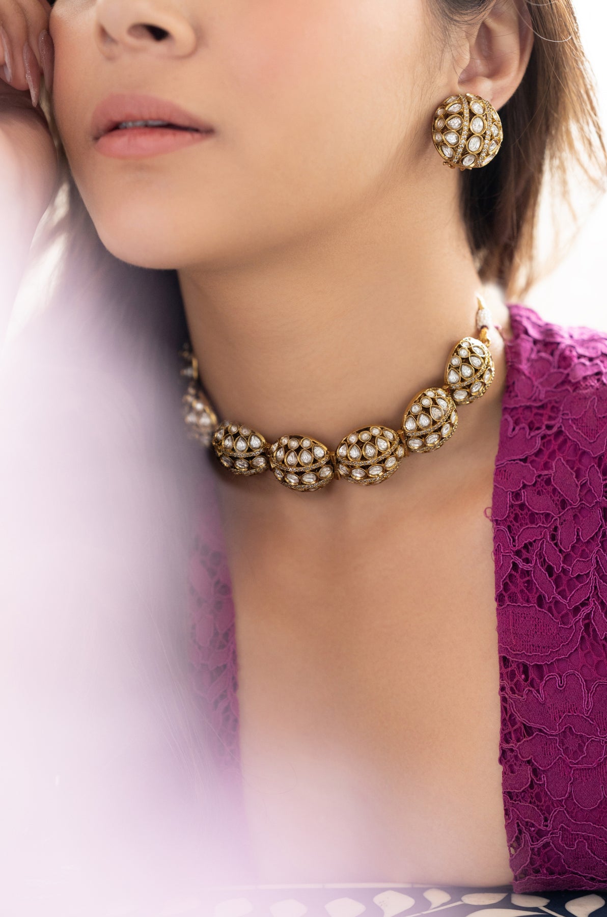 This necklace set exudes striking sophistication. It showcases a series of dome-shaped orbs, each meticulously adorned with sparkling polkis set in an intricate jali pattern. The warm golden base lends a majestic glow, while the clustered arrangement evokes the timeless allure of vintage temple jewelry. Complemented by matching earrings that echo the luxurious globe motif, this ensemble embodies refined elegance.