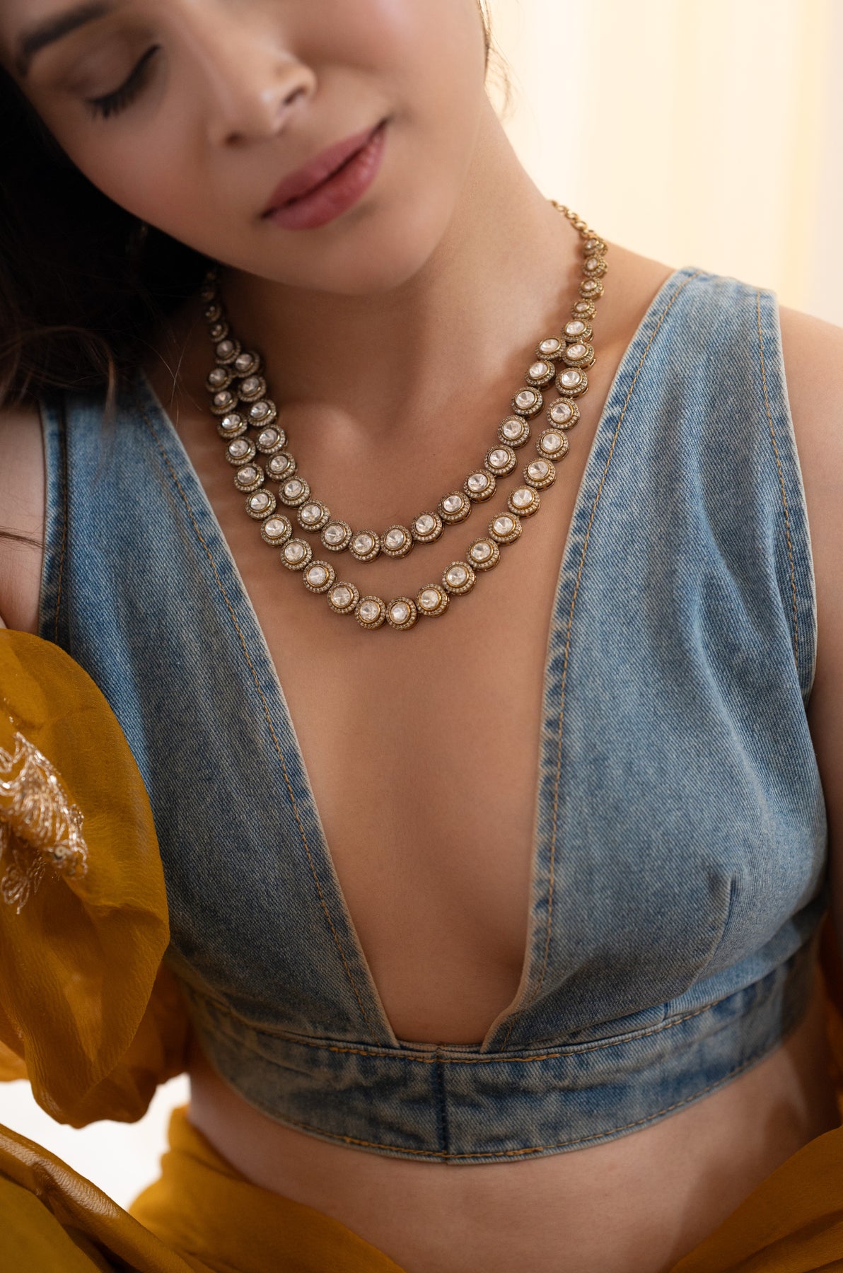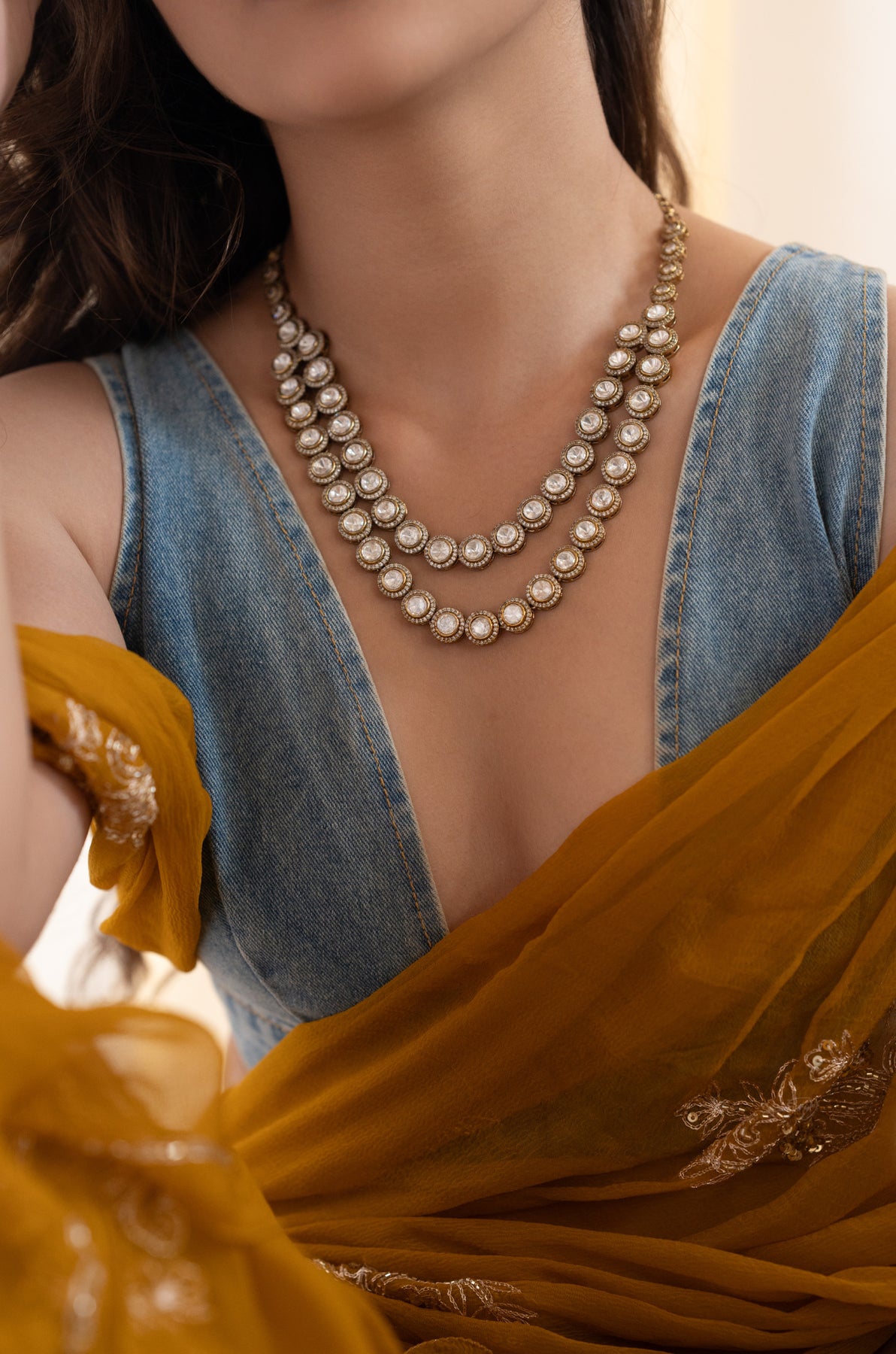 This charming polki necklace features a unique double-layered design with uncut polkis sparkling against gold-toned settings. Paired with matching earrings, it brings timeless charm to any look. Perfect for weddings, festive fun, or adding a royal flair to your night-out outfit with a touch of playful elegance.